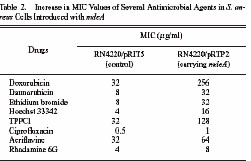 MdeAを大腸菌KAM32の中で増殖させ、20種類の抗生物質のMIC(薬剤感受性)を測定してみた。TABLE1をみると、大腸菌は三つで2〜16倍の大きな変化がで、またTABLE1に記されていないそのほかの17個には大きな変化は見られなかった。以上のことより、MdeA遺伝子は大腸菌KAM32の中のプロモーターとして機能することがわかった。