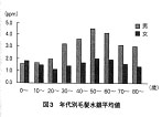各年代の平均水銀値の結果を図3に示した。全体の平均値は男性で2.67ppm(0.11?21.17 ppm)女性で1.54ppm(0.04?13.49 ppm)であった。(ppmとは重さの割合のことで、1/100万をあらわす。すなわち、1ppmとは1kgあたり1mgの水銀を含むことになる。)年代別分布でも女性で低く、特に20代の女性で低い結果であった。毛髪中の水銀は1回のパーマ処理で20?30%低くなることがわかっており、女性の値が低くなる原因のひとつはパーマによるものと推測される。男性壮年期には高い傾向が見られた。毛髪摂取のおりに実施した魚介類の摂取量や種類などのアンケートのけっかともあわせると、20代の女性では魚介類の摂取量が少ないことがわかっており、この年代のメチル水銀値は魚介類の少ないことによると考えられた。また、水銀値が高い男性壮年期では魚の摂取量が多く、特に大型の摂取量が多かった。男女の最高値を示した例の魚介類摂取状況を表2に示したが大型魚の摂取量が多いことが明らかとなった。