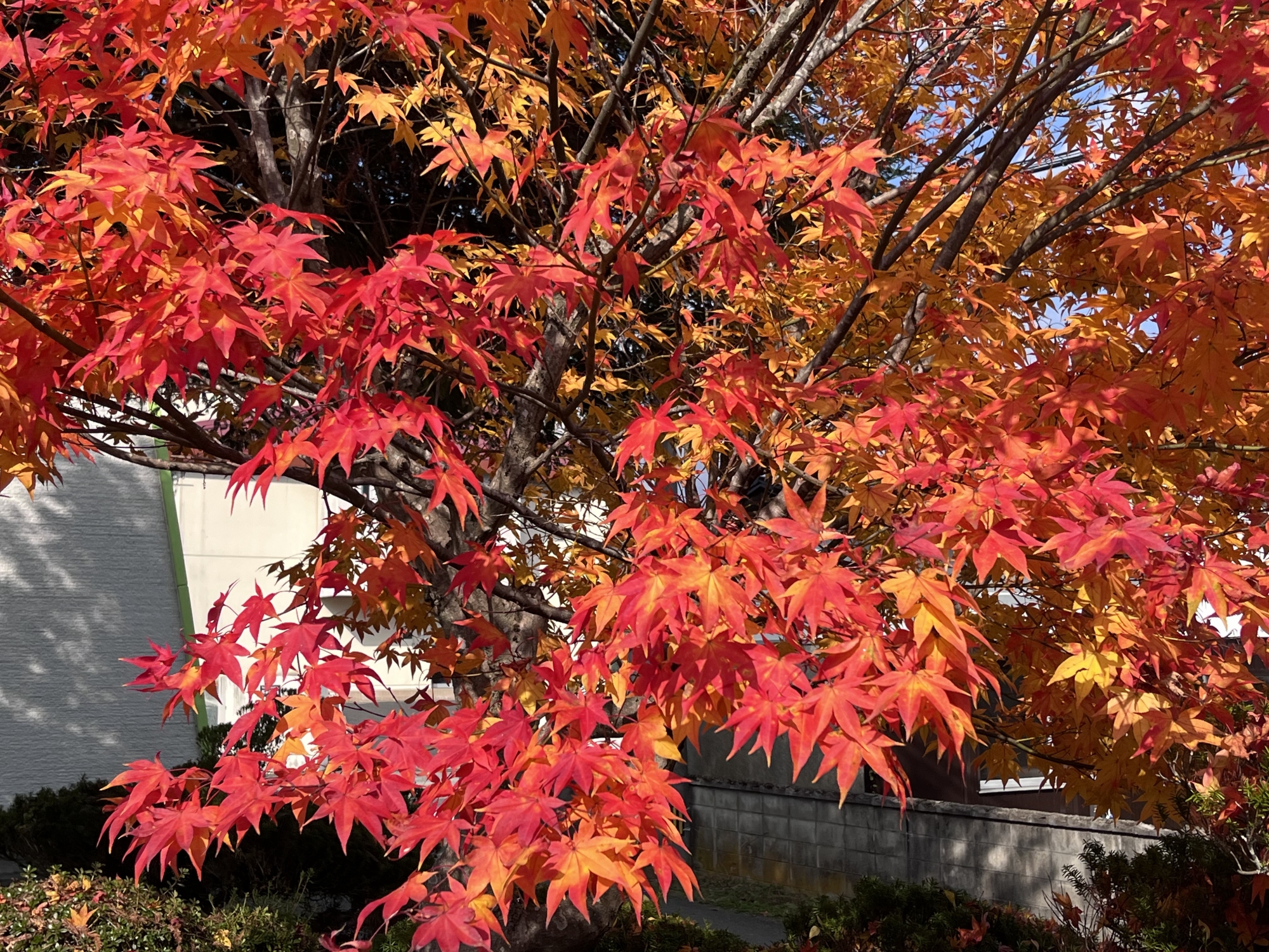 さて、昼から……診療所横もかなり散っていて……歴史民俗資料館の横で、ドウダンツツジと紅葉.