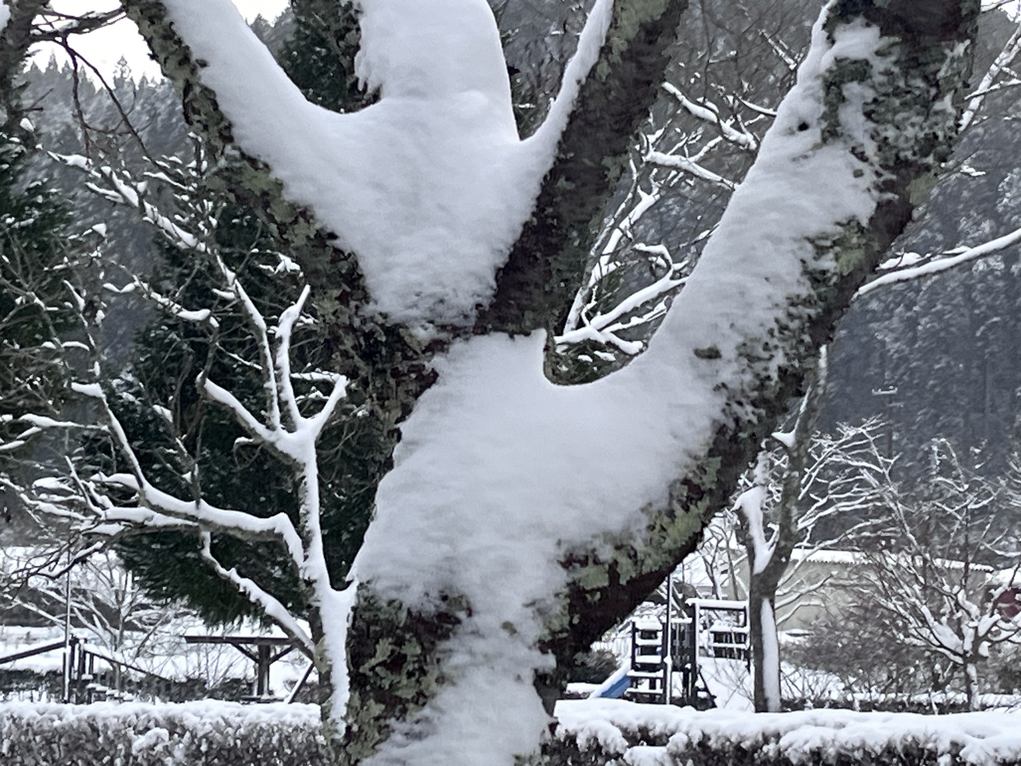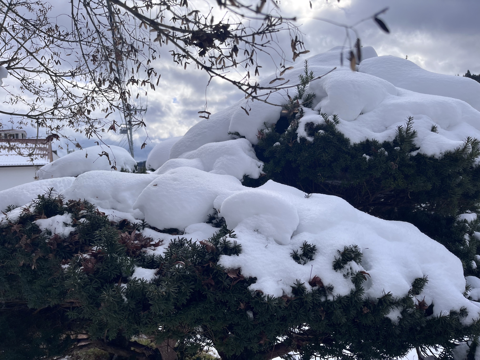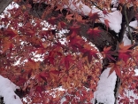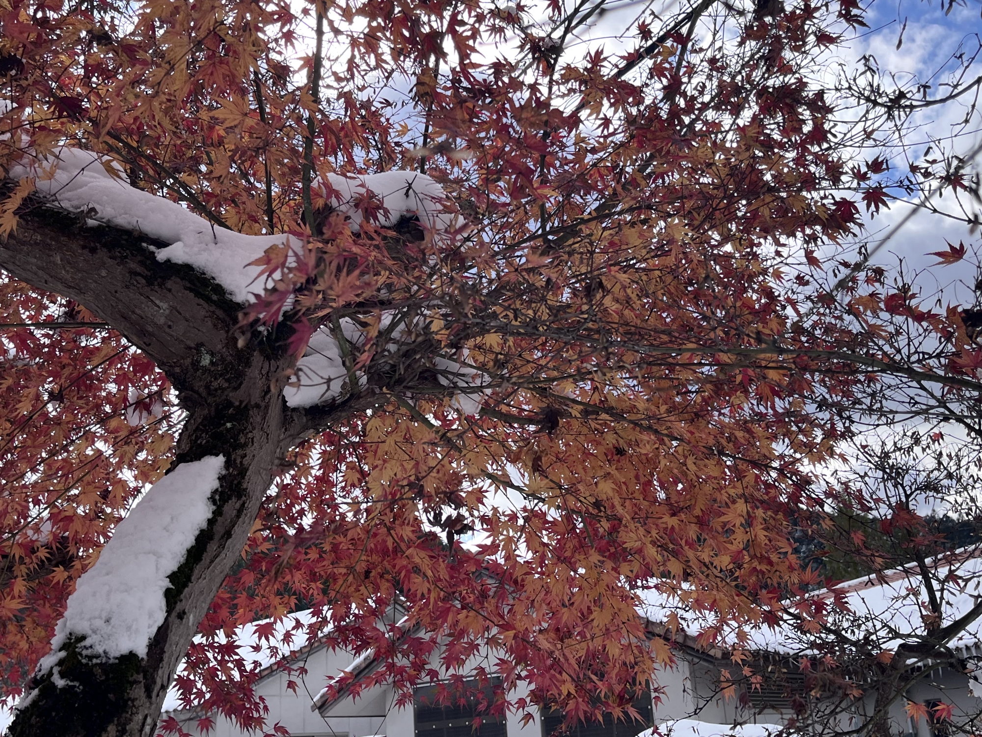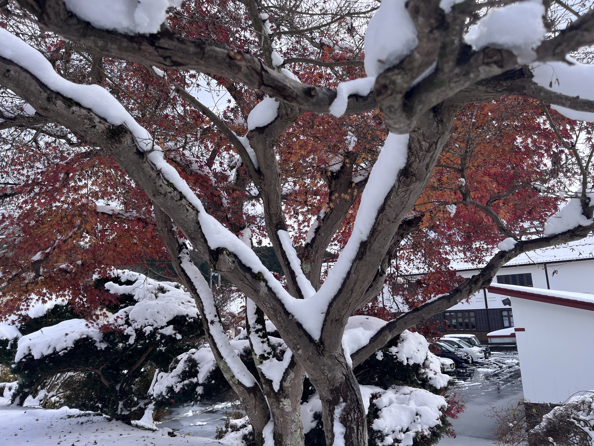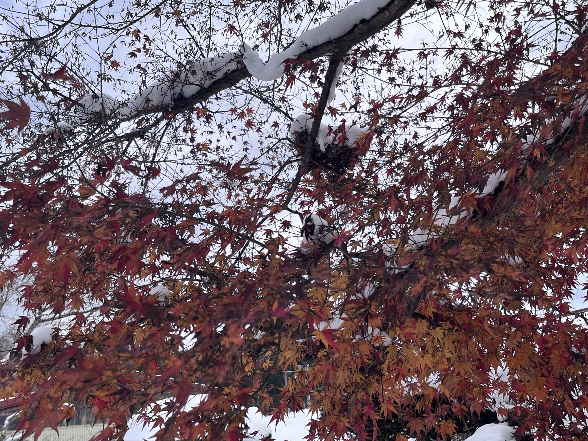 さて、昼は郵便局へ……名残りの紅葉にも雪が積もっていました.
