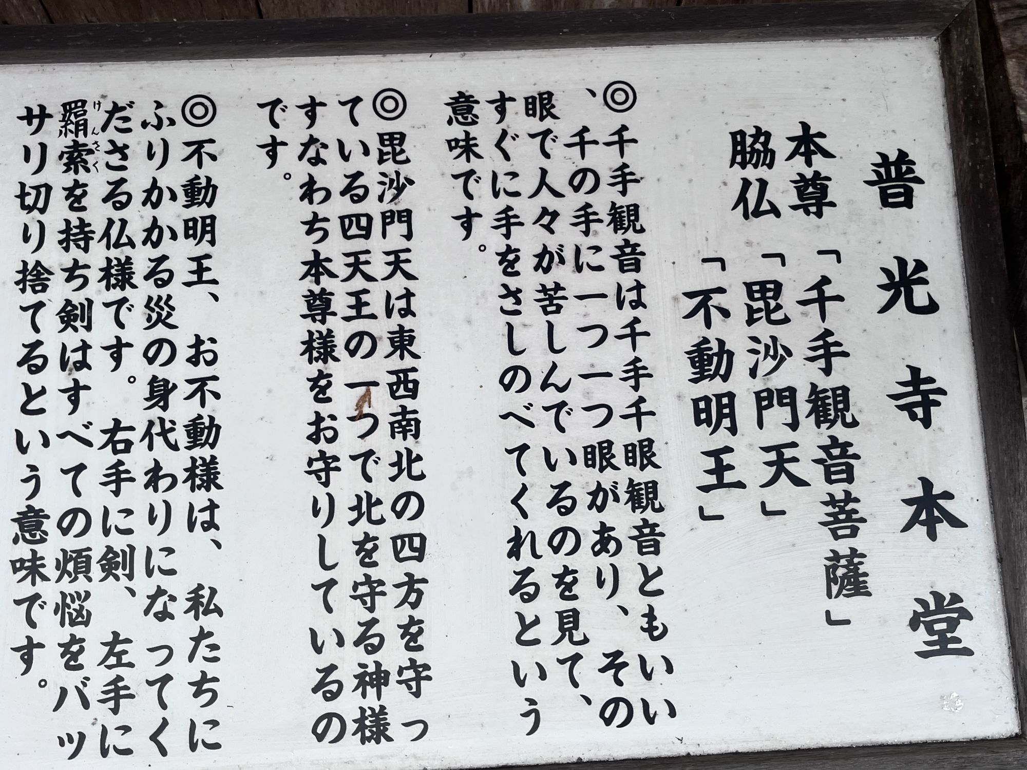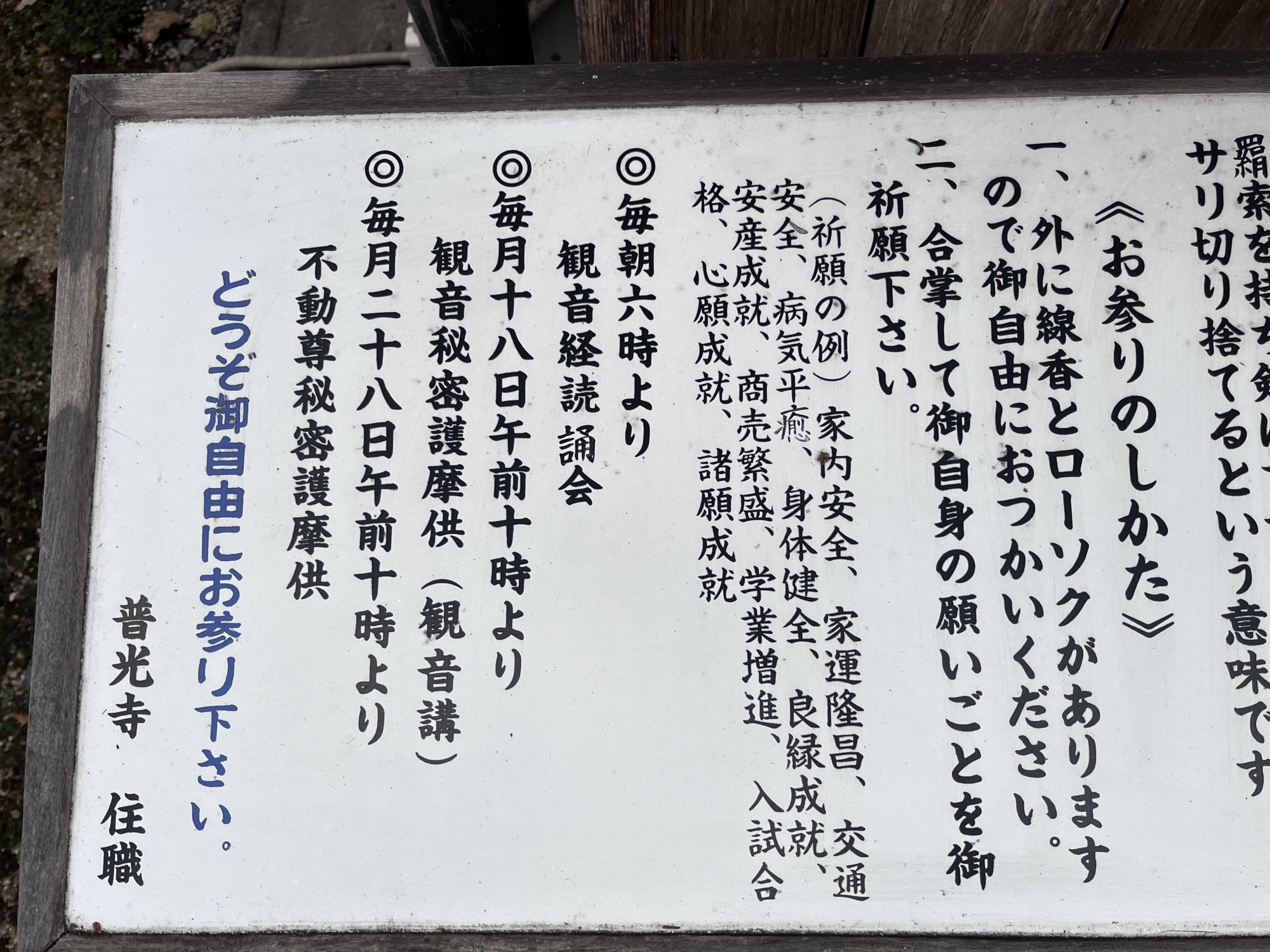 【このとき欅の古木に白雲が覆い、一条の光明が放つを見た。行基菩薩は大いに歓喜し、これは我が有縁の地であると悟り、彼の古木をもって観世音菩薩像を刻み、一寺を建立して白雲山普光寺と号したのが創まりという。】