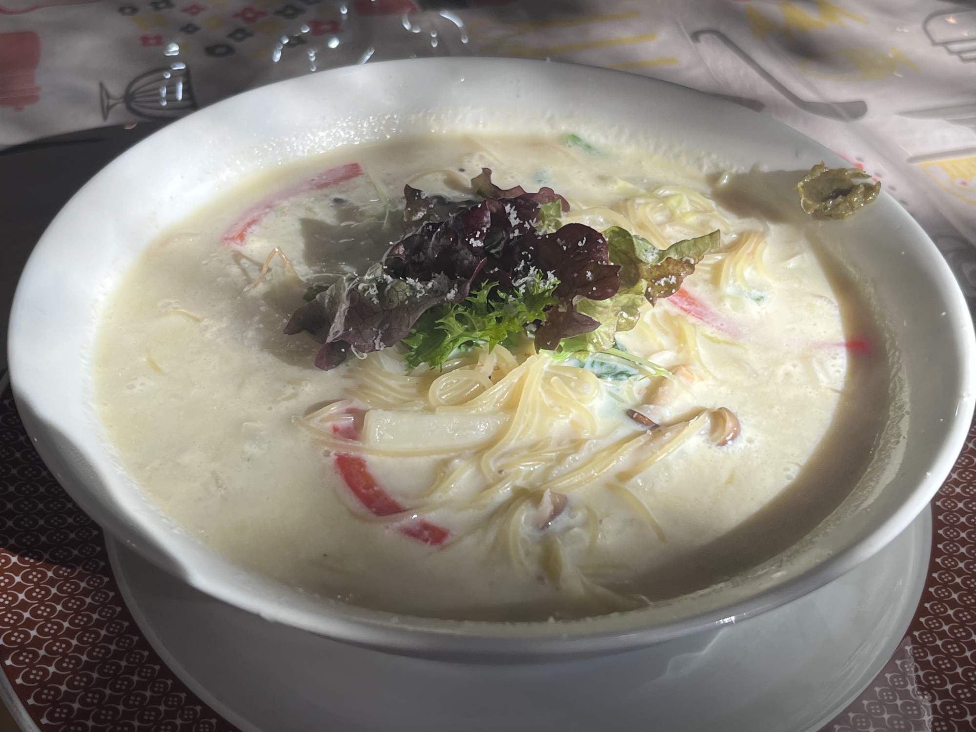 今日は、豆乳スープパスタ……なんだか、お腹いっぱい.