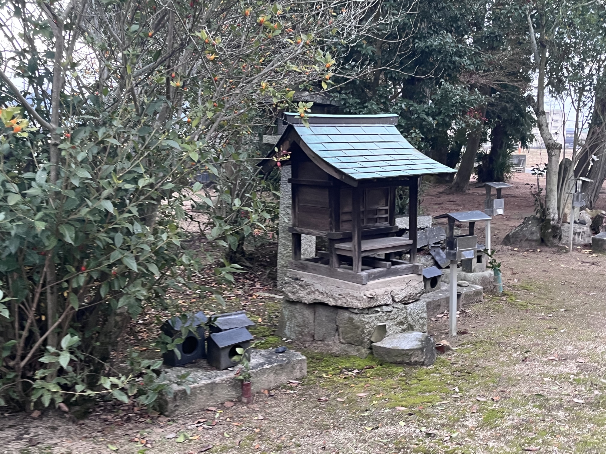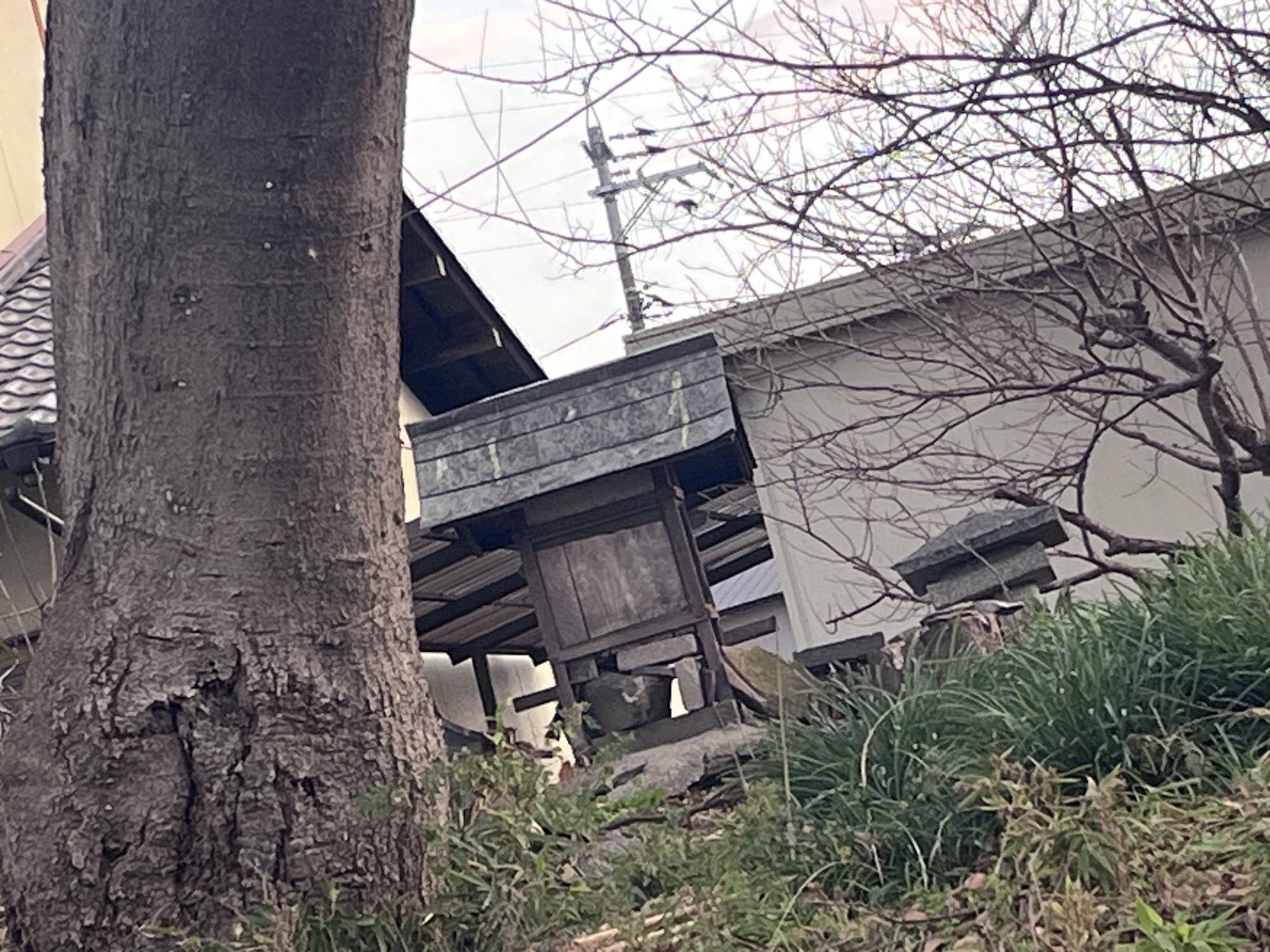 近くの住居の裏手に祠……そして、遠くに加茂神社.