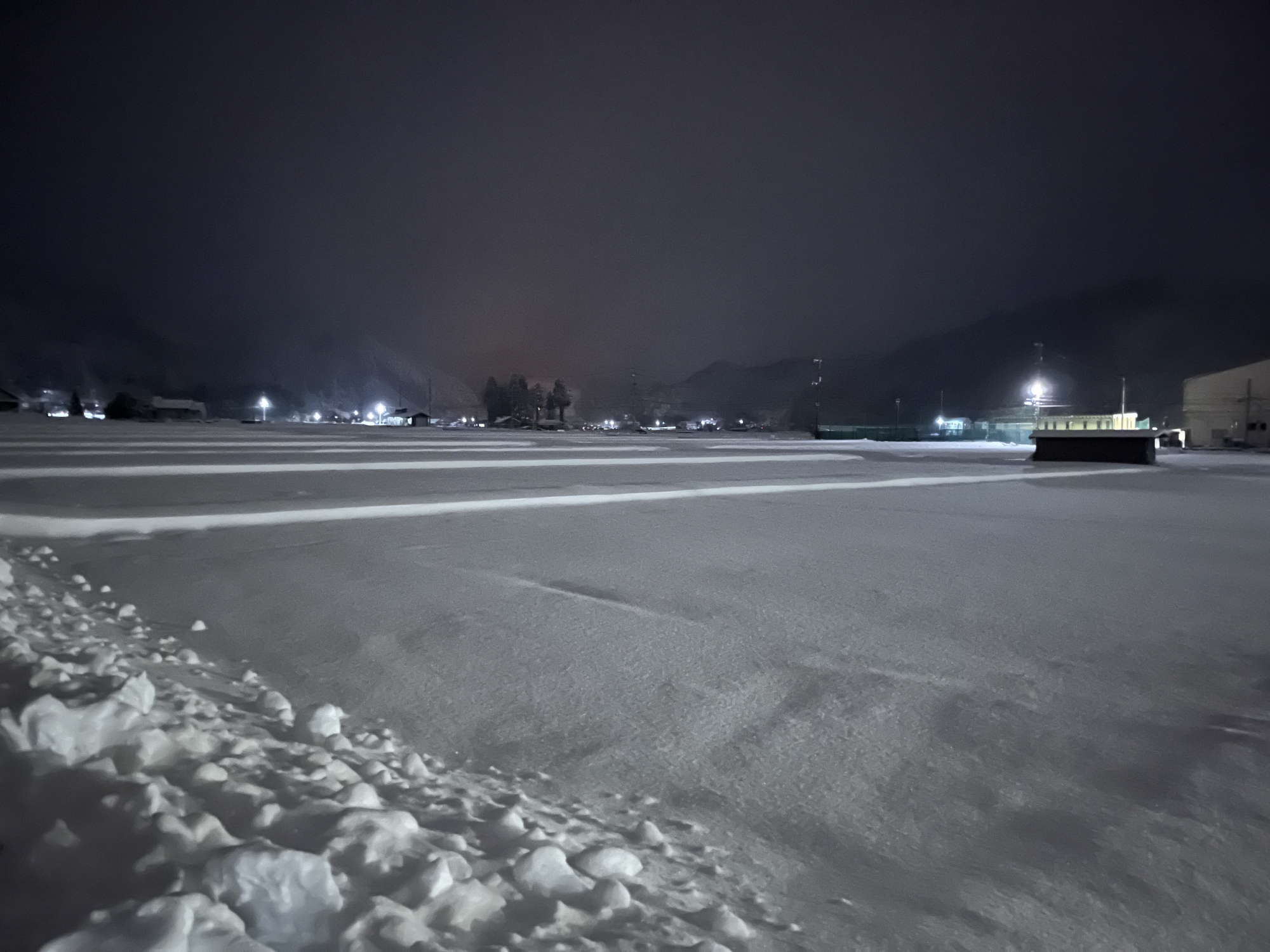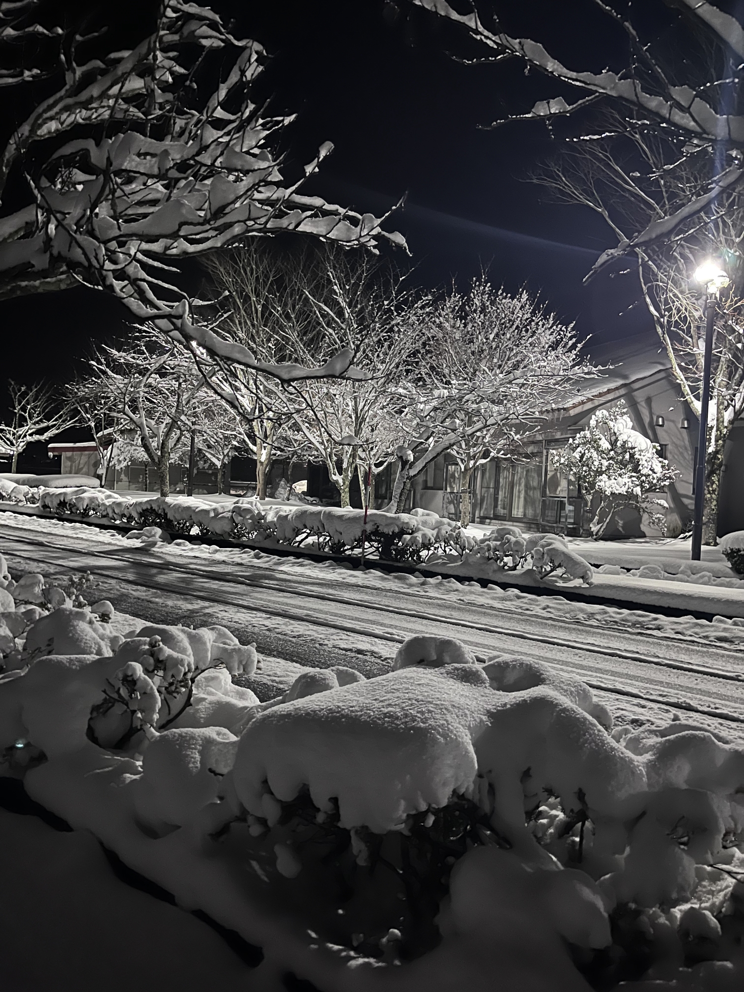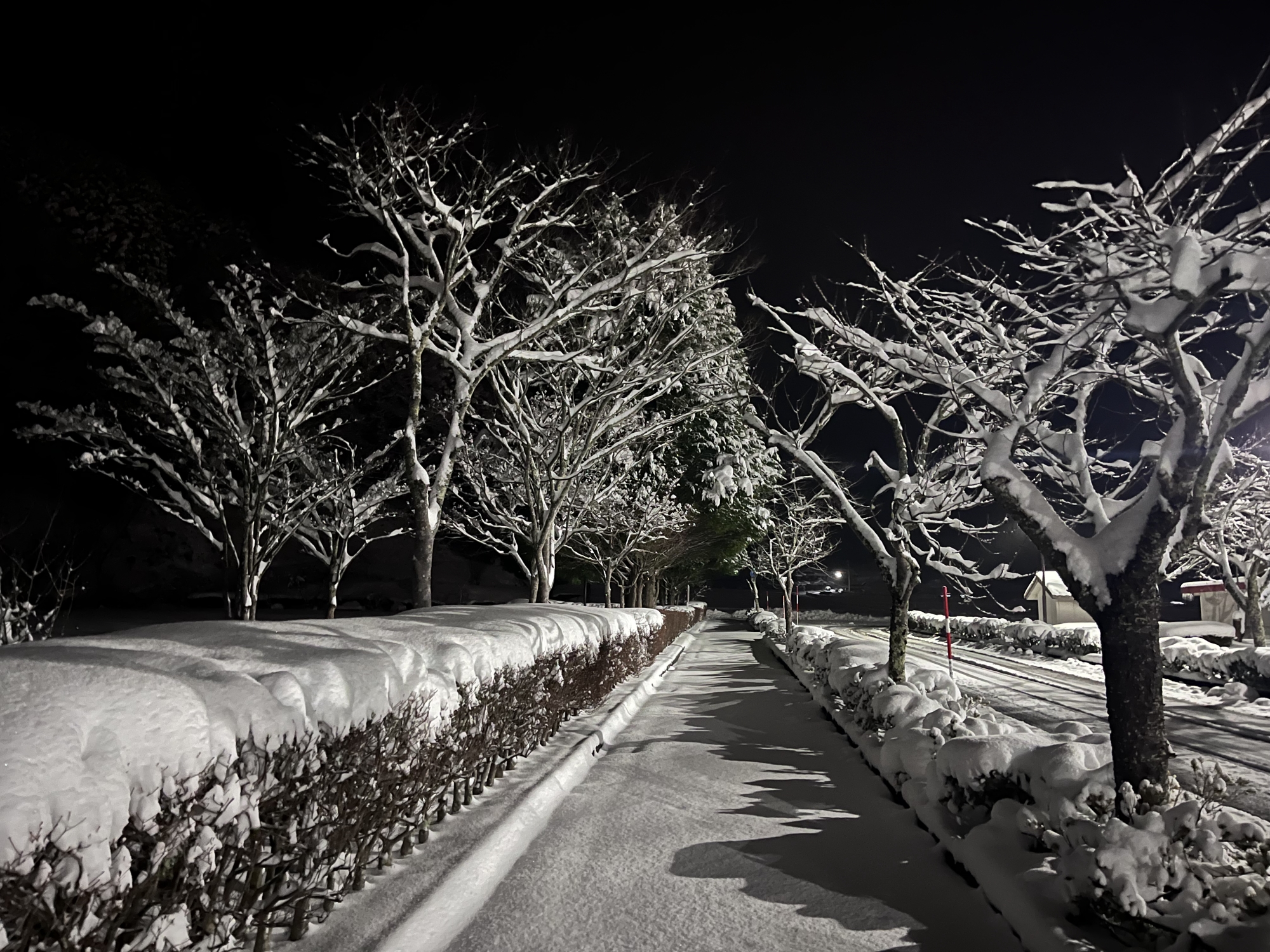 で、夜……振りも落ち着いてきて……街灯に雪乃ふれあい公園や並木道が美しい.
