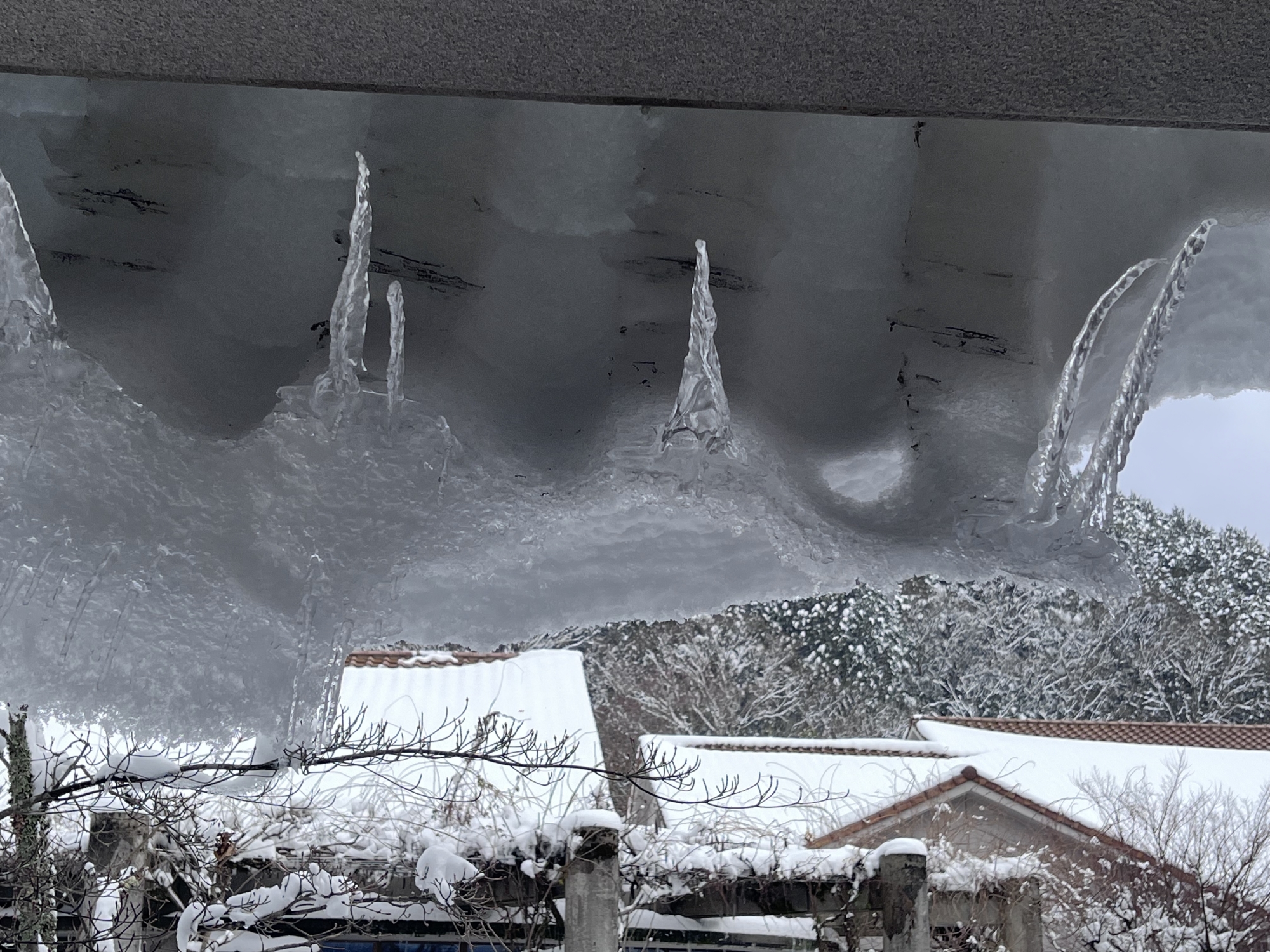 屋根の雪が落ちそうで、落ちない.