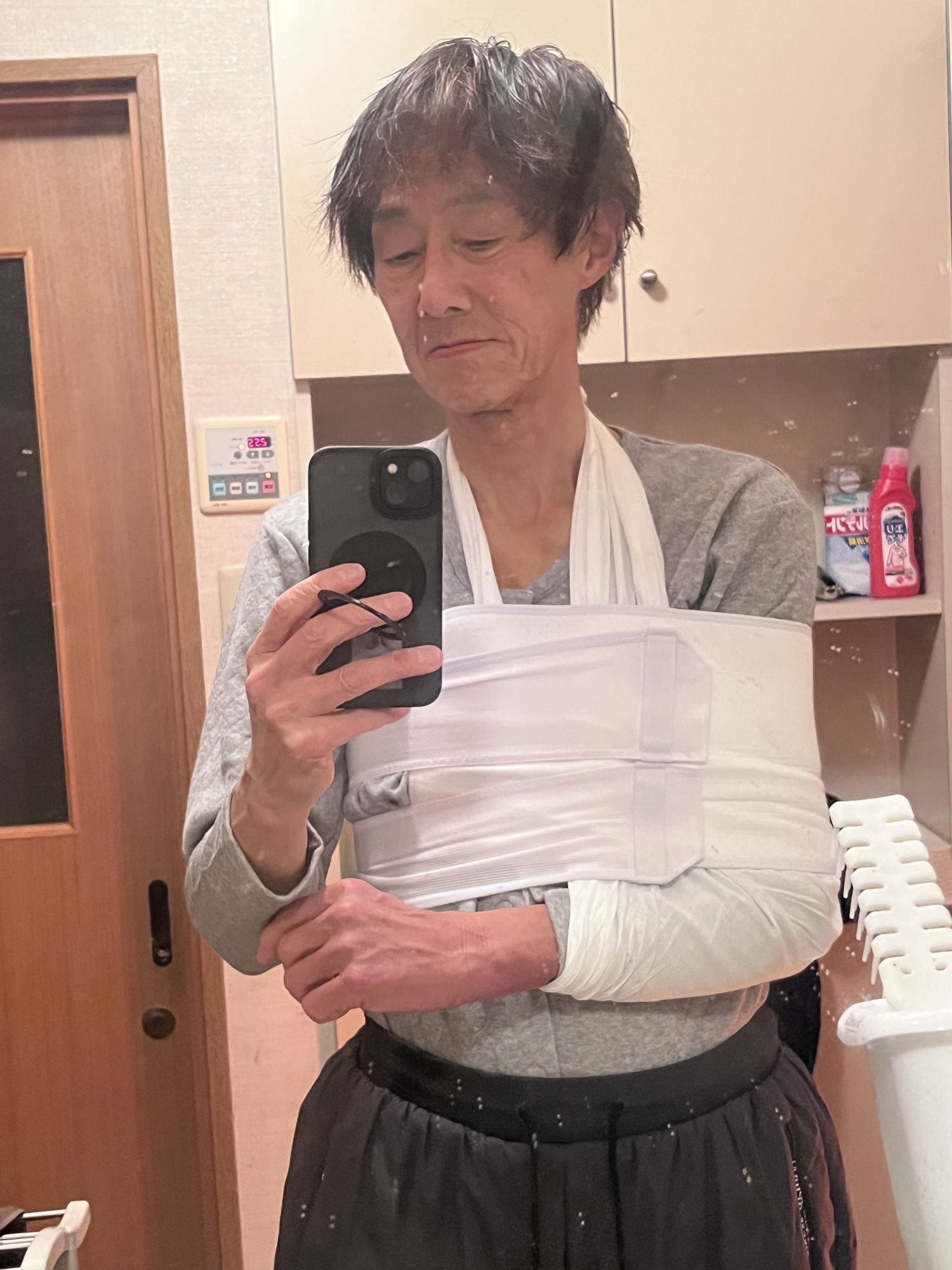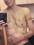 受傷から8日目……下着のLongTシャツはずっとそのままだったけど、痒くなったりもしてきて、また、右手首の先の動きや軽くもつ作業でも上腕の筋肉の痛みが軽減してきたし、さらに、外傷はないはずなのと、介護用の前開きマジックてーっぷのシャツも届いたので、入浴しようと脱いでいたら……皮下出血の跡が、なかなか派手派手感強い!!! 三角巾とバストバンドも対応できた.