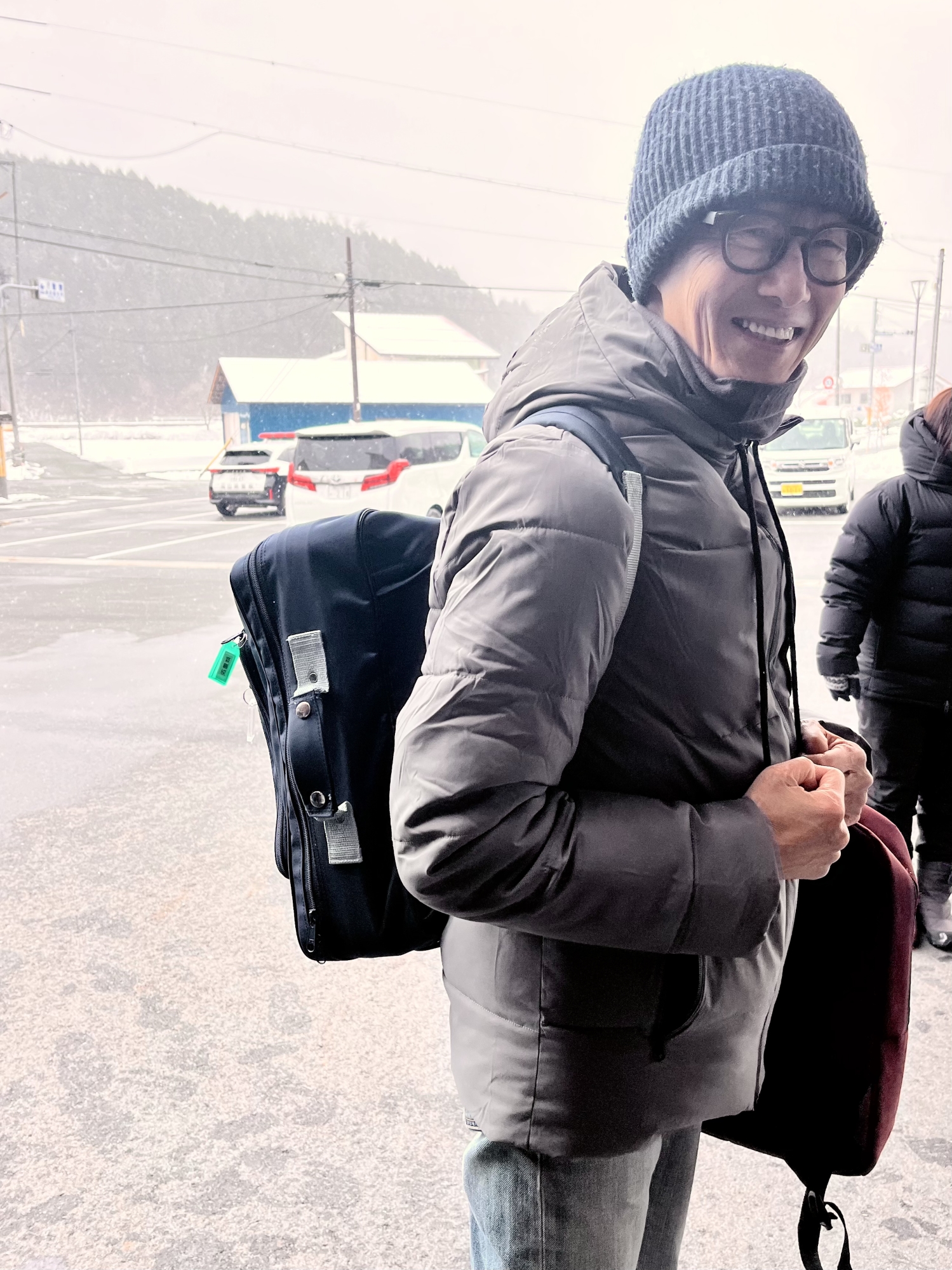 加えて、滑りやすい路面なので……一応、往診カバンを背負って、テープその他をカバンに入れて.