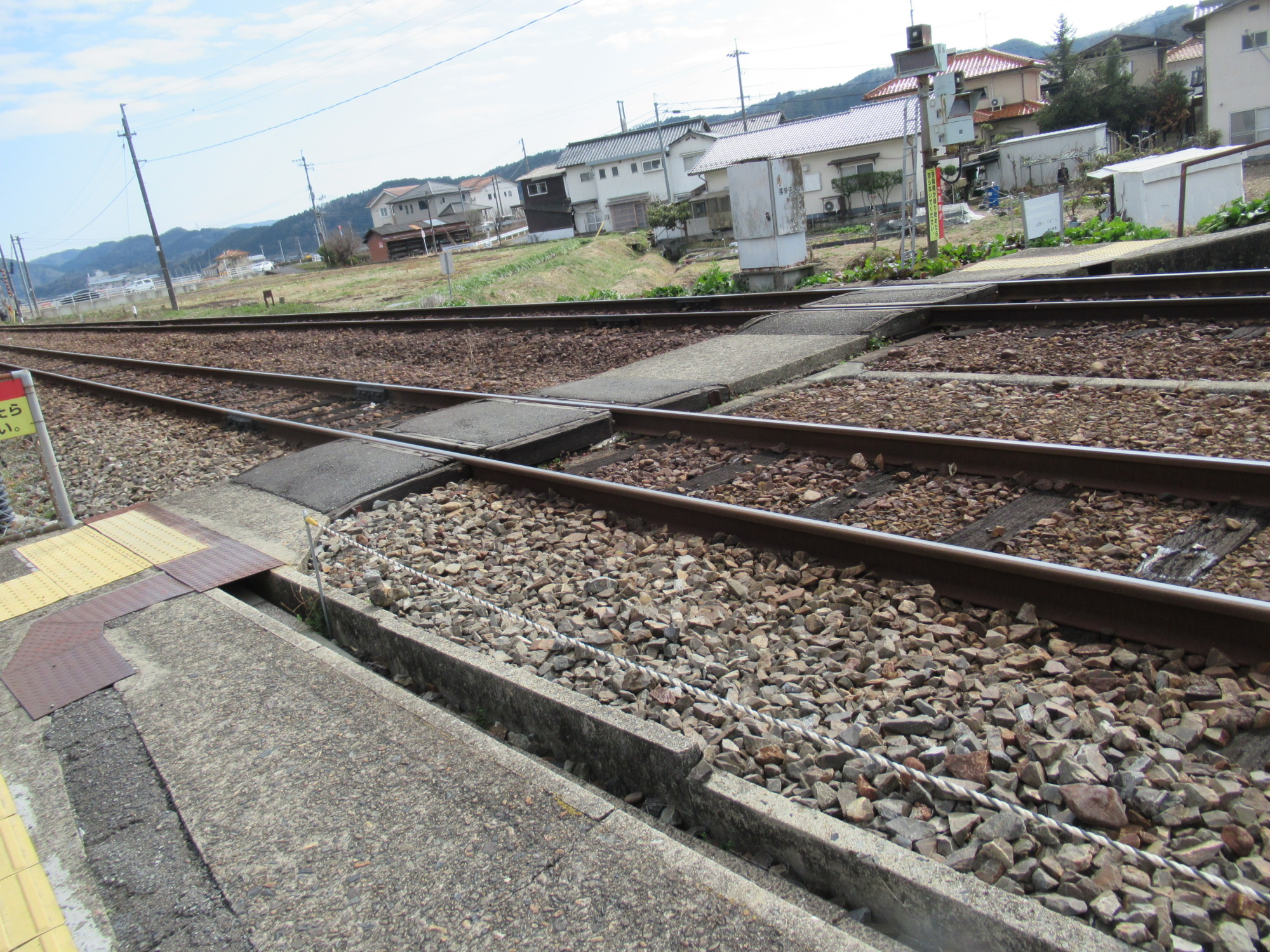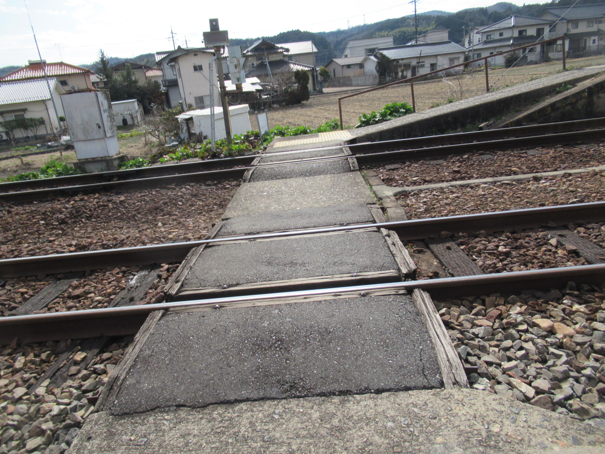 なんと、津山行のホームへは、渡り廊下ではなく、線路面を横切る感じでした.