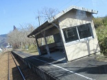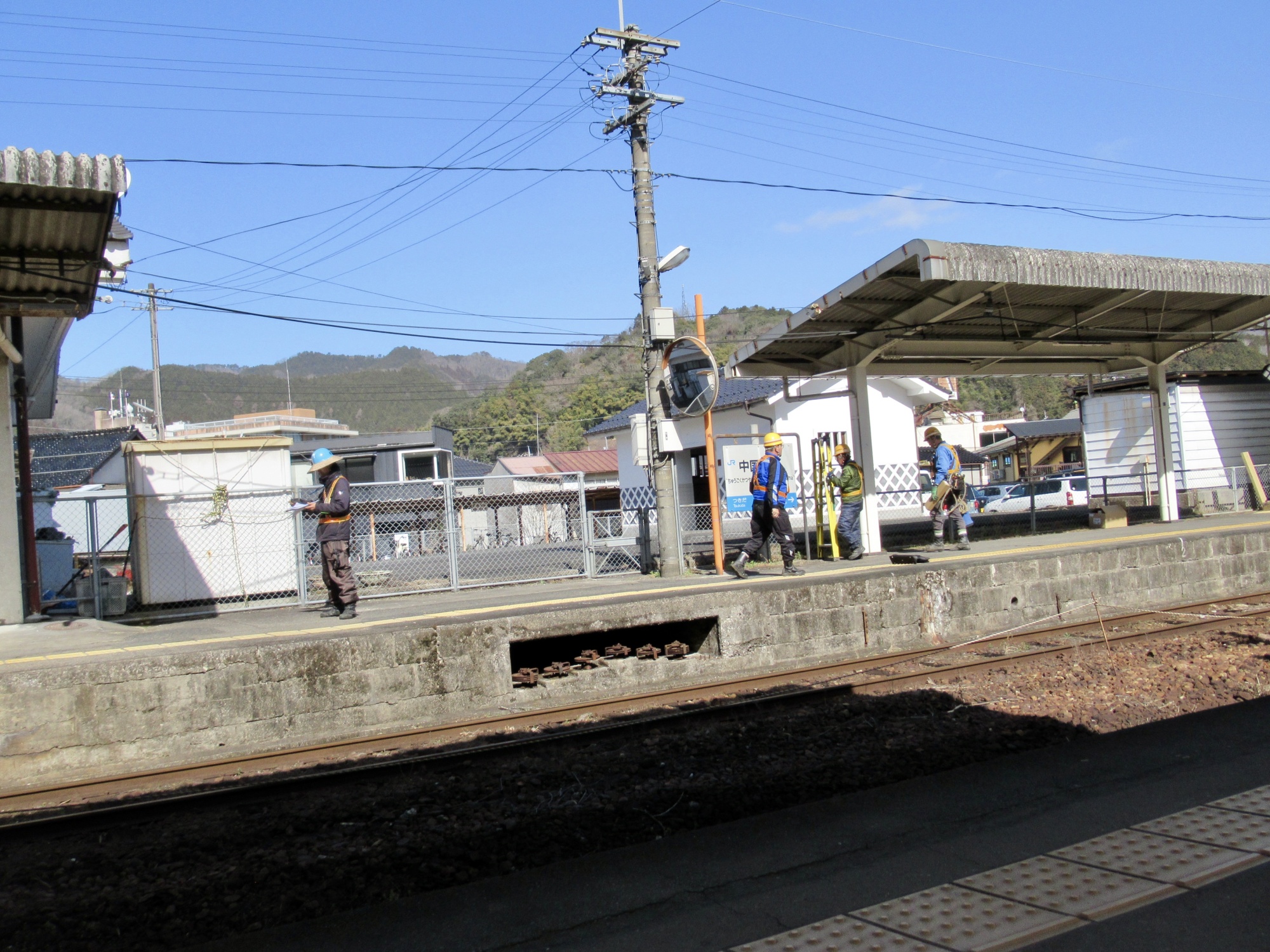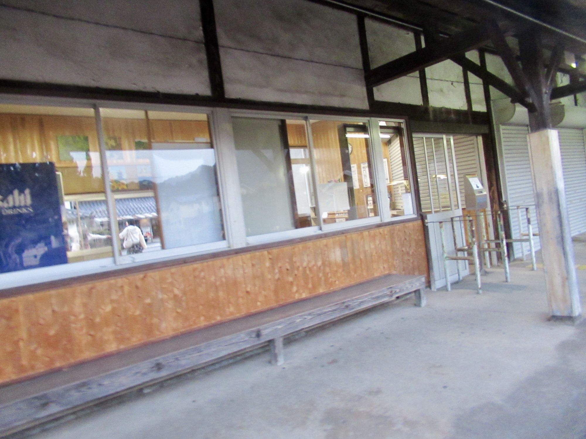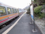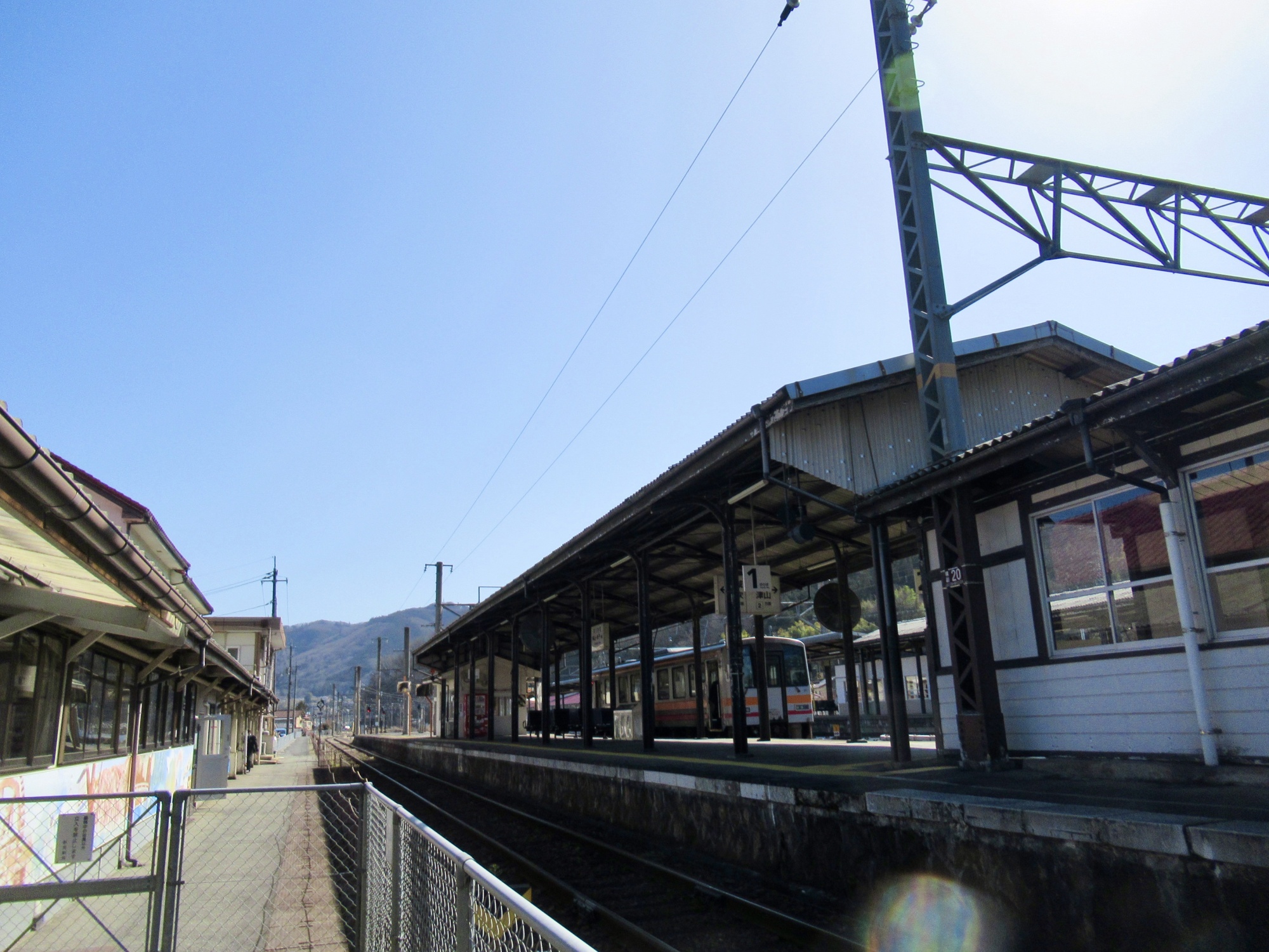 中国勝山駅、姫新線は単線なので、すれ違いは、複線になっている駅で.上り津山行と下りの新見行が、次々と到着して、同時に発車でした.