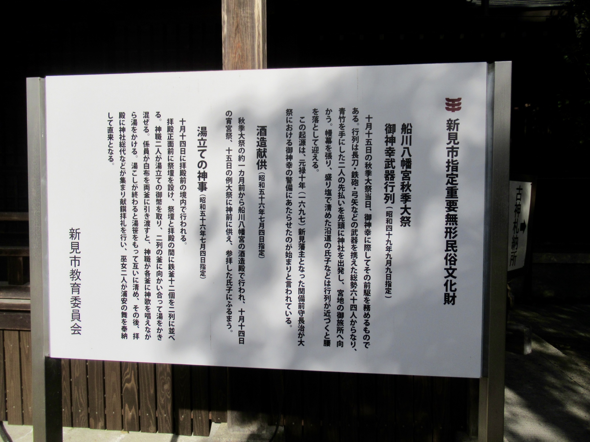 【明治4年9月国家管理に移行され、「郷社舩川八幡神社」となり、同40年1月27日神饌幣帛料供進神社に指定された。】