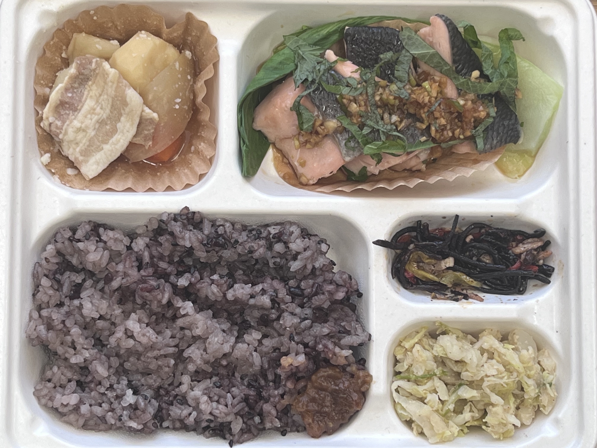 村の配食弁当のお世話になってます.昨日(2/20)、十回目,おお、ちょっとヘルシーな、これはお魚の練り物、さらに、おいもが美味しかったのですよ.いえ〜ぃ.🧡