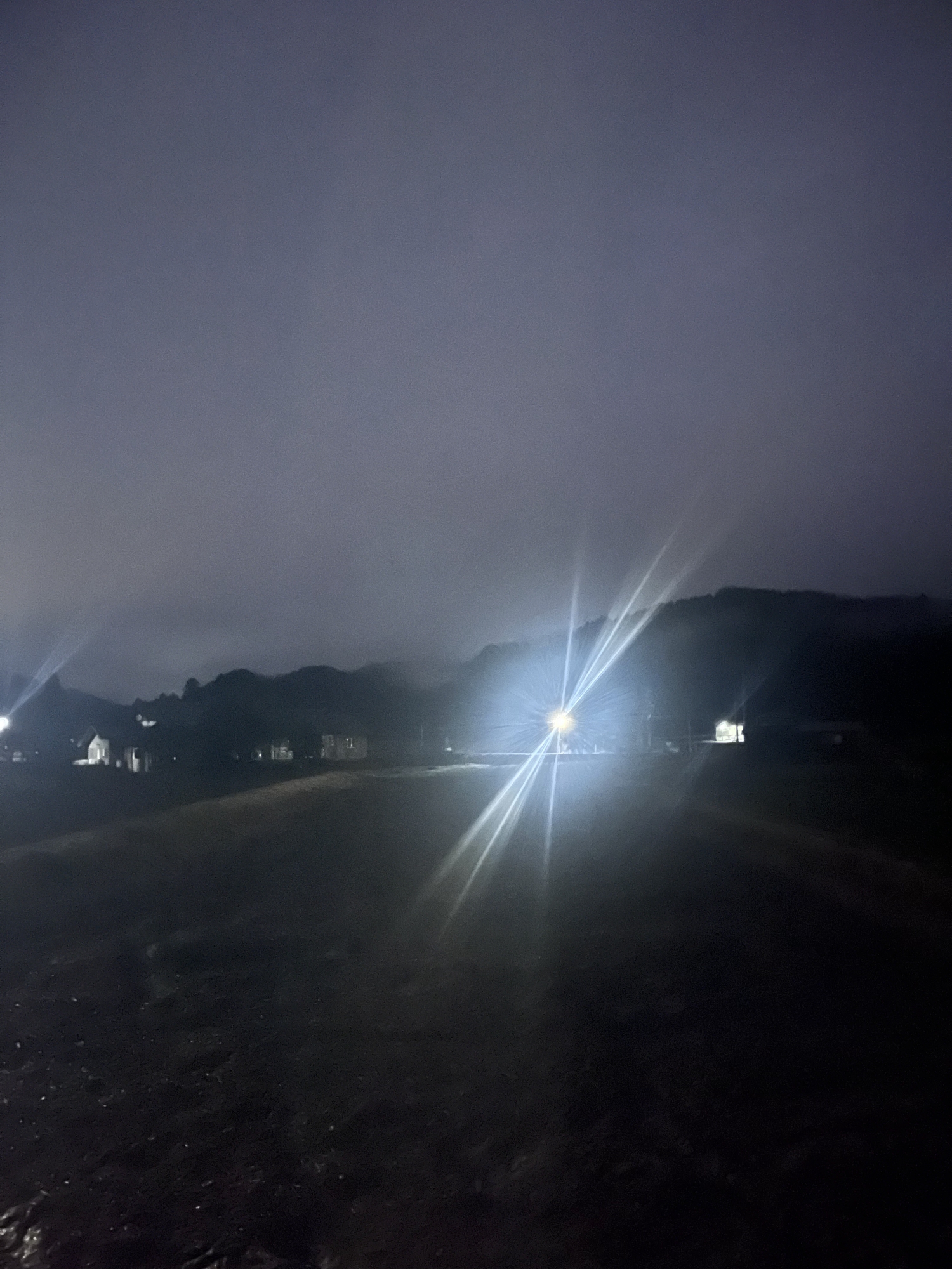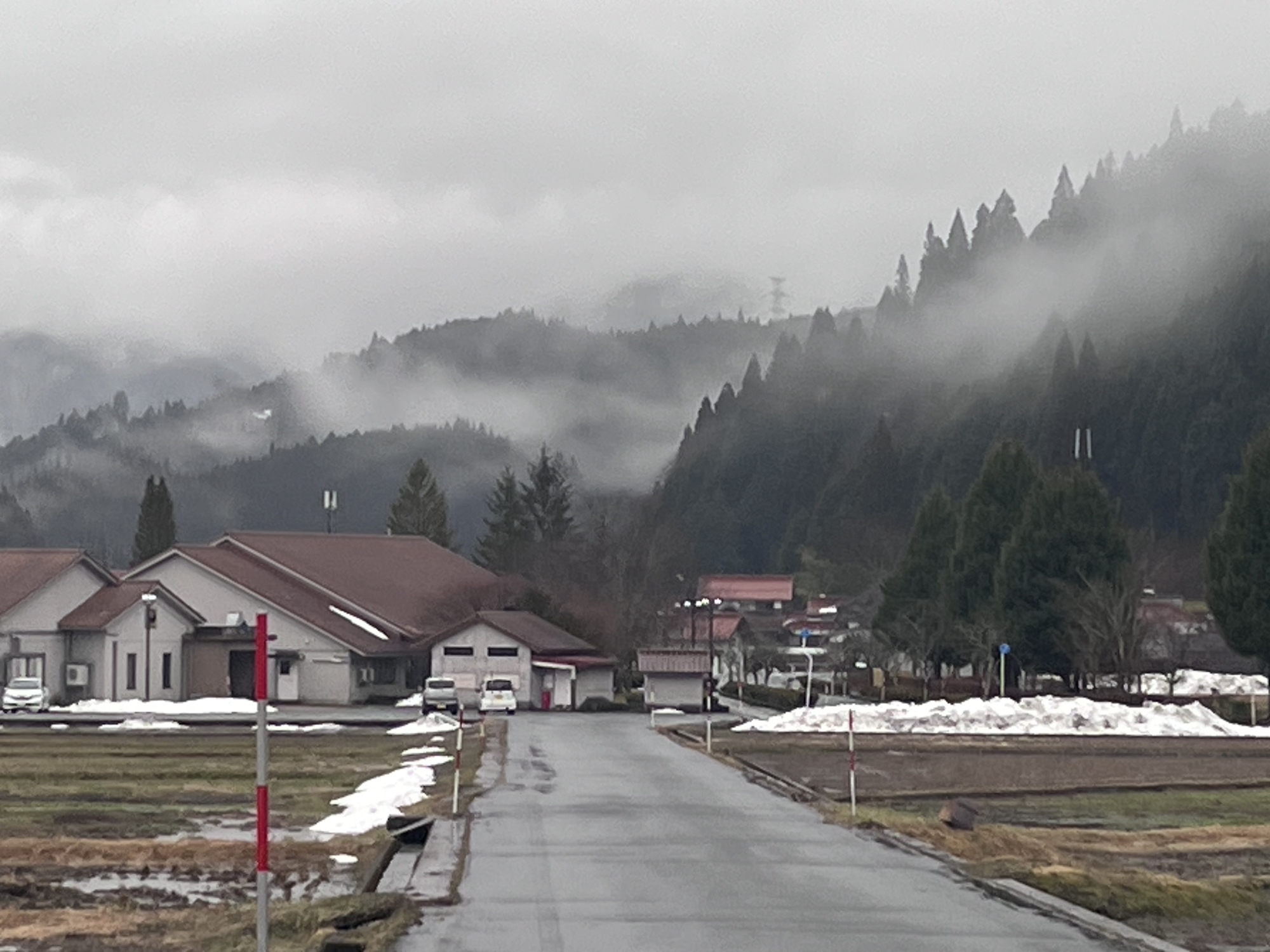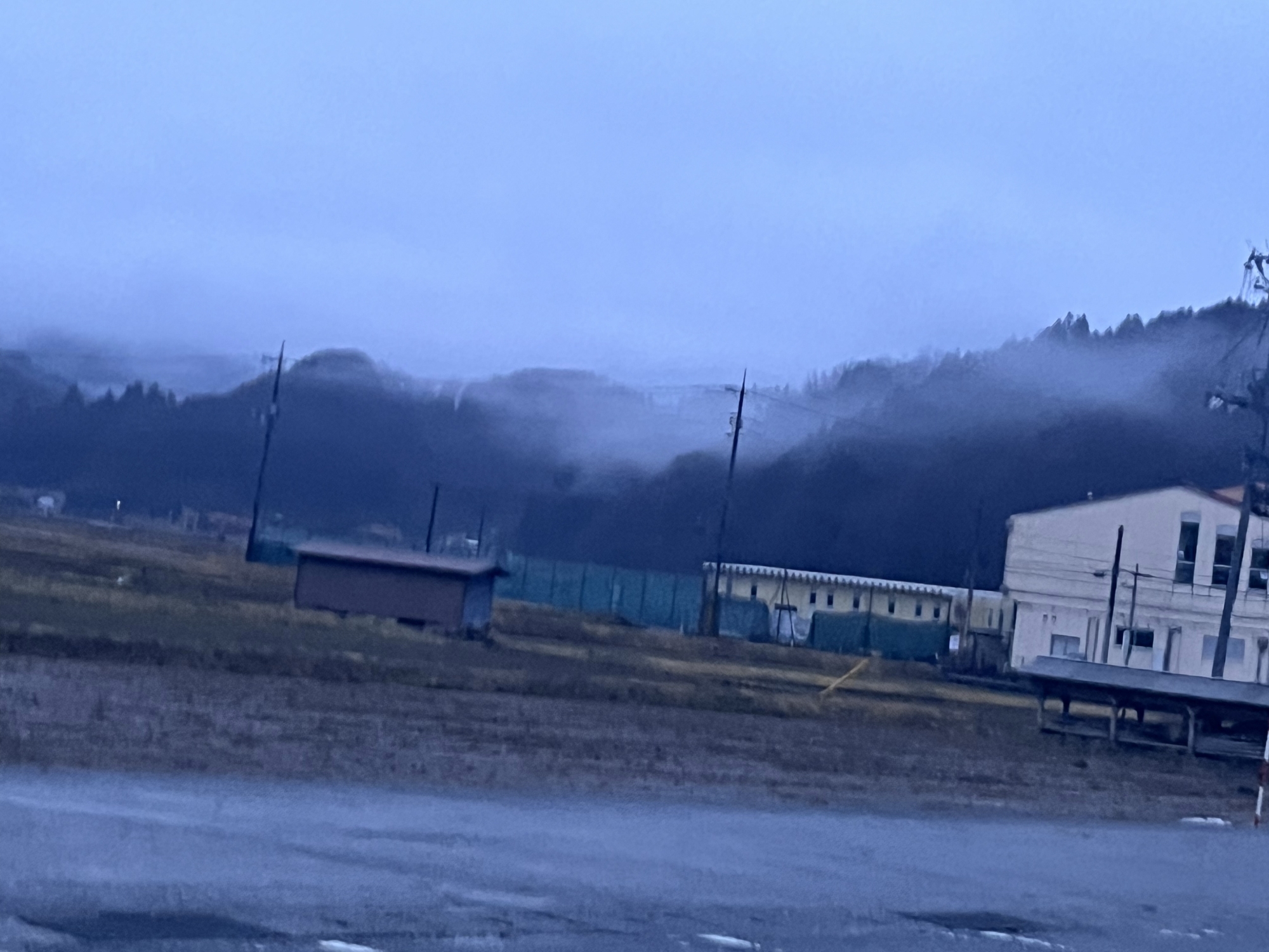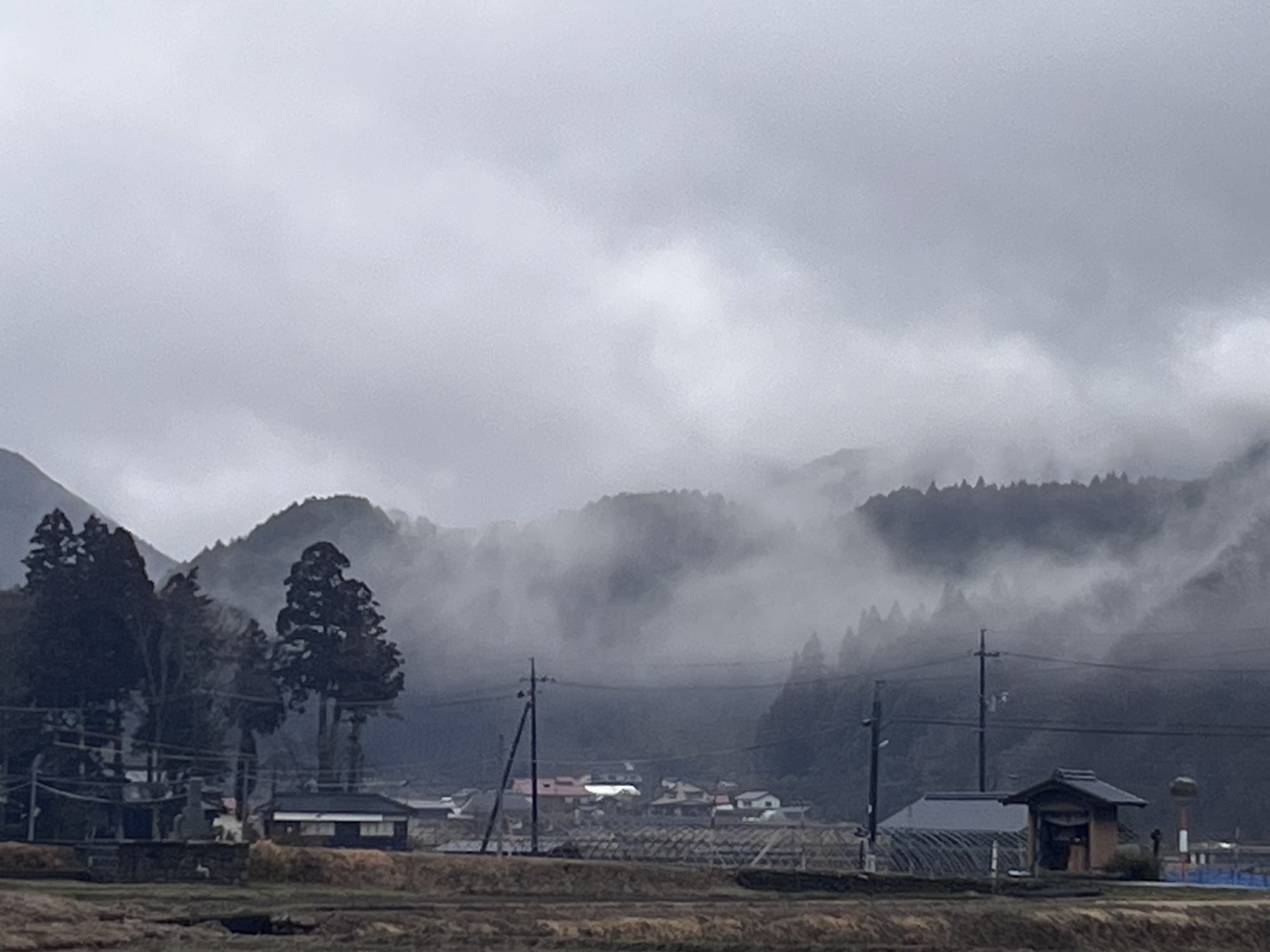 さて、帰り道……雨はほぼ已みそうだけど.低い雲.