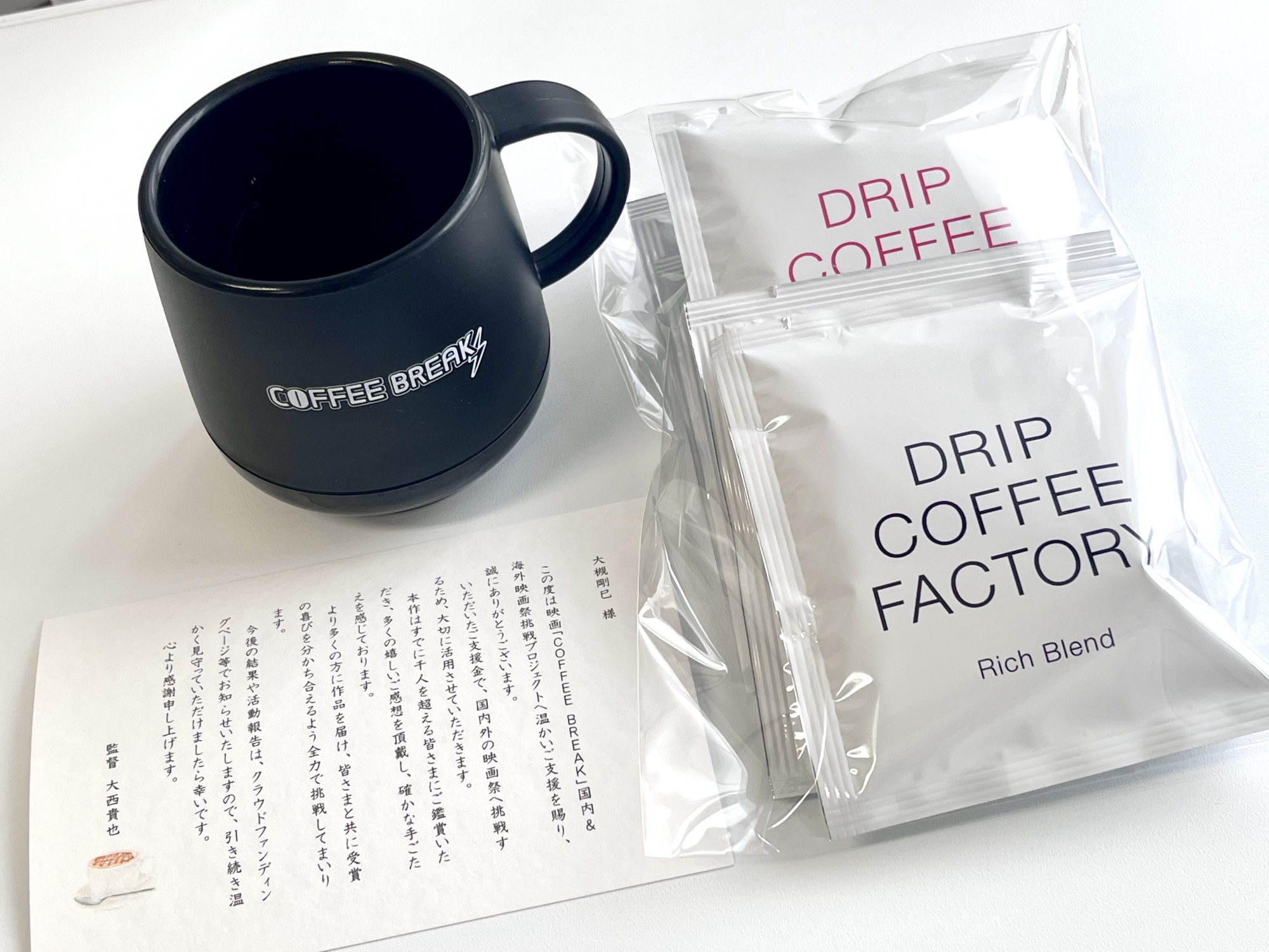 大西貴也監督より、COFFEE BREAKのクラファンの返礼品が届きました.マグカップと珈琲.thank you です.