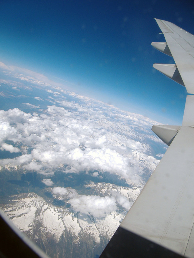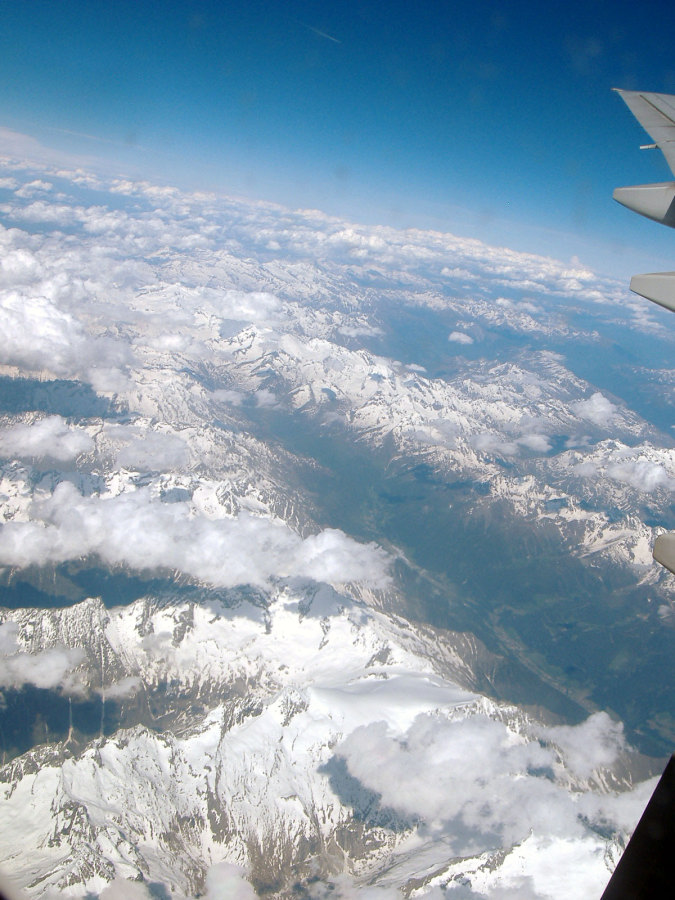 往きの飛行機は,関空〜ミラノ直行便で,ロシアの上を跨いできました。ポーランドの辺りから,ドイツ上空に入って,アルプスを越えました。なんとなく,雪模様のアルプス連山が見えました。