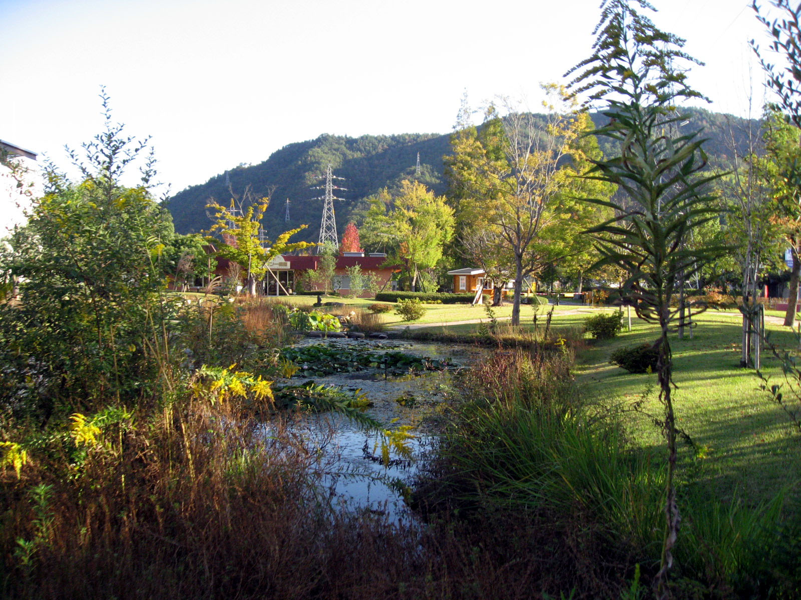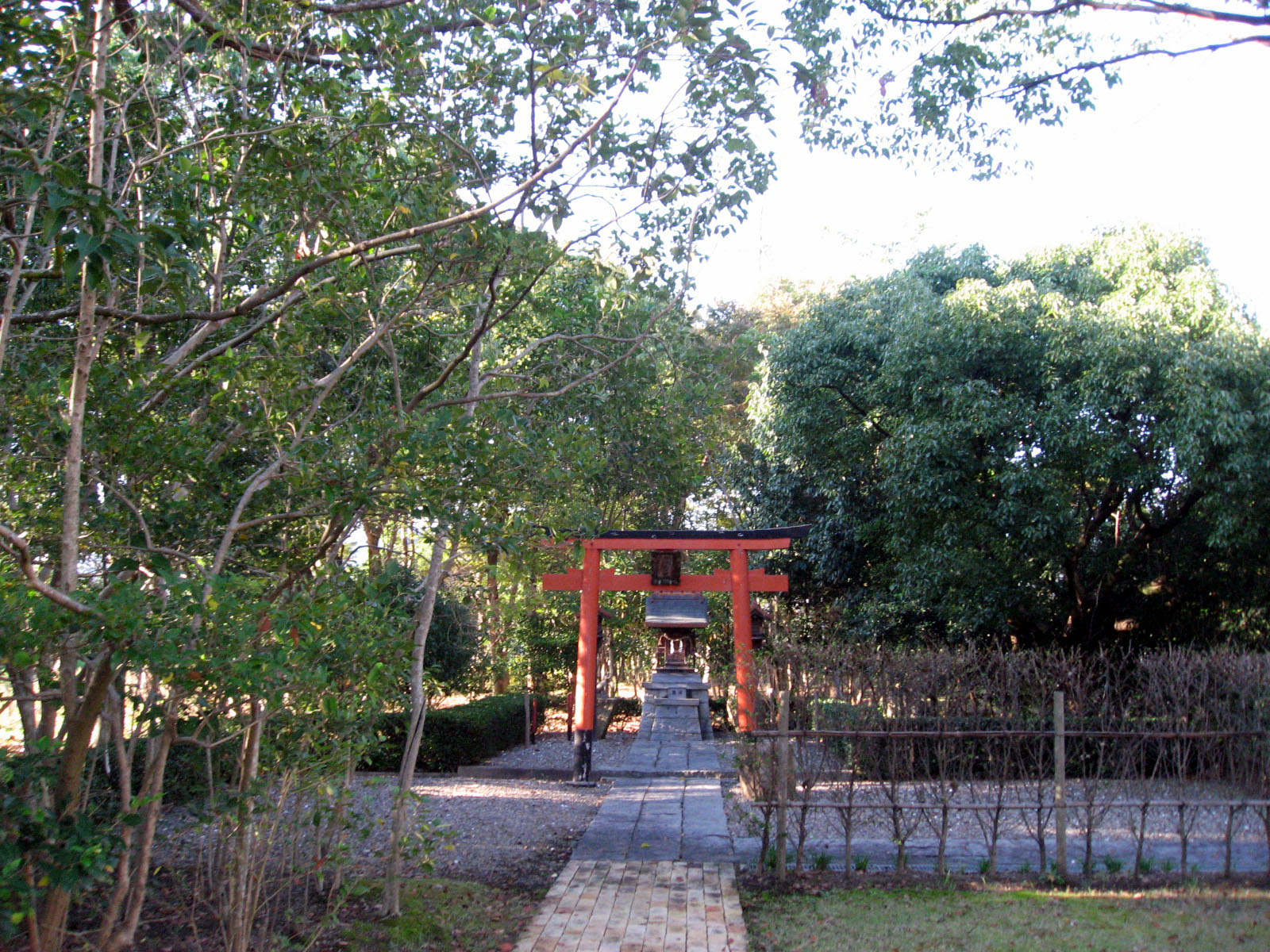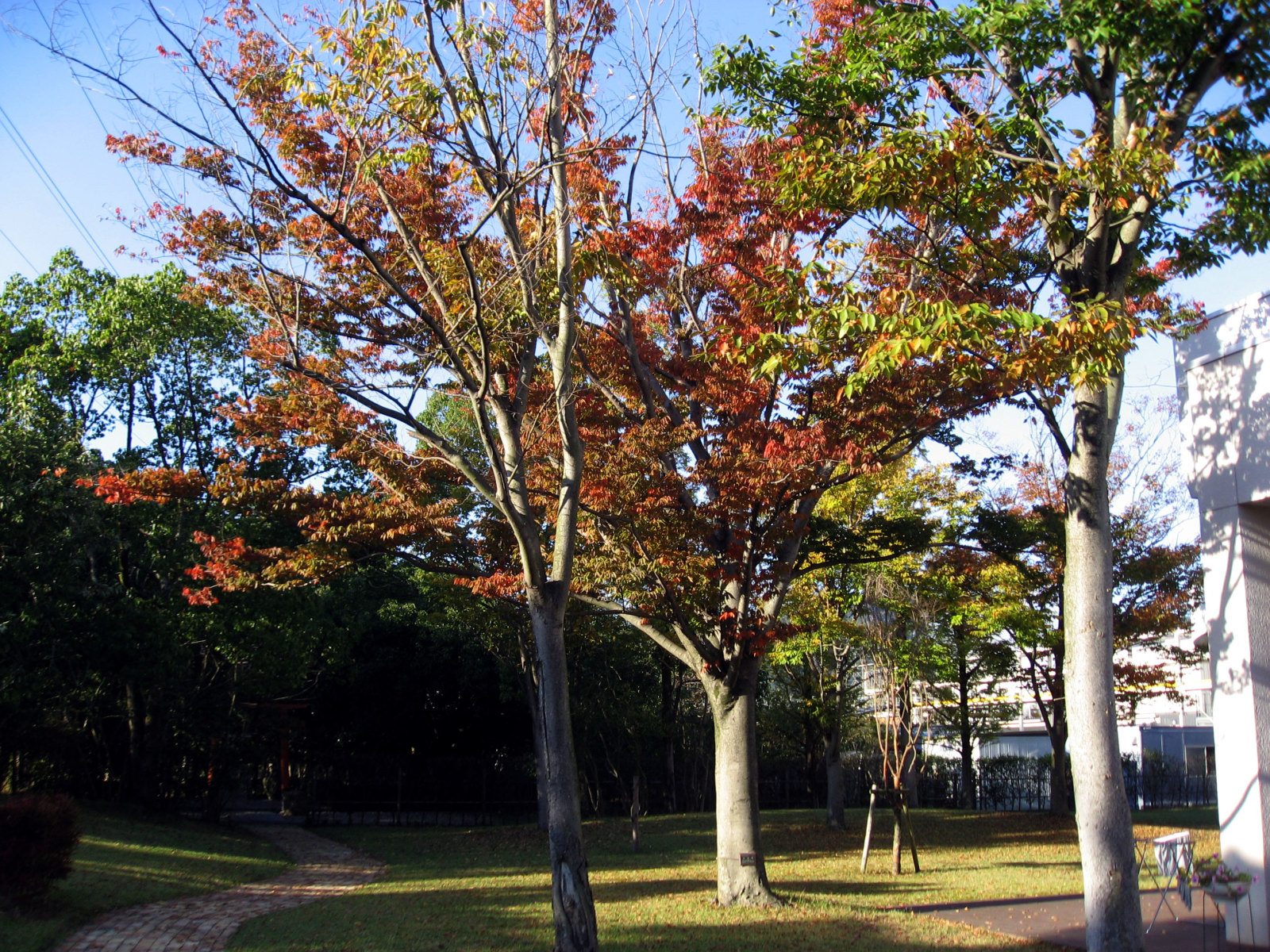 | 庭にはビオトープや神社もありました・・・ 全体的に彩りが秋色で・・この日の青い空と合わさって・・・気持ちを清々しくしてくれました。 |