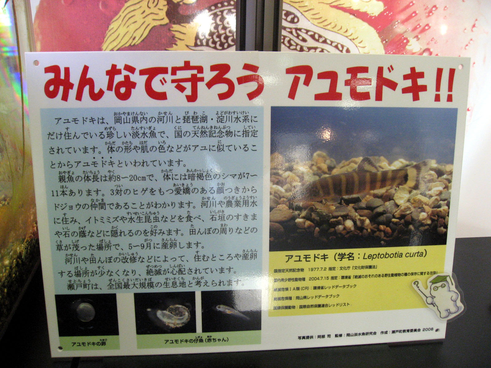 | ---家族やその頃のMEの卒研生や小グループ受け持ち学生と来たことがある「アユモドキ」も,展示が続いていました。 | |||||