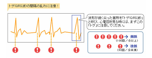 ほぼ同じスタイルのトゲが出ているが、QRS波の出る間隔が不規則で乱れが認められる。