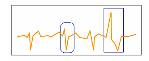 R波の間隔は、ほぼ規則正しく並んでいるが、異なったスタイルのQRS波が混在しているのが認めらる。 異なったスタイルのQRS波は、普段と異なった場所から電気の興奮が起