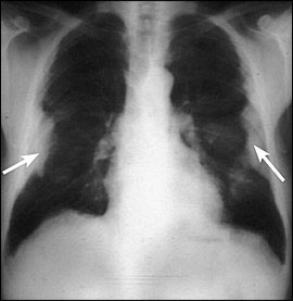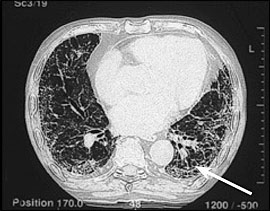 石綿症は線維性肺疾患または塵肺であり、アスベスト線維の吸入から生じる。多くの患者において、それは通常比較的マイナーな徴候をもたらす、非常に程度が軽くて痛みのない線維症によるのが特徴である。一般にアスベスト曝露のピーク時と診断の間の潜伏期間は、20〜30年である。身体検査に関する聴診音と関連する労作性呼吸困難に対する病訴は、更なる検査をすべきであるということ示している。肺機能の初めの変化は、減少した拡散能力と労作性の酸素不飽和化であるかもしれない。検査におけるプロセスがより先進になるにつれて、肺機能テストは減少した総肺気量と肺活量で制限的なパターンを明らかにするだろう。また胸部X線撮影は、一般的に増加した間質陰影としばしば胸膜プラークを示す。主にベースとして、胸の高解像度CTにおける典型的な検査結果は増加した間質陰影を含む。後に蜂窩が明らかになるかもしれない。(figure1)多くの点で、石綿症は特発性肺線維症と臨床的に類似している。しかし、石綿症は通常ゆっくり進行するが、特発性肺線維症は急速に進行する場合がある。現在の治療では、効果的に石綿症の疾患過程を変えることはできない。患者はインフルエンザと肺炎球菌のワクチンから利益を得る。かなりの職業的なアスベスト曝露と典型的な高度解像度CT検査結果歴があれば、外科的肺生検は診断を確立するためにあまり必要とはされない。外科的肺生検が行われた患者等に対して、病理学パターンでは間質性肺炎という診断なのである。これは特発性肺線維症患者に起こっている病理と同じであって、コラーゲン血管疾患(例えば慢性関節リウマチ)に伴う肺線維症でも見られるかもしれない。アスベスト小体は組織の特別な鉄の染色によって特定され、これらアスベスト小体の数は、線維症のひどさと相関する。肺組織におけるアスベスト小体の存在は、石綿症の診断を確かなものとする。