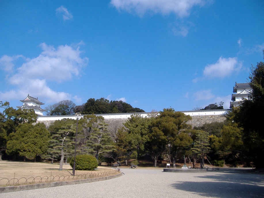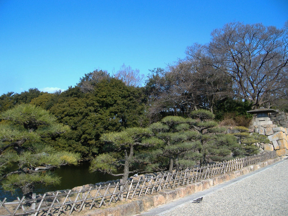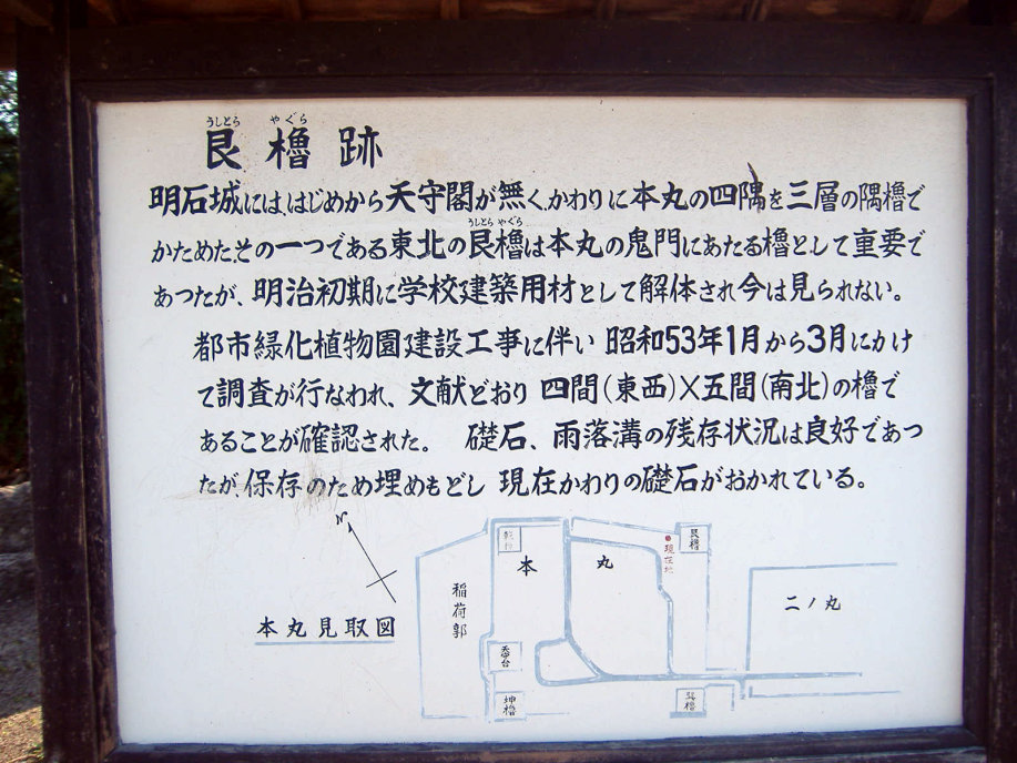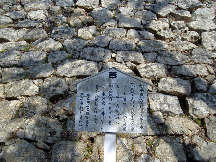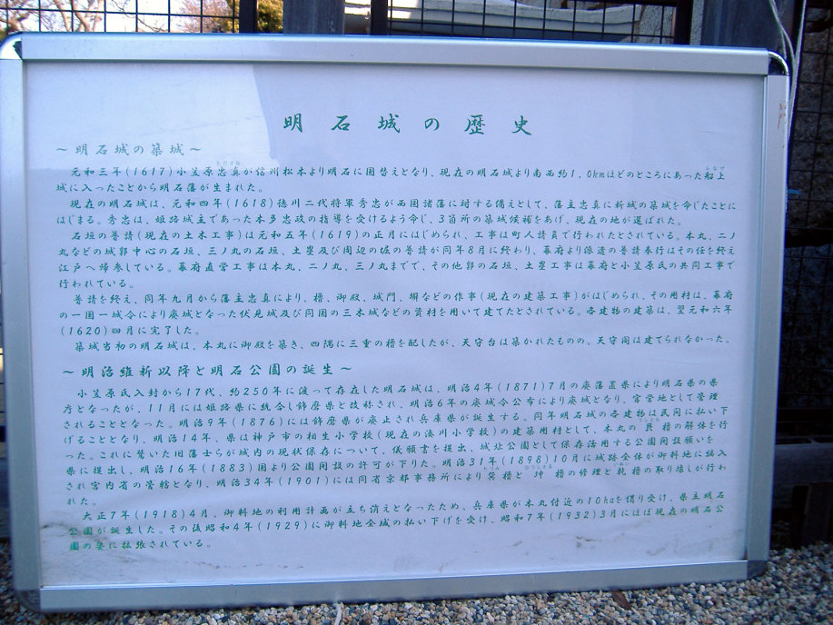櫓の処で,ボランティアの方に聞いた話によりますと,明石が城下町として形成されていった頃,丁度,宮本武蔵が姫路城に居て,で,武蔵に城や町の普請を任せたとのこと・・・武術だけでなく兵法や,或いは,作庭にも優れいたようで,武蔵により庭をもたれているお寺もあるそうです。で,丁度,NHK大河ドラマで武蔵が取り上げられた年(岡山県でも,大盛り上がりでしたけど),所縁ということで,ここに武蔵の庭園を作られた(観光名所ということですよね)そうです。 |