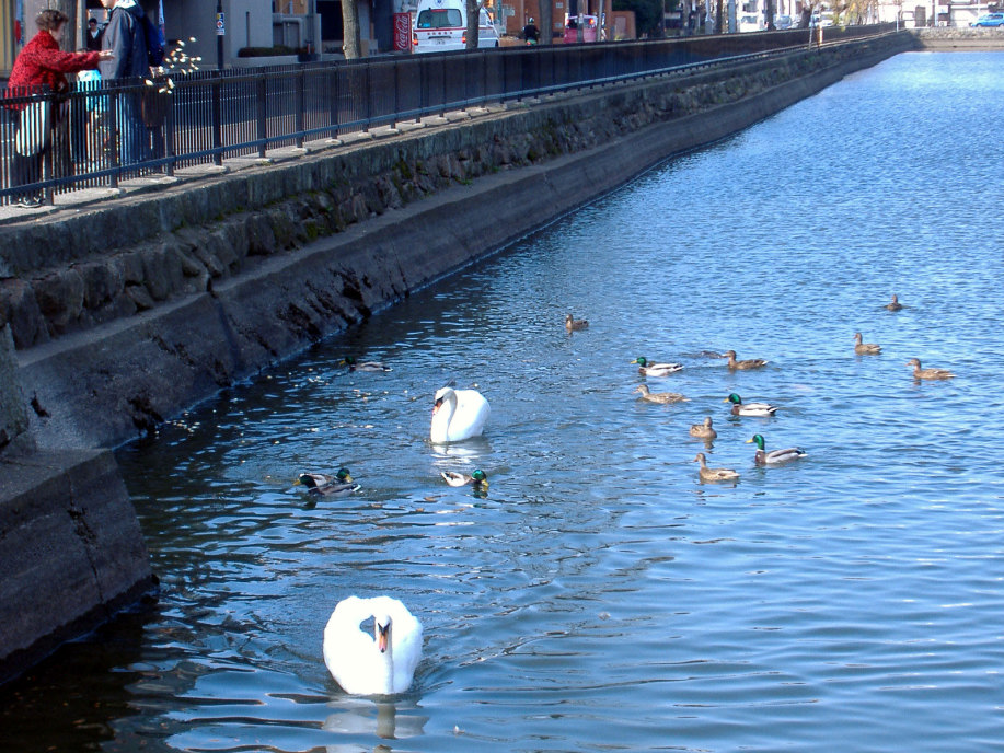 | 明石駅のまん前にあります。お堀があって,白鳥が居て,前庭の所は,広場になり,木々があり・・デート中の若い二人連れもいましたし,家族連れも居ました。暖冬の今年,陽射しも暖かく,気持ちがのんびりになりました。 |