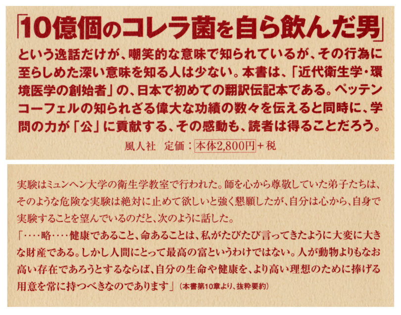 | 植木先生は,ドイツへの留学もされていらっしゃた縁をお持ちで,その後,環境医学研究の途へお進みになられたこともあり,ドイツで出版されたペッテンコーフェルの伝記をお読みになられた後に,日本語訳をされることを,思い立たれたそうです。 詳細な経過などは,「訳者あとがき」に記されております。是非,お求めの上,お読みください。 詳しくは, 風人社ホームページ その中の本著の紹介 を,ご欄ください。 |