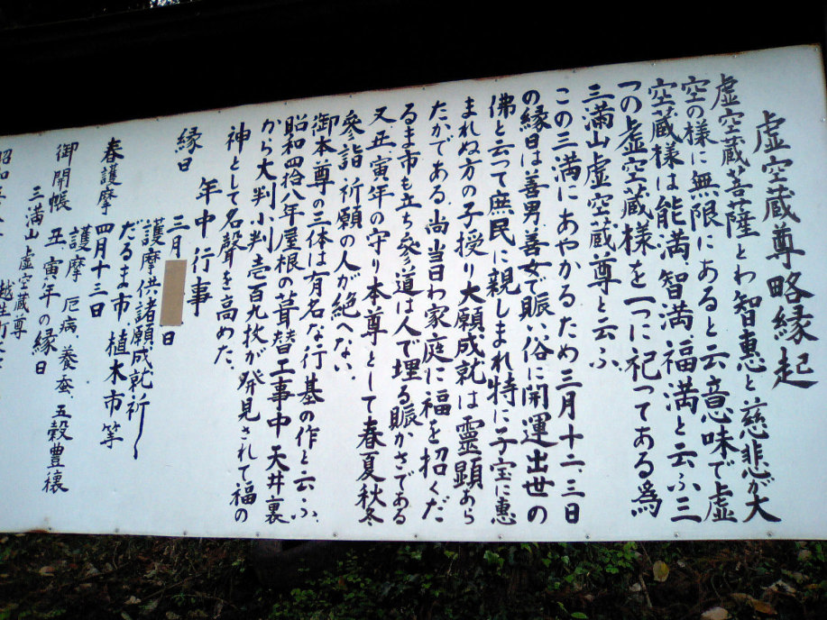 山を越えて,越生に入ります。・・・そして,そこには,上野という地域の山懐の辺りに虚空蔵尊があります。HPによりますと「上野の虚空蔵尊は三満山といわれ,能満・智満・福満の三つの虚空蔵菩薩が祀られています。昭和47年に堂下の万蔵寺の屋根裏から小判が発見され,福の神として一躍有名になりました。上野虚空蔵尊は関東で最後に開かれるだるま市としても知られていますが、最近では越生・秋の七草めぐりの一つとなり,桔梗が植えられ整備されています。」とのことです。 |