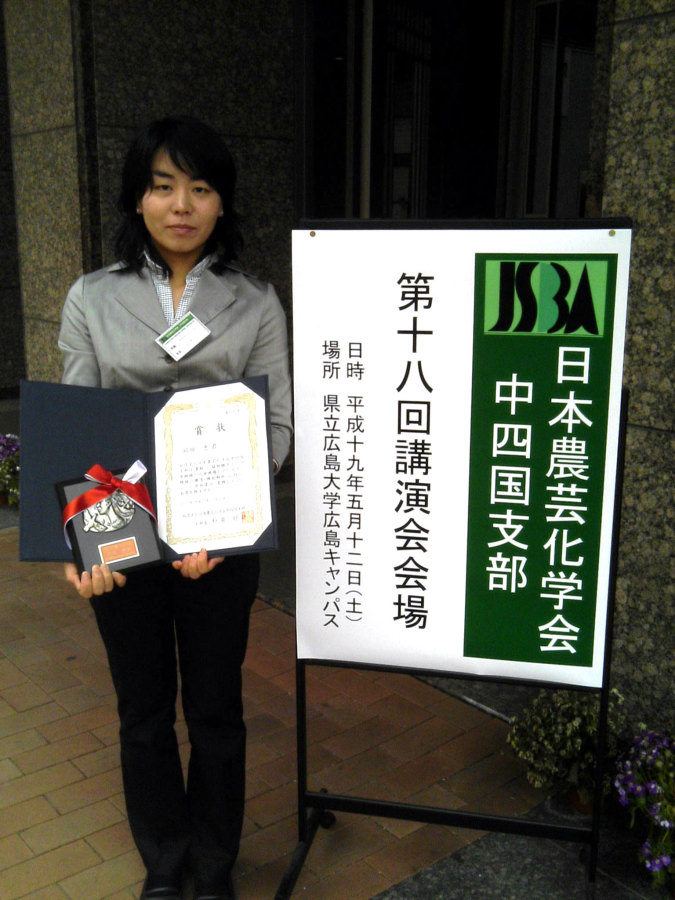 | 2007.5.12. 受賞が決まった時にも紹介しましたが,前田 恵 先生が,2007年度農芸化学会中四国支部奨励賞を受賞されました。 そして,5/12の第18回講演会(例会)で,受賞講演をされて来られました。 素晴らしい! おめでとう!!!! |