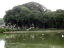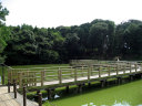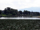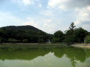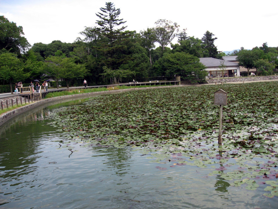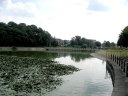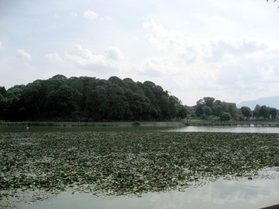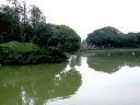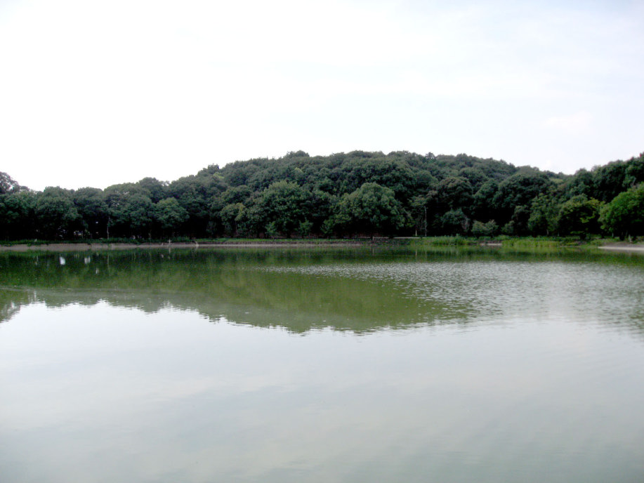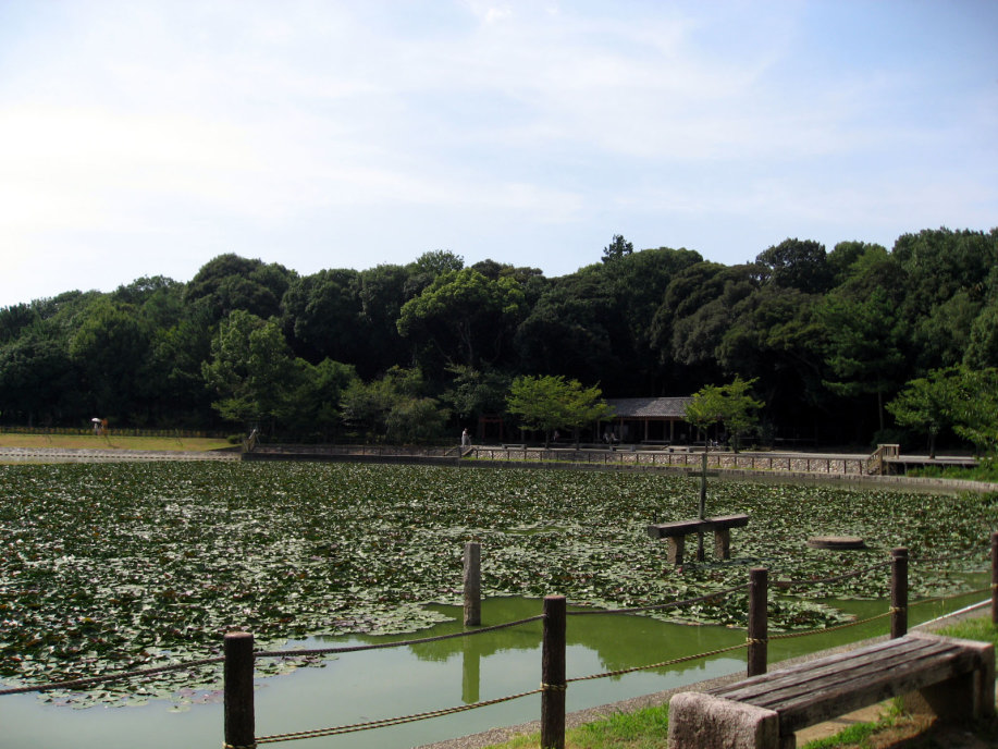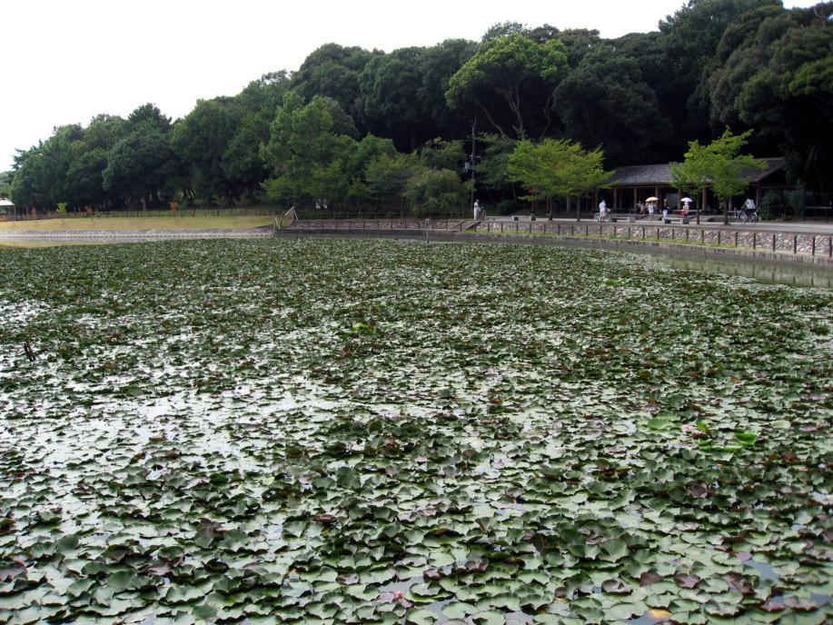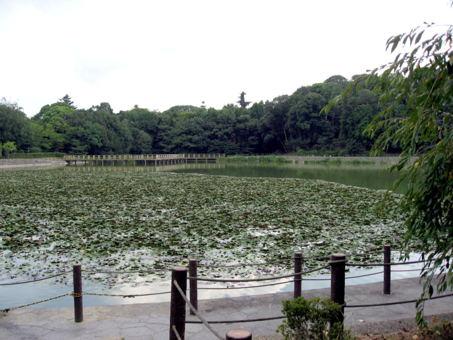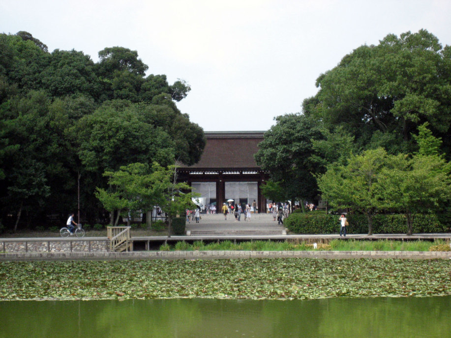 池の端から,丁度,正面に本殿への門を見た感じですね・・・。本当に,猛暑の残暑で,池を観ながら・・何かもの思いに耽るって余裕もありませんでした。哀しいかな・・・・。 |