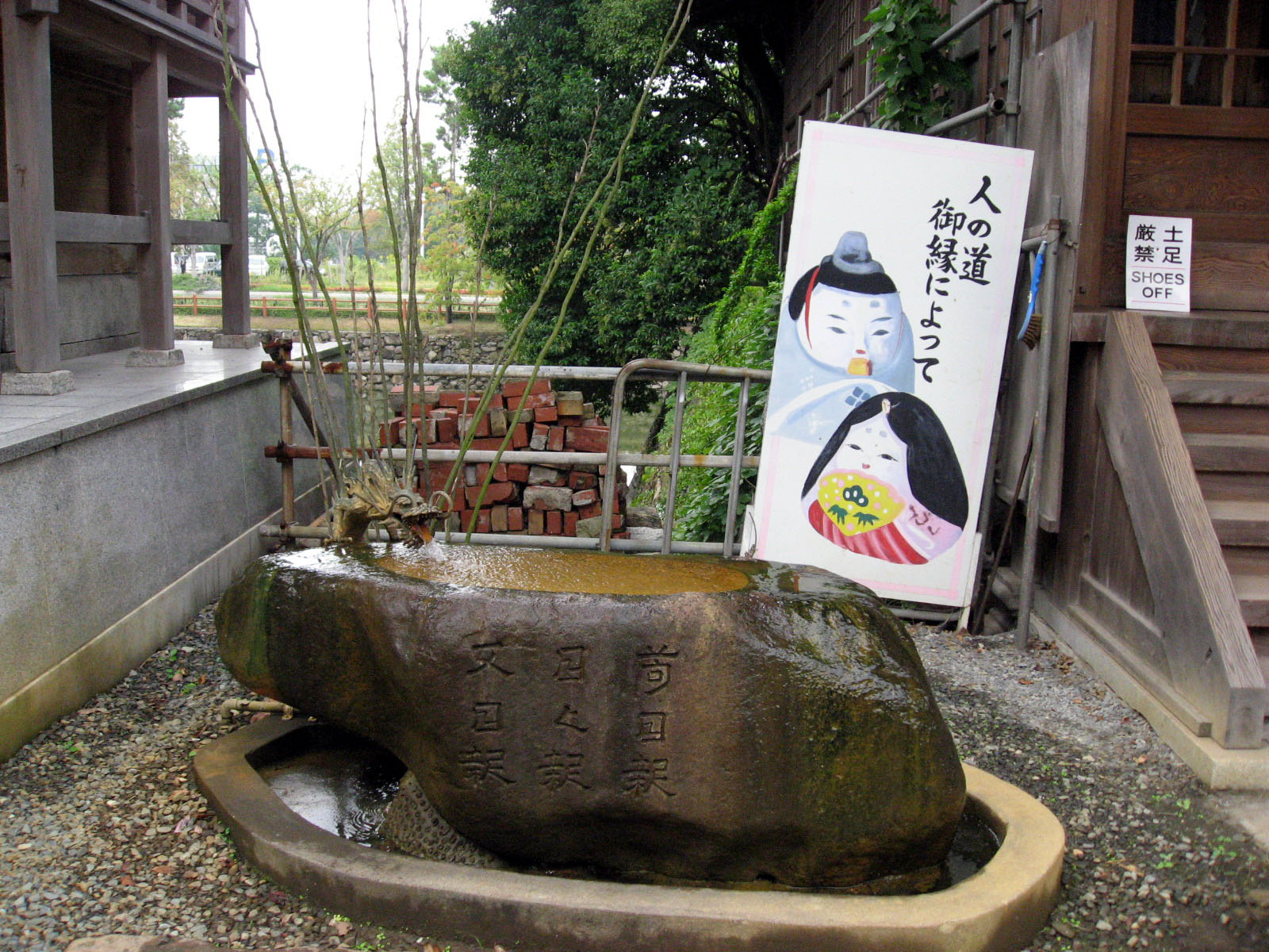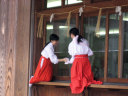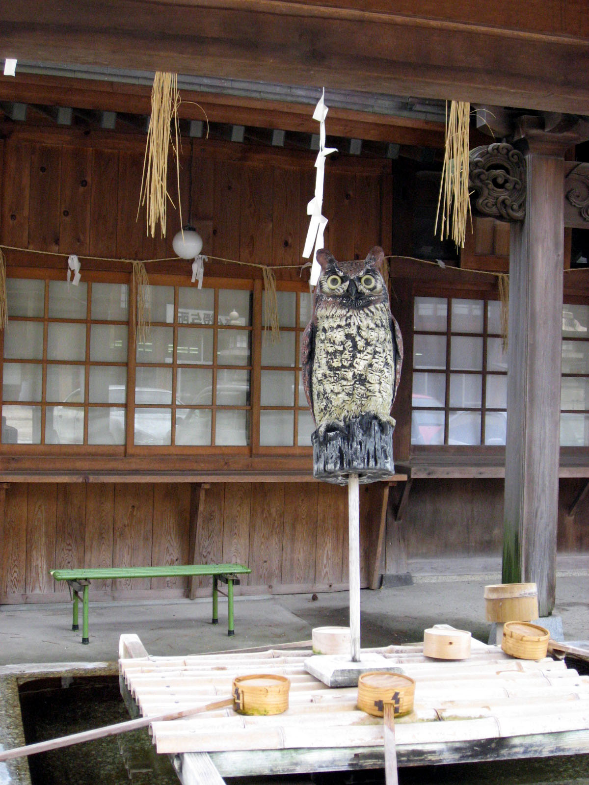 手洗い所の梟は,福来る,ということでしょうか・・・ちょっとユニーク!巫女さんたちも朝の窓掃除に余念がありません。