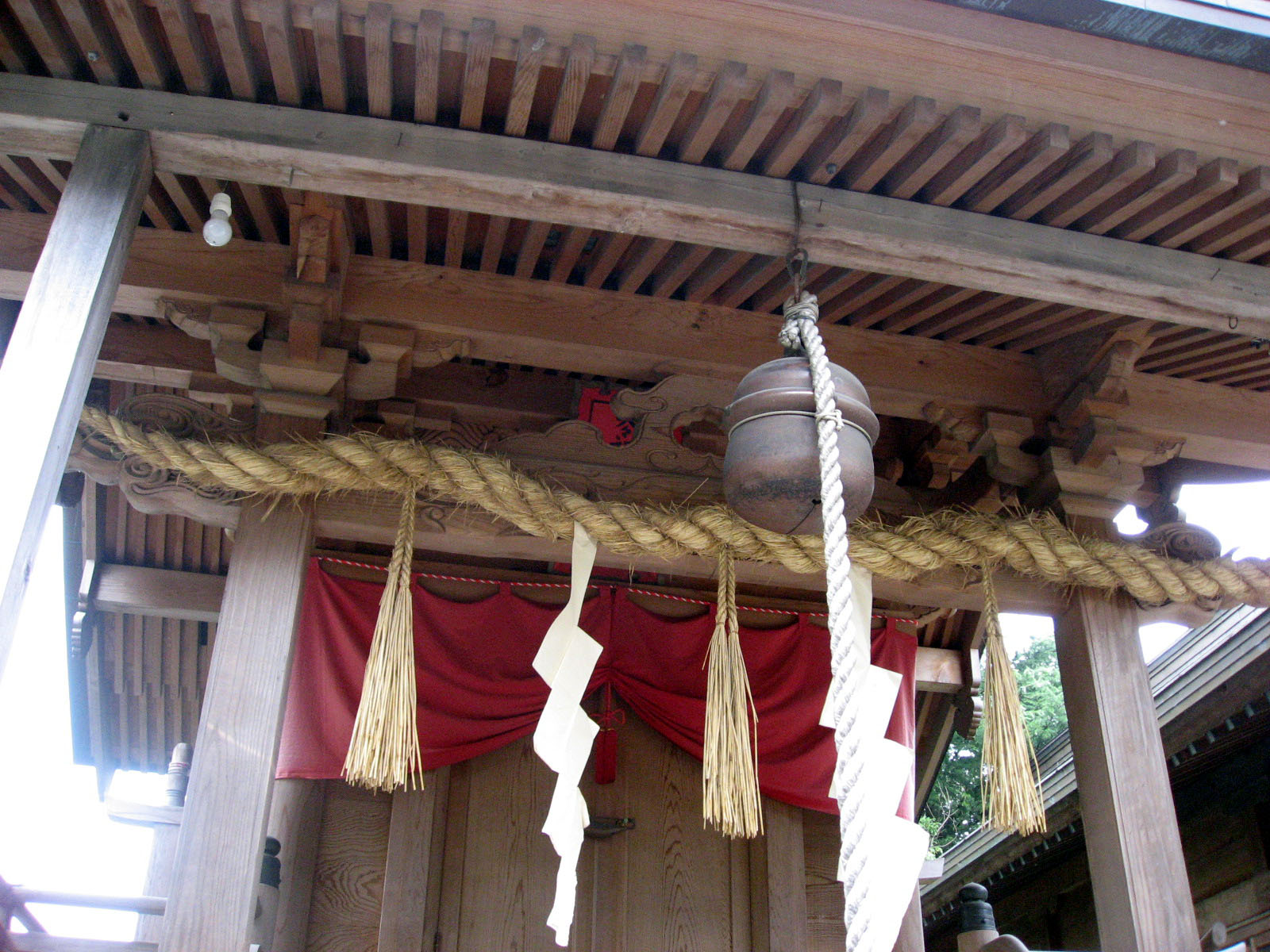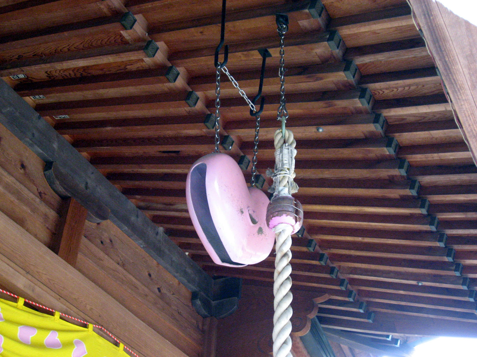 | さて,奥にある境内社ですが・・・鐘がピンクのハード型・・・・やりすぎちゃうって印象を受けますが,でも,九州ならでは,かも知れません。恋愛の神様・・・でしょうね! |