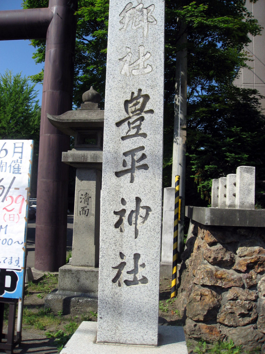 主祭神上毛野田道命は、崇神天皇の皇子豊城入彦命より5代目の子孫にして東北地方の守護神として厚く崇敬せられ、特に延暦年間征夷大将軍坂上田村麻呂が奥羽地方平定に向かわれた時、田道命の神霊の御加護によりてこれを平定することができ、後に今の青森県南津軽郡猿賀山に神霊を勧請して社殿を建立したもので、猿賀神社は当神社の本社に当たる。当地域は東北地方移住者多く、それゆえに故郷の氏神様をお祀りしたものである。さらに当豊平地区は開墾の途上で森林遠く連なり、これが伐採に大山祇神を祀り、開墾進み沃野美田の広がり行くにつれて倉稲魂神(稲荷大神)を合祀して豊平区の氏神様として奉斎され現在に至った。