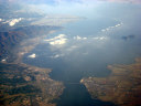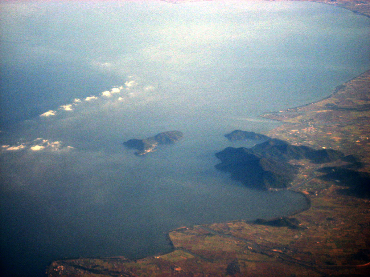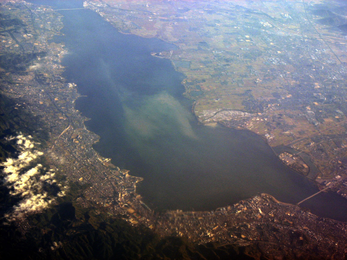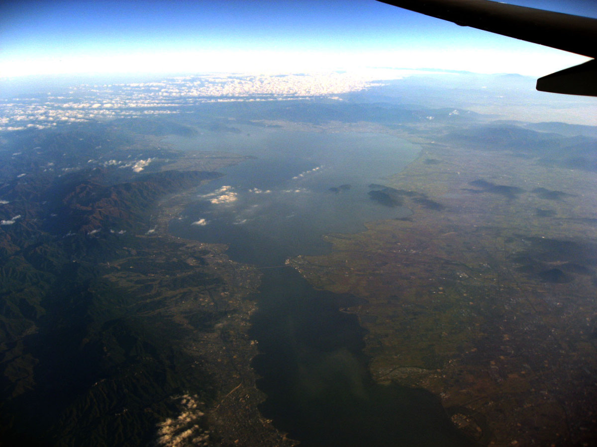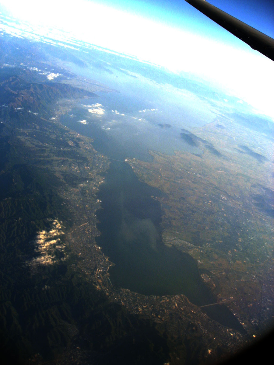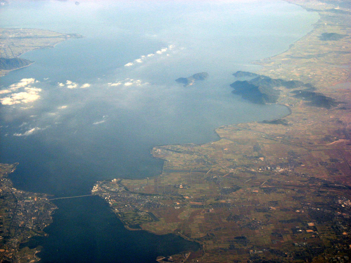琵琶湖です。狭まったところの橋梁は,レインボーロードだそうです。島は沖島だそうです。