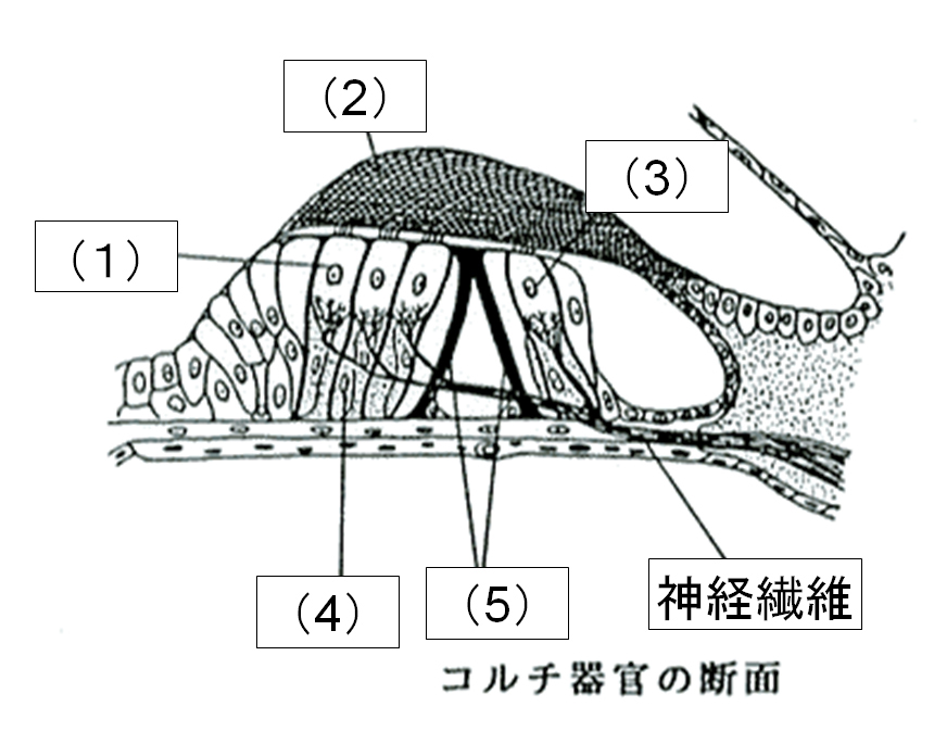 4 騒音性難聴で変性脱落する細胞として正しいのはどれか。図中の番号を選べ。