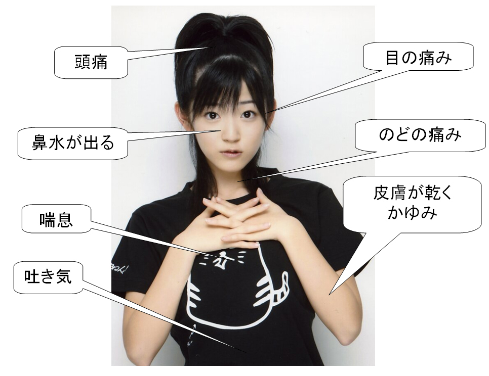 10 写真の女子高生が転校で,1か月前に新築された校舎の学校に通学し始めた途端に,図のような症状が出現してきた。自宅や休日には症状がおさまるという。考えられる原因物質はどれか。