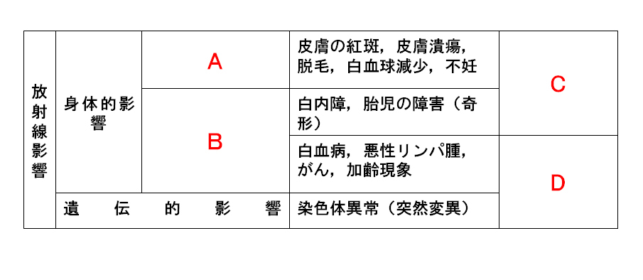 c A:早期障害,B:晩発障害,C:確率的影響,D:確定的影響