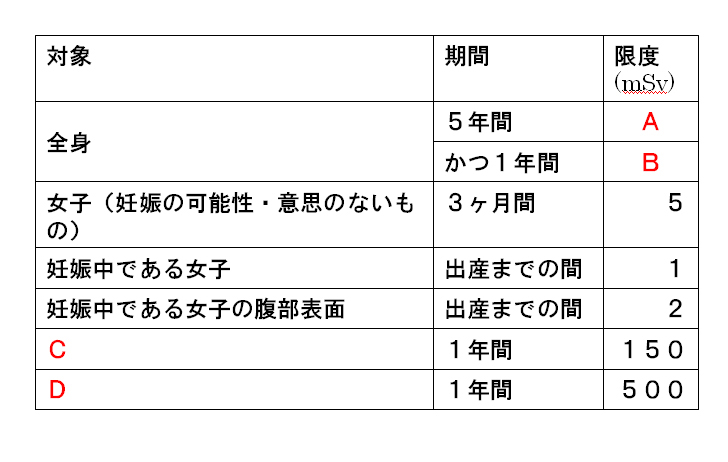 16 放射線作業従事者の線量限度について表の A B C D として正しいのはどれか。