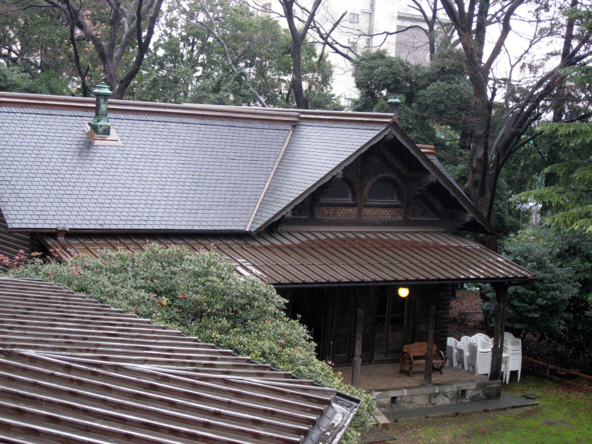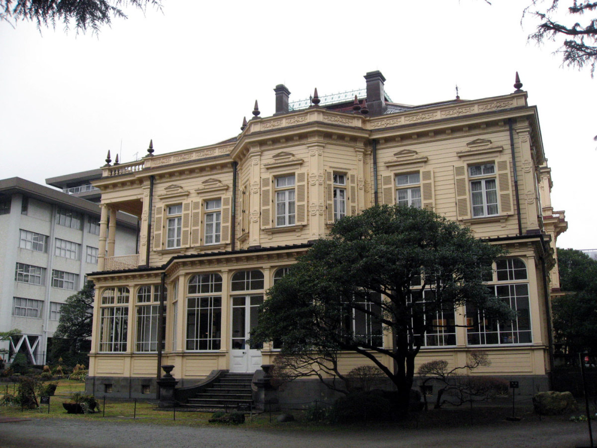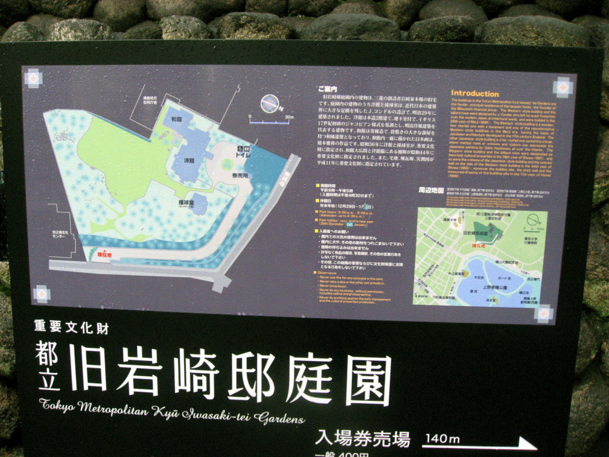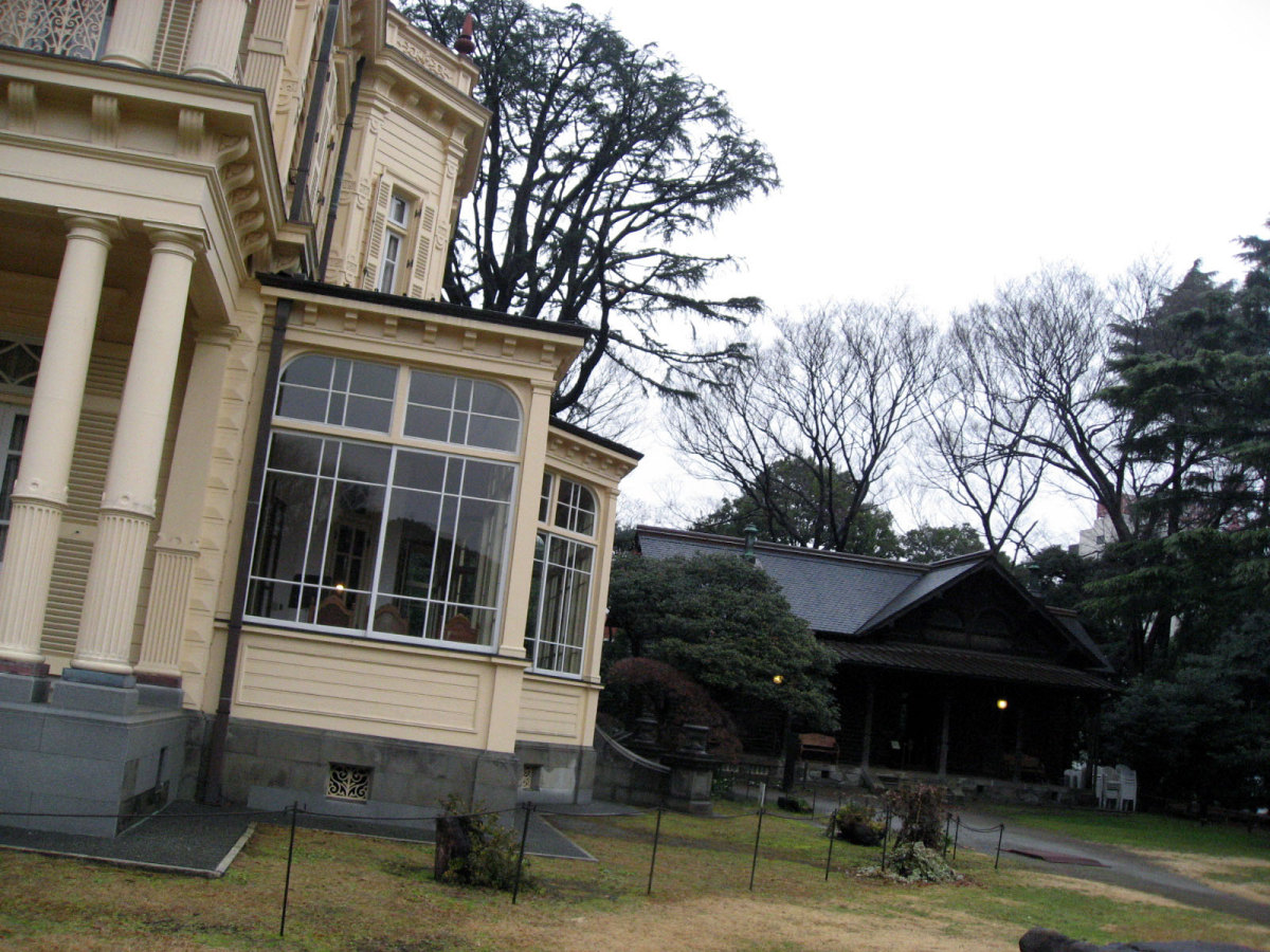 【洋館:1896年(明治29年)に竣工し、岩崎家の迎賓館として用いられた木造下見板張りの西洋館。お雇い外国人として来日、独立後は三菱・岩崎家の仕事を数多く手がけたジョサイア・コンドルの設計である。南面に大きなベランダが張り出したスタイルには、コンドルが得意としたベランダ・コロニアル様式がよく表れている。晩年の作品に比べ装飾性が強く、四角い塔の張り出す玄関や外観の装飾はジャコビアン様式を基調として、イスラム風のデザインが施された客室など様々なスタイルを織り交ぜている。(東側のサンルームは後年(明治40年代)の増築である)】とのことです。
