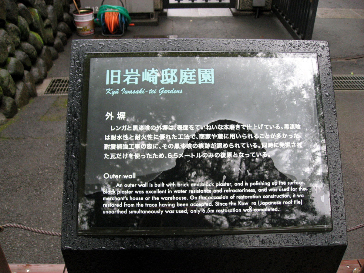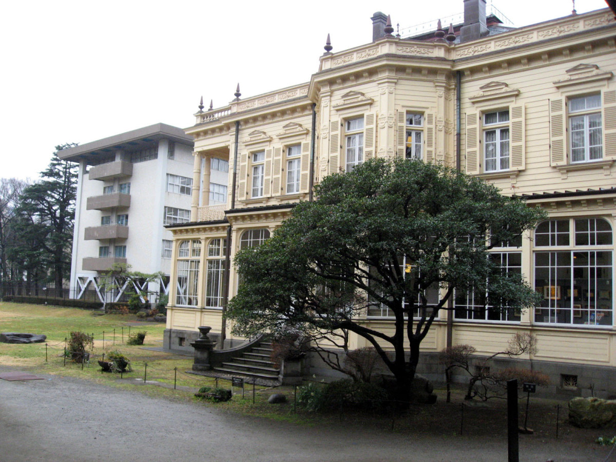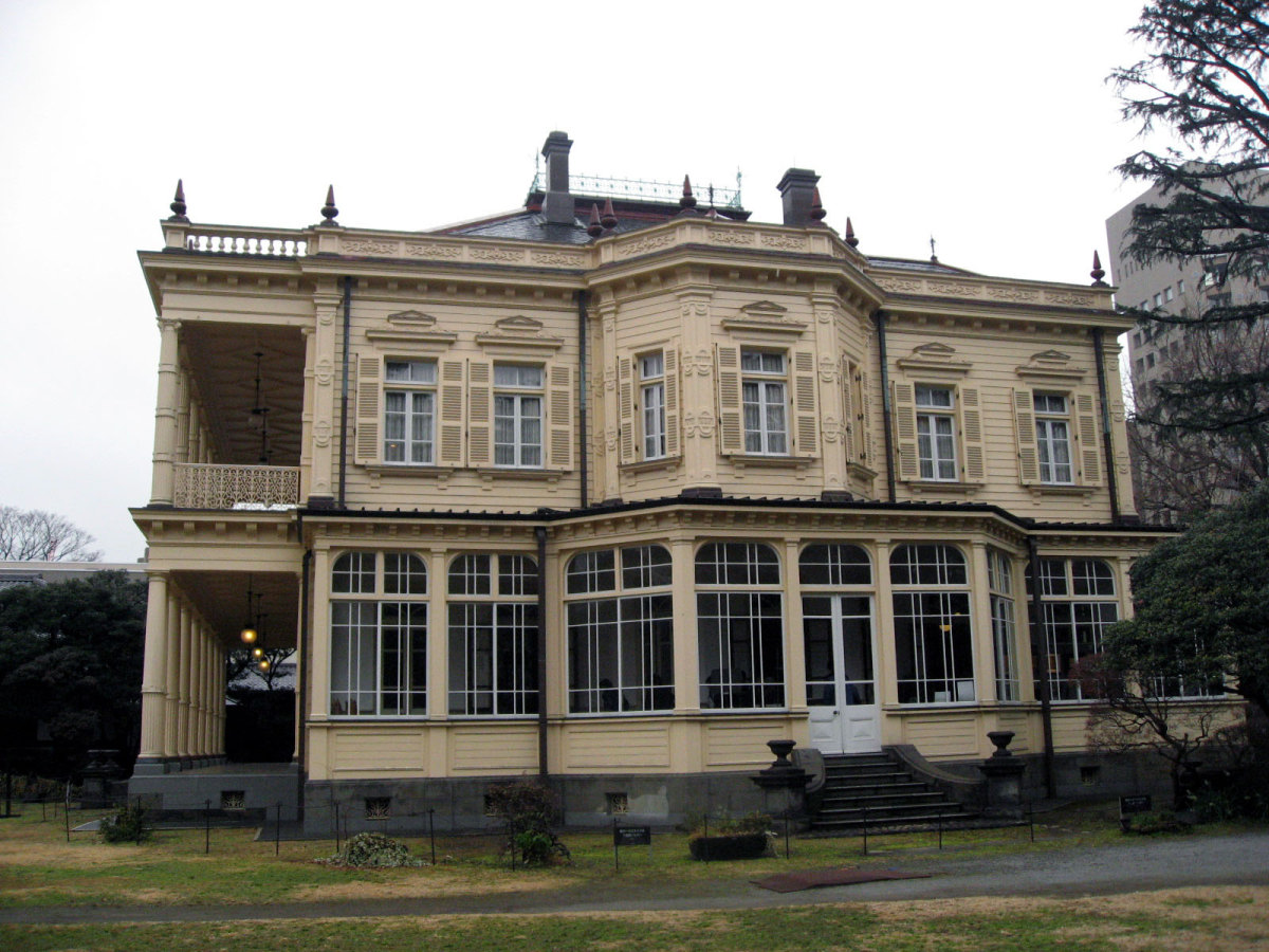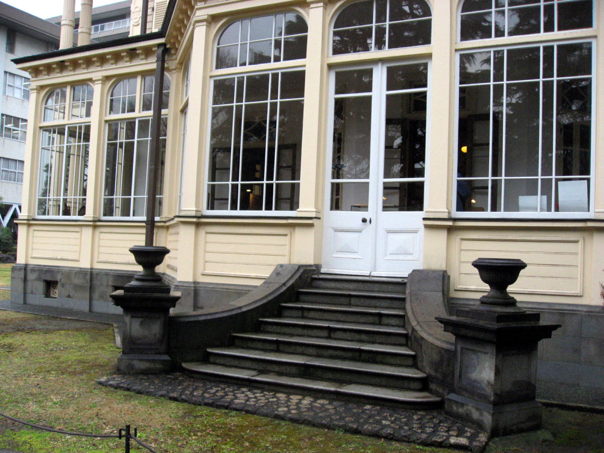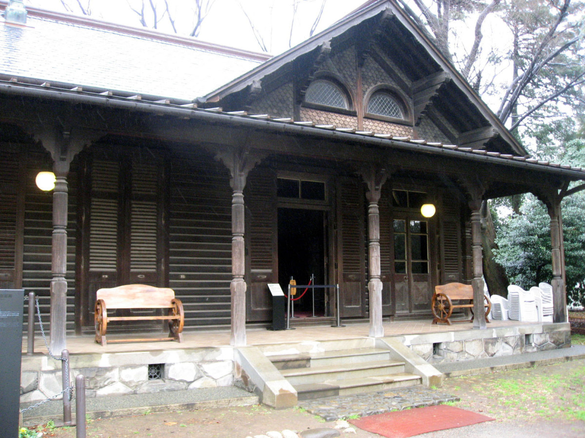 【洋館:1896年(明治29年)に竣工し、岩崎家の迎賓館として用いられた木造下見板張りの西洋館。お雇い外国人として来日、独立後は三菱・岩崎家の仕事を数多く手がけたジョサイア・コンドルの設計である。南面に大きなベランダが張り出したスタイルには、コンドルが得意としたベランダ・コロニアル様式がよく表れている。晩年の作品に比べ装飾性が強く、四角い塔の張り出す玄関や外観の装飾はジャコビアン様式を基調として、イスラム風のデザインが施された客室など様々なスタイルを織り交ぜている。(東側のサンルームは後年(明治40年代)の増築である)】とのことです。