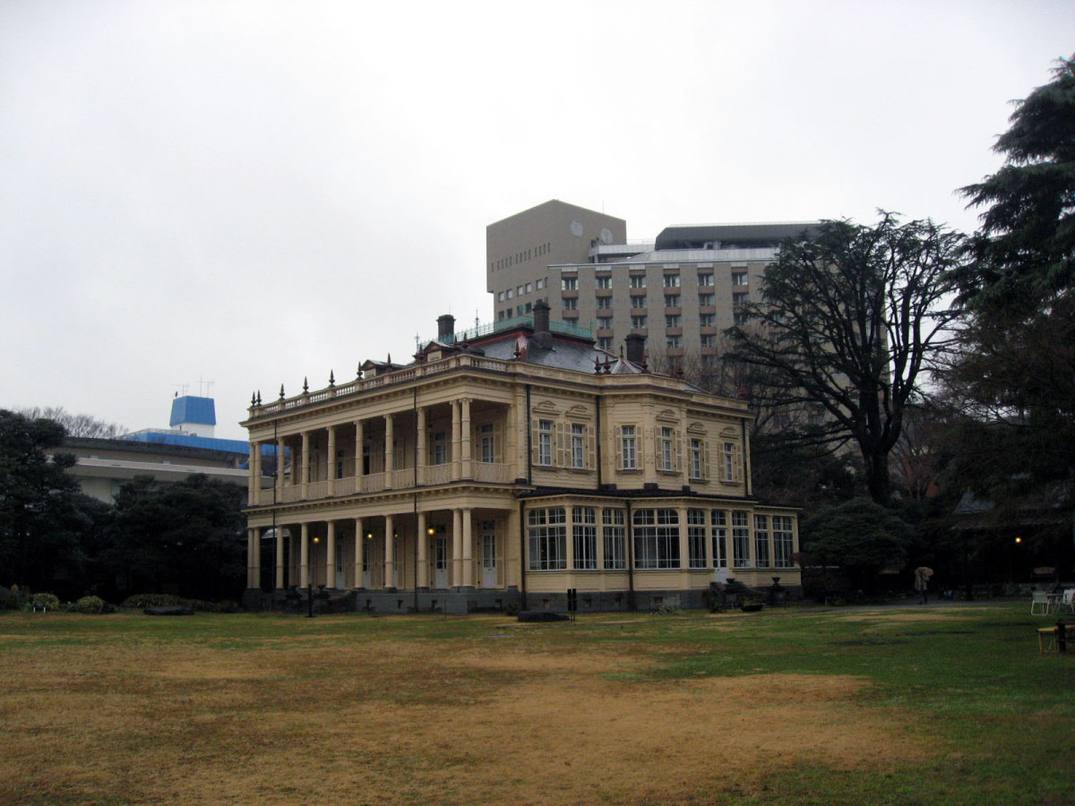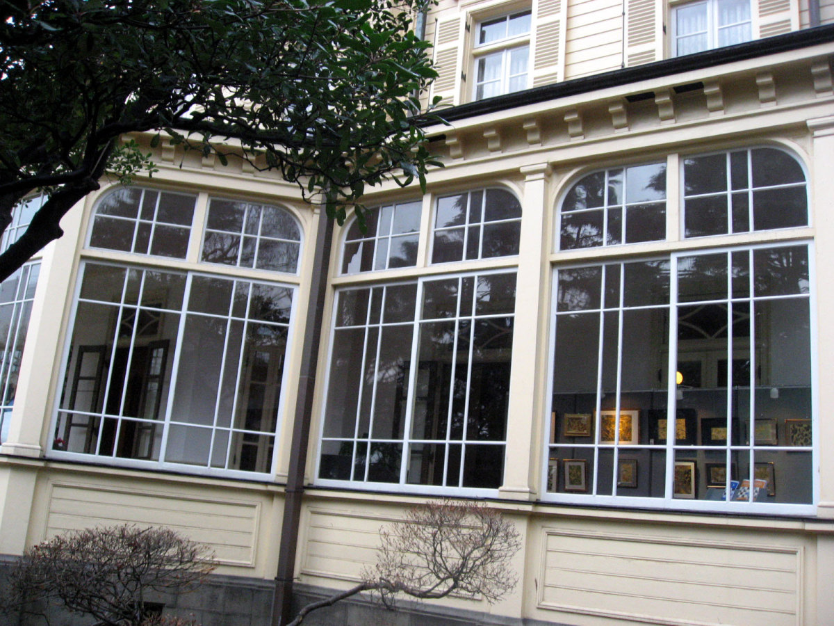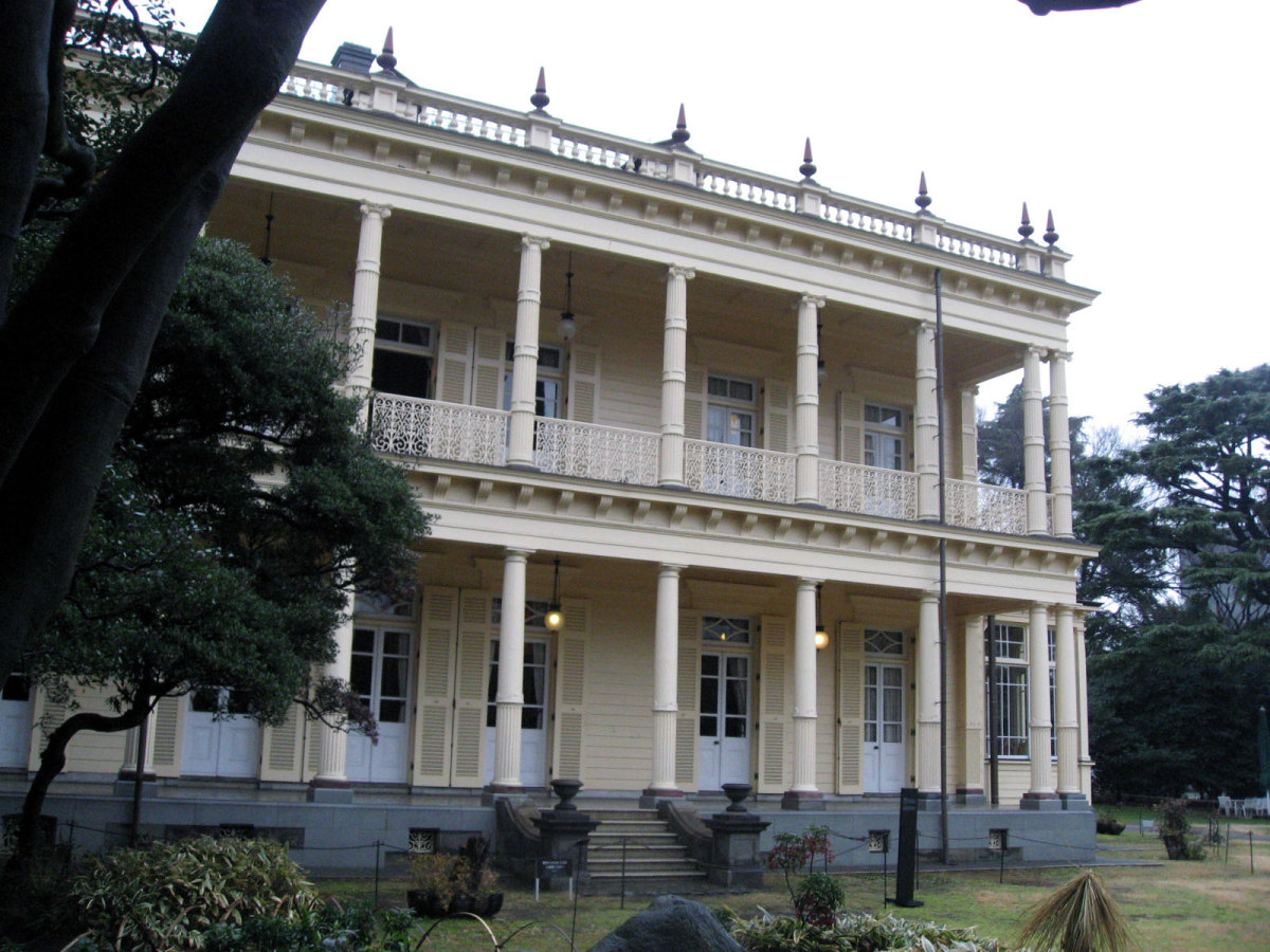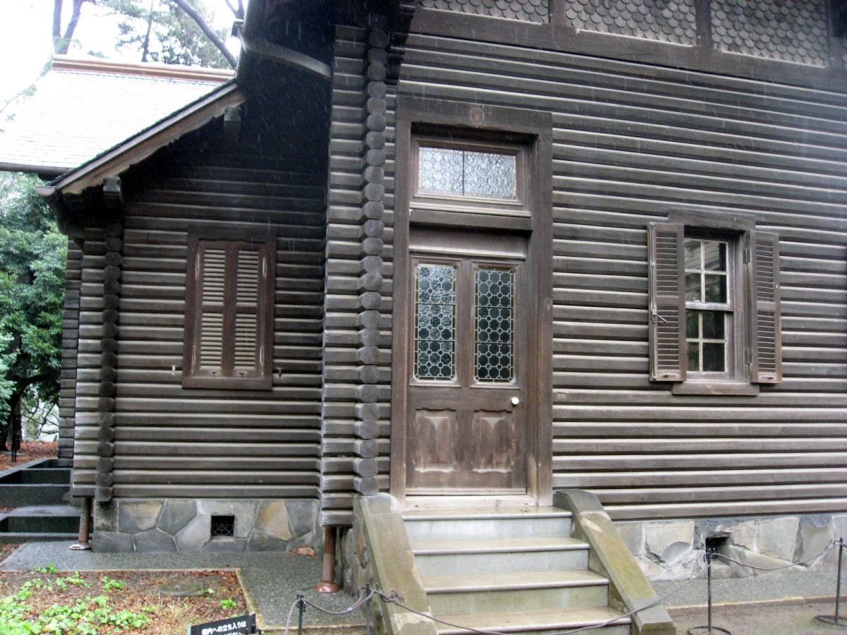【洋館:1896年(明治29年)に竣工し、岩崎家の迎賓館として用いられた木造下見板張りの西洋館。お雇い外国人として来日、独立後は三菱・岩崎家の仕事を数多く手がけたジョサイア・コンドルの設計である。南面に大きなベランダが張り出したスタイルには、コンドルが得意としたベランダ・コロニアル様式がよく表れている。晩年の作品に比べ装飾性が強く、四角い塔の張り出す玄関や外観の装飾はジャコビアン様式を基調として、イスラム風のデザインが施された客室など様々なスタイルを織り交ぜている。(東側のサンルームは後年(明治40年代)の増築である)】とのことです。