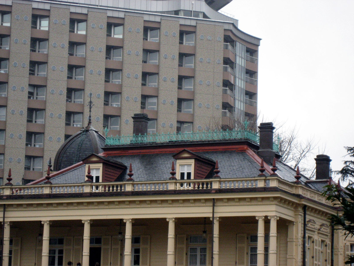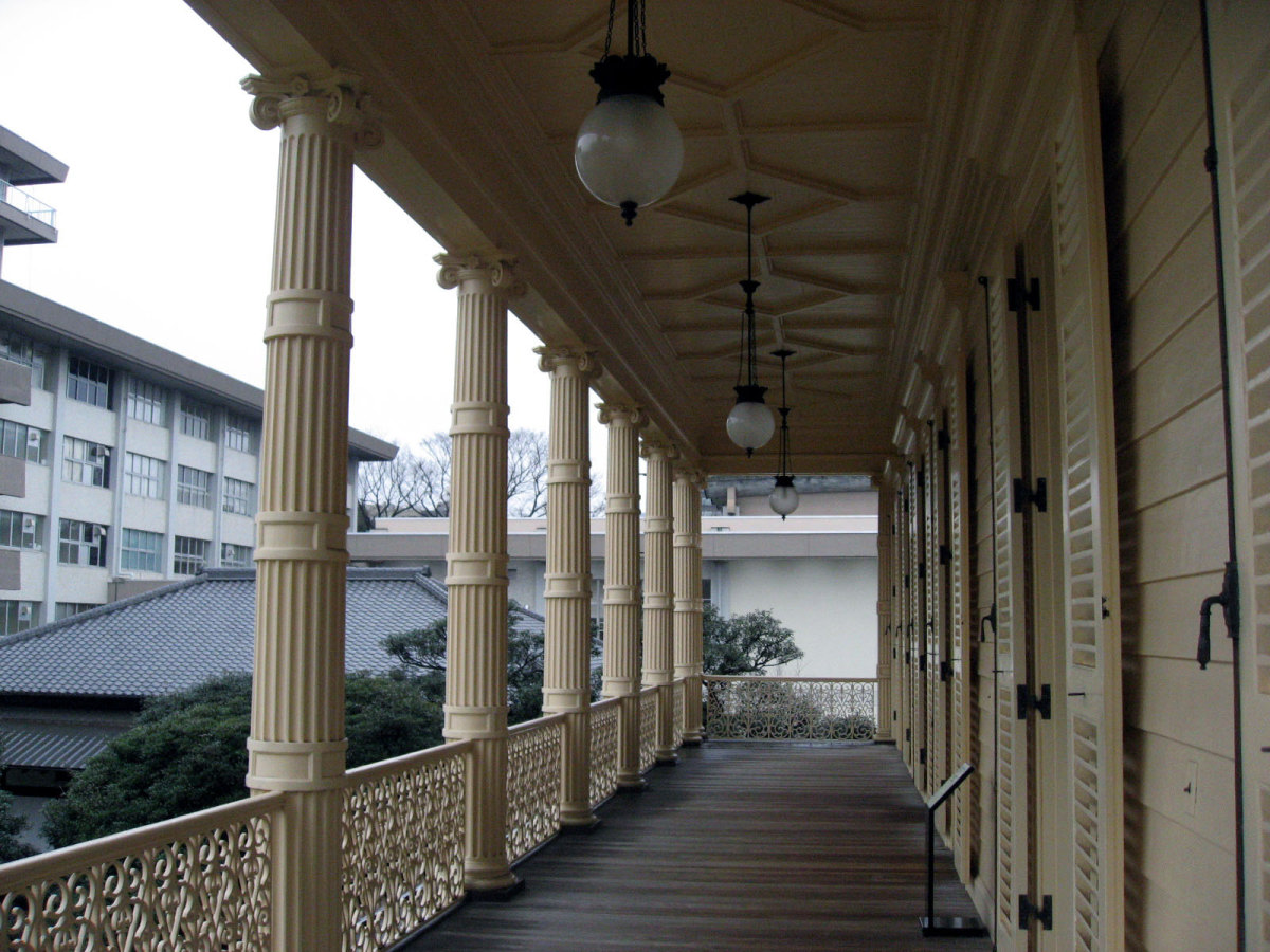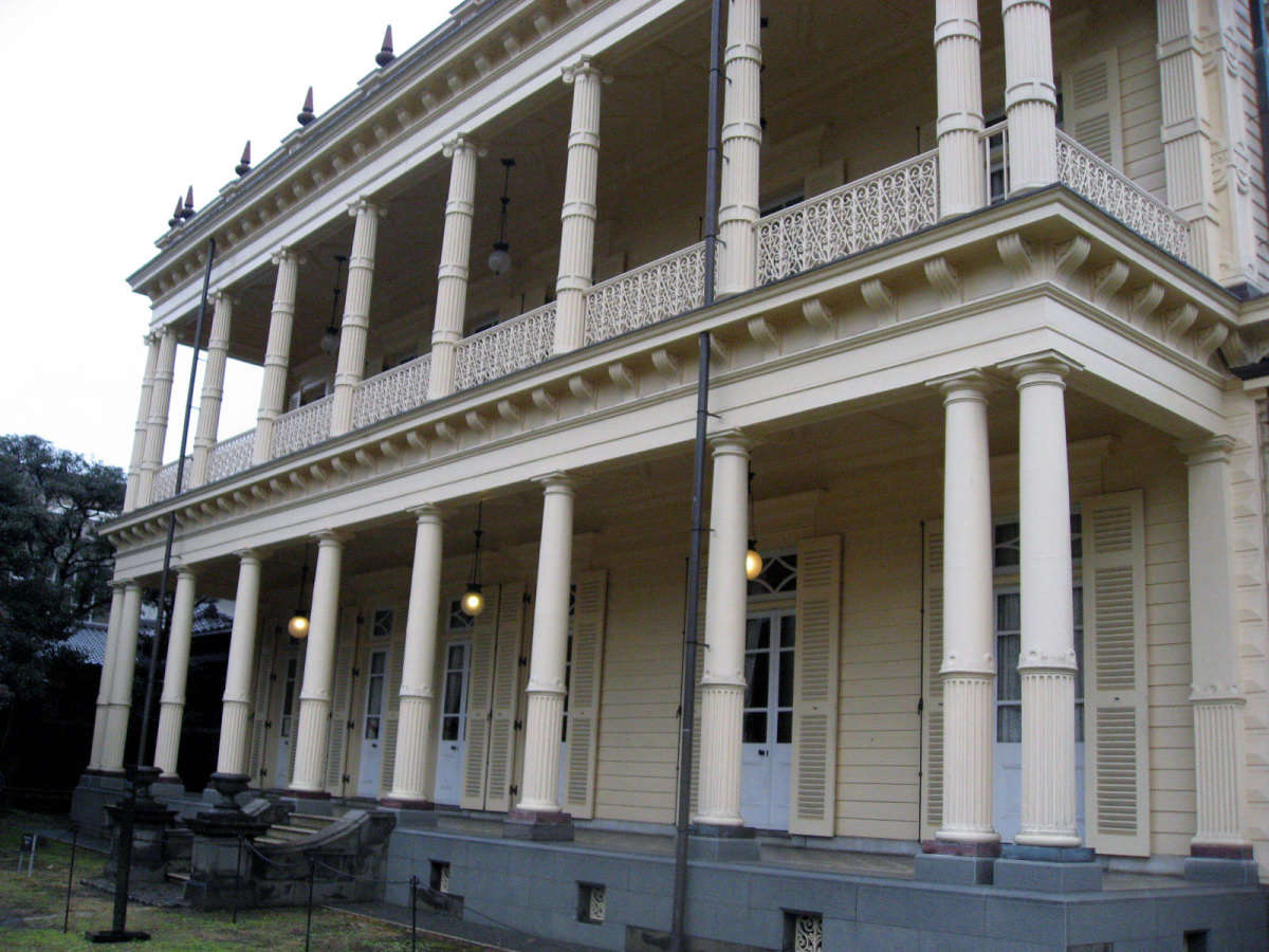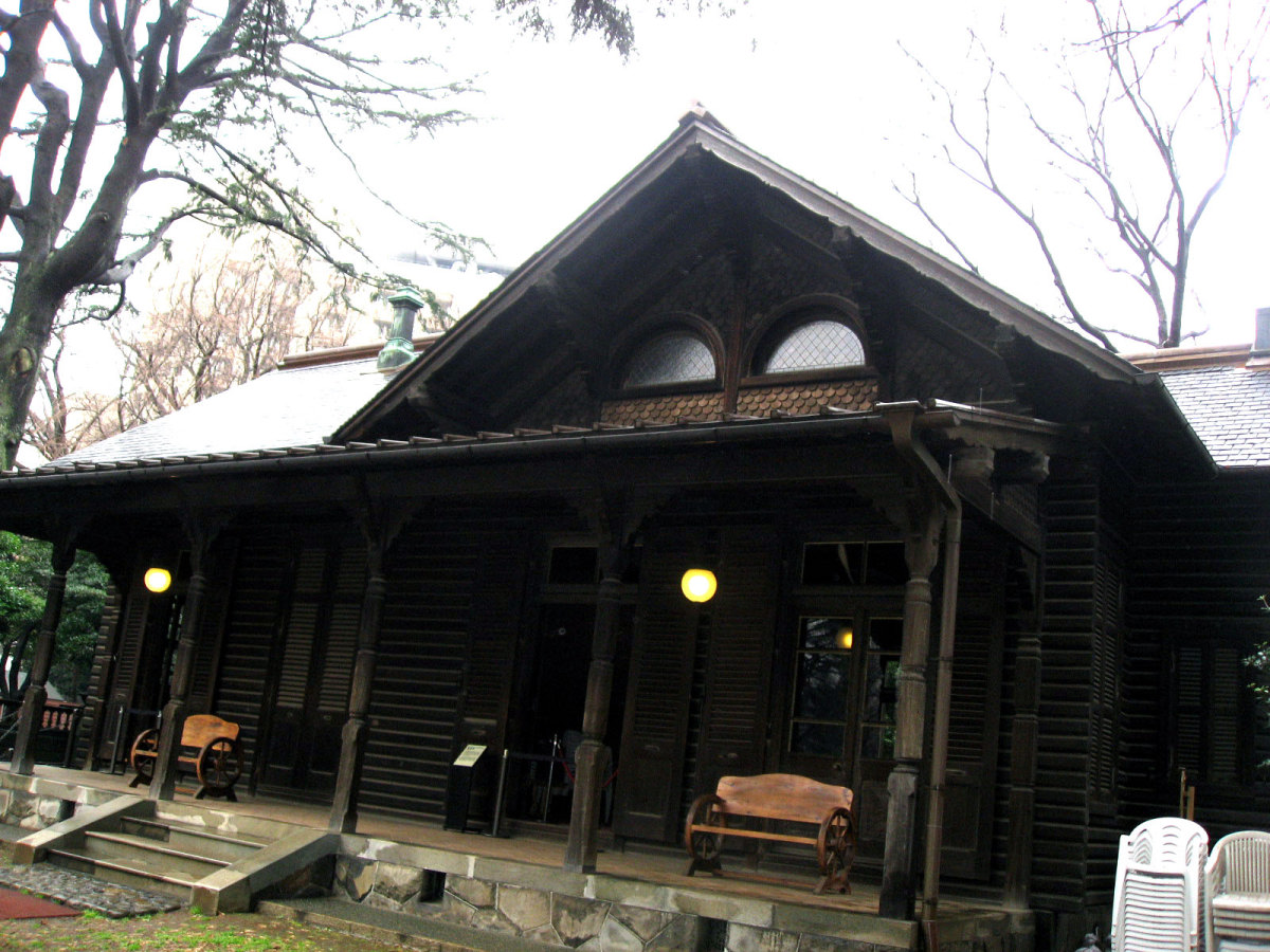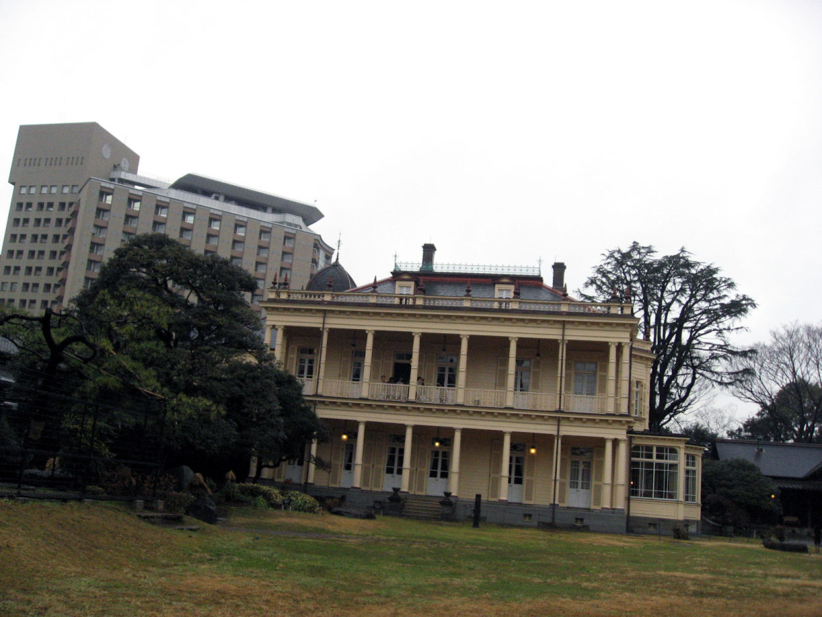 【洋館:1896年(明治29年)に竣工し、岩崎家の迎賓館として用いられた木造下見板張りの西洋館。お雇い外国人として来日、独立後は三菱・岩崎家の仕事を数多く手がけたジョサイア・コンドルの設計である。南面に大きなベランダが張り出したスタイルには、コンドルが得意としたベランダ・コロニアル様式がよく表れている。晩年の作品に比べ装飾性が強く、四角い塔の張り出す玄関や外観の装飾はジャコビアン様式を基調として、イスラム風のデザインが施された客室など様々なスタイルを織り交ぜている。(東側のサンルームは後年(明治40年代)の増築である)】とのことです。