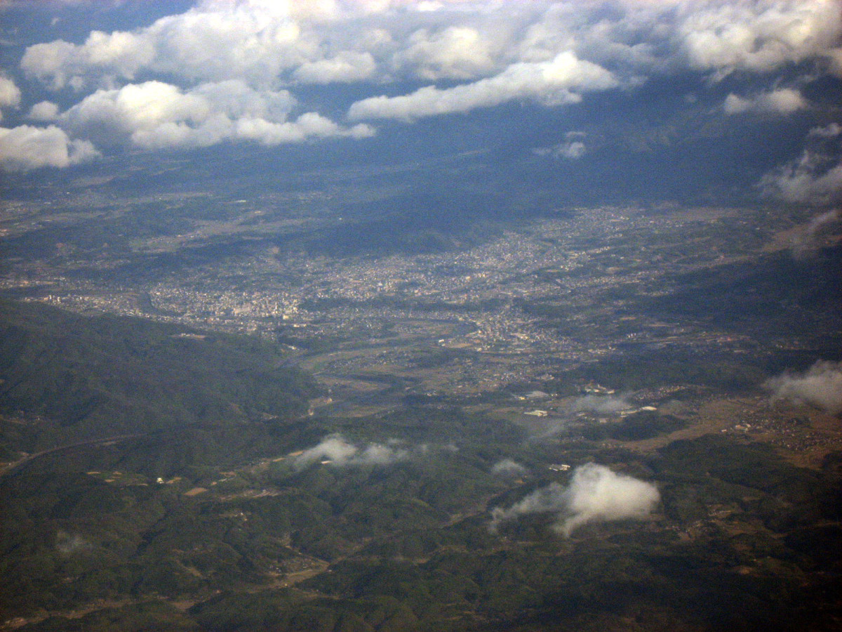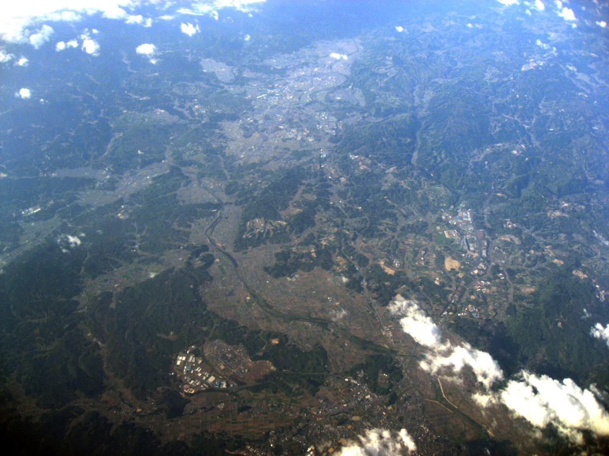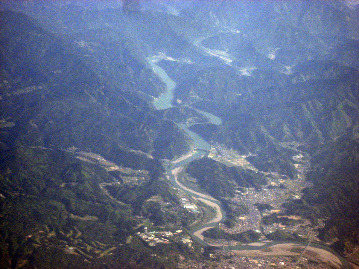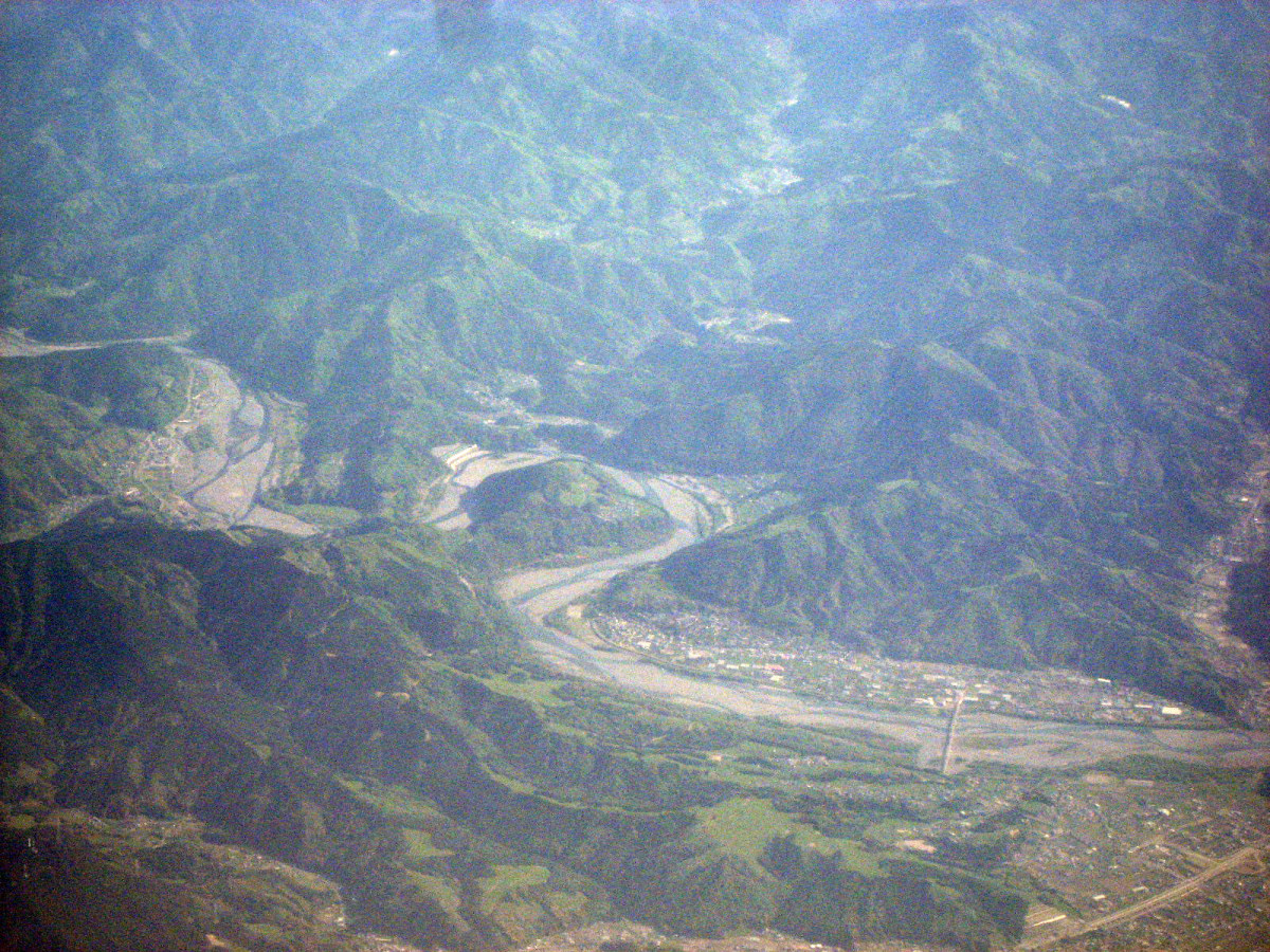 伊賀市街地上空から,南を向いて・・・木津川はこの辺りから,鈴鹿山脈に戻っていくのですね・・。