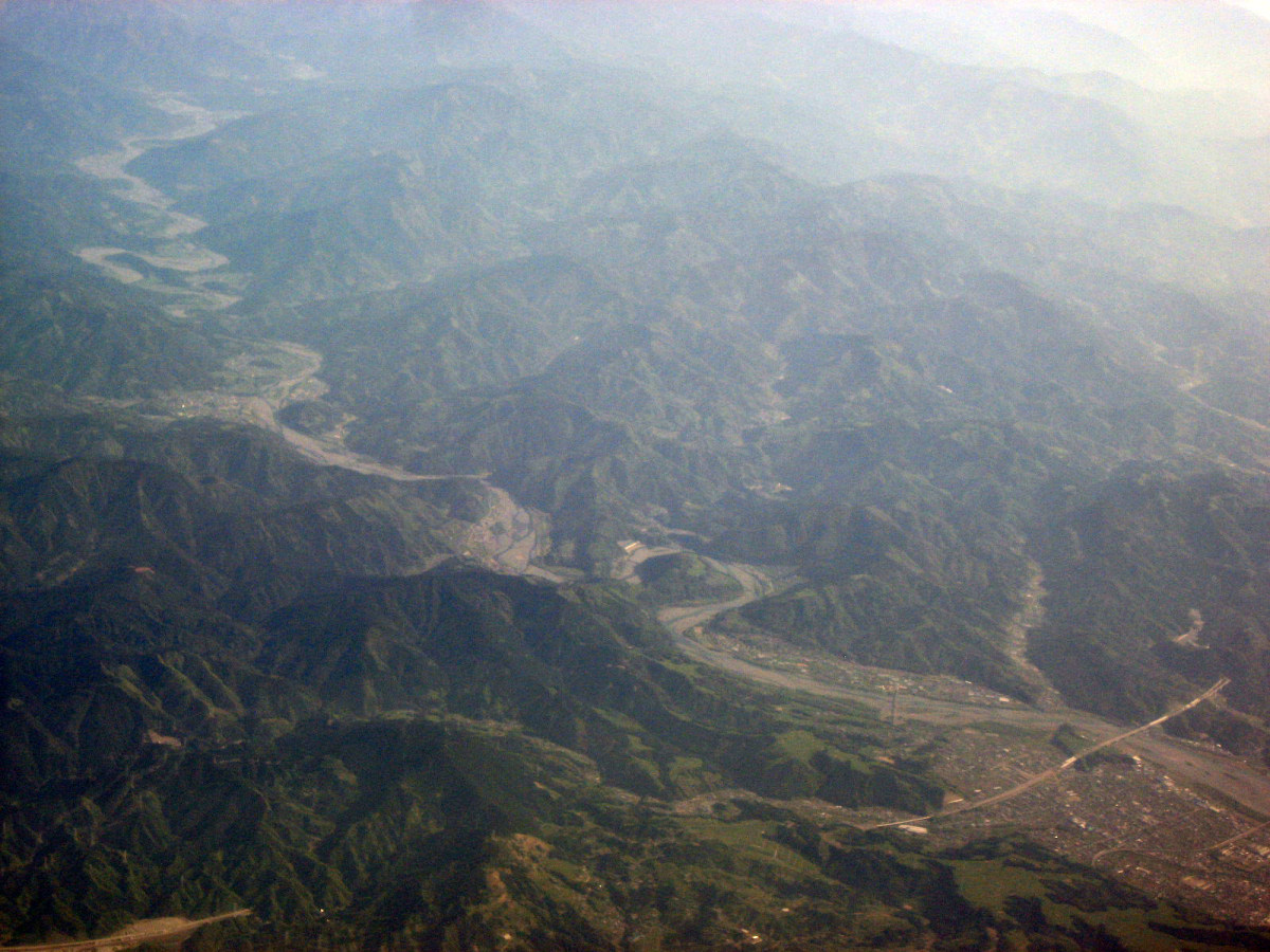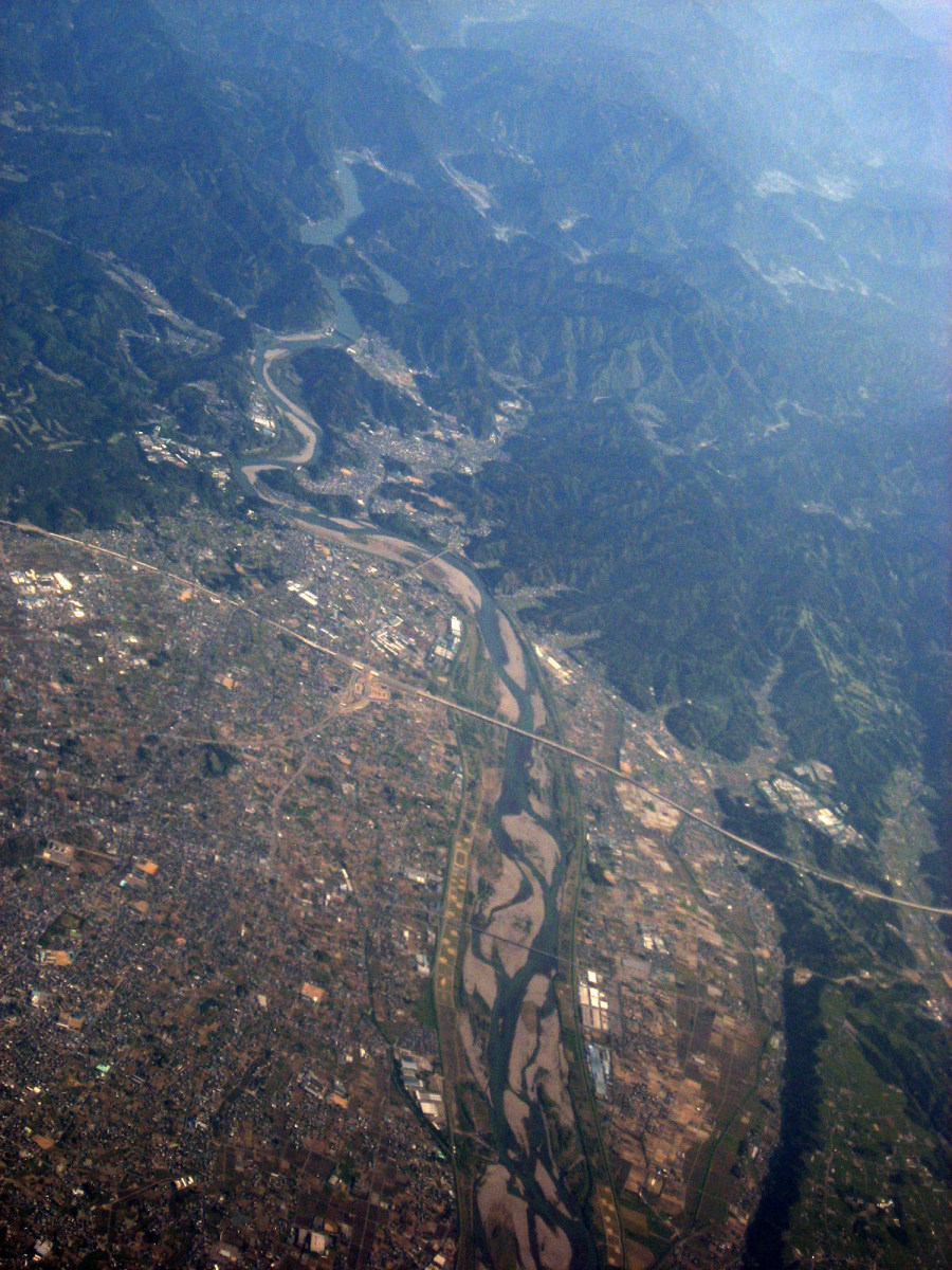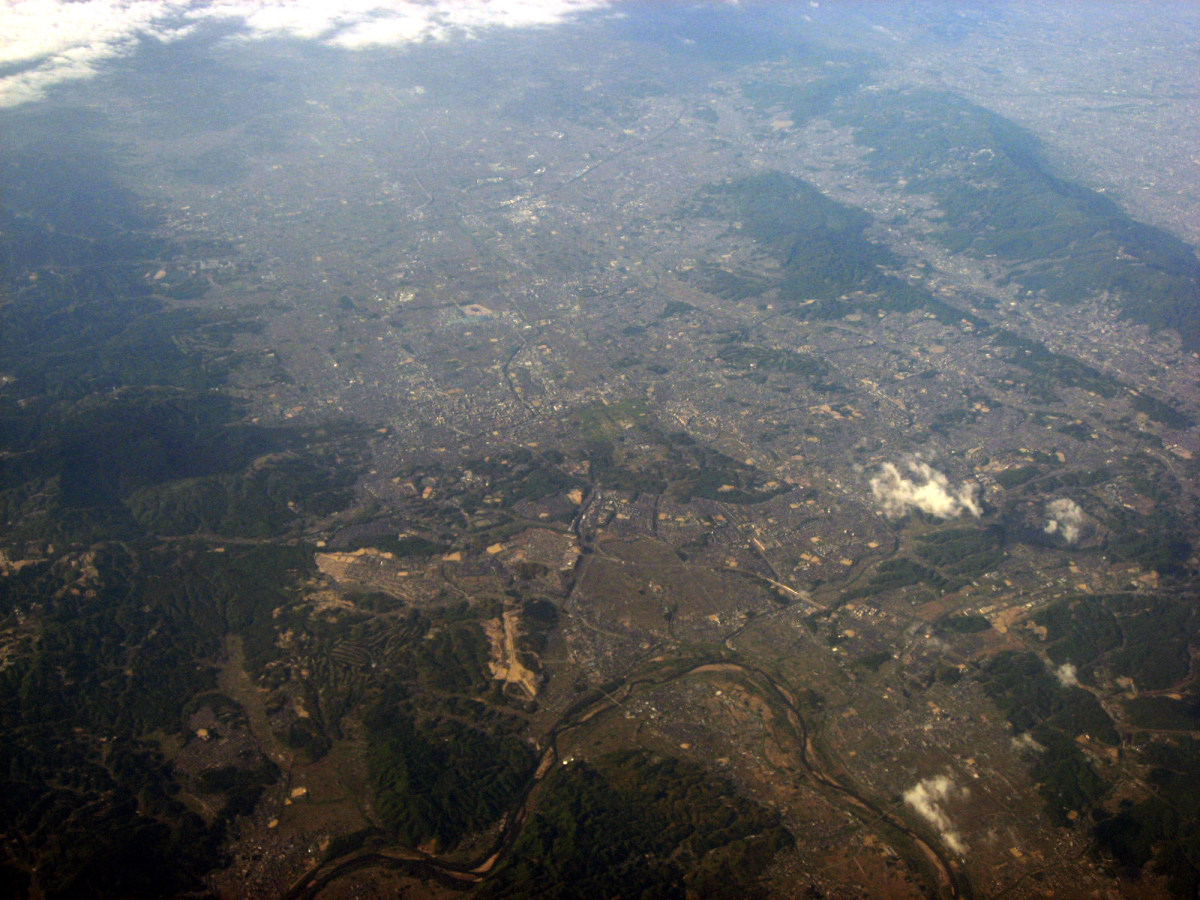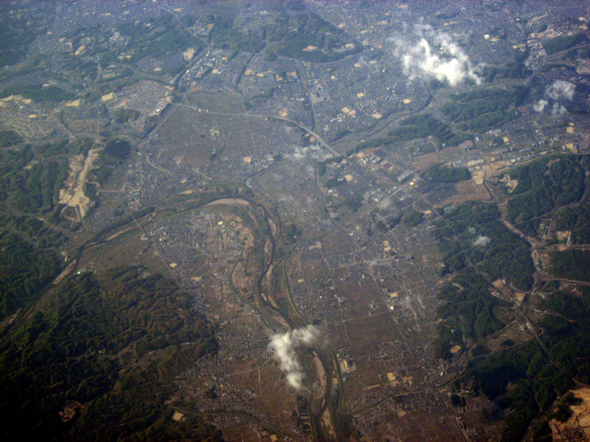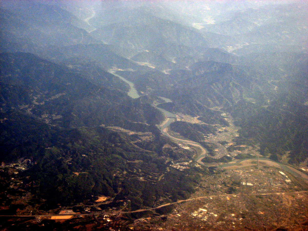 伊賀市街地上空から,南を向いて・・・木津川はこの辺りから,鈴鹿山脈に戻っていくのですね・・。