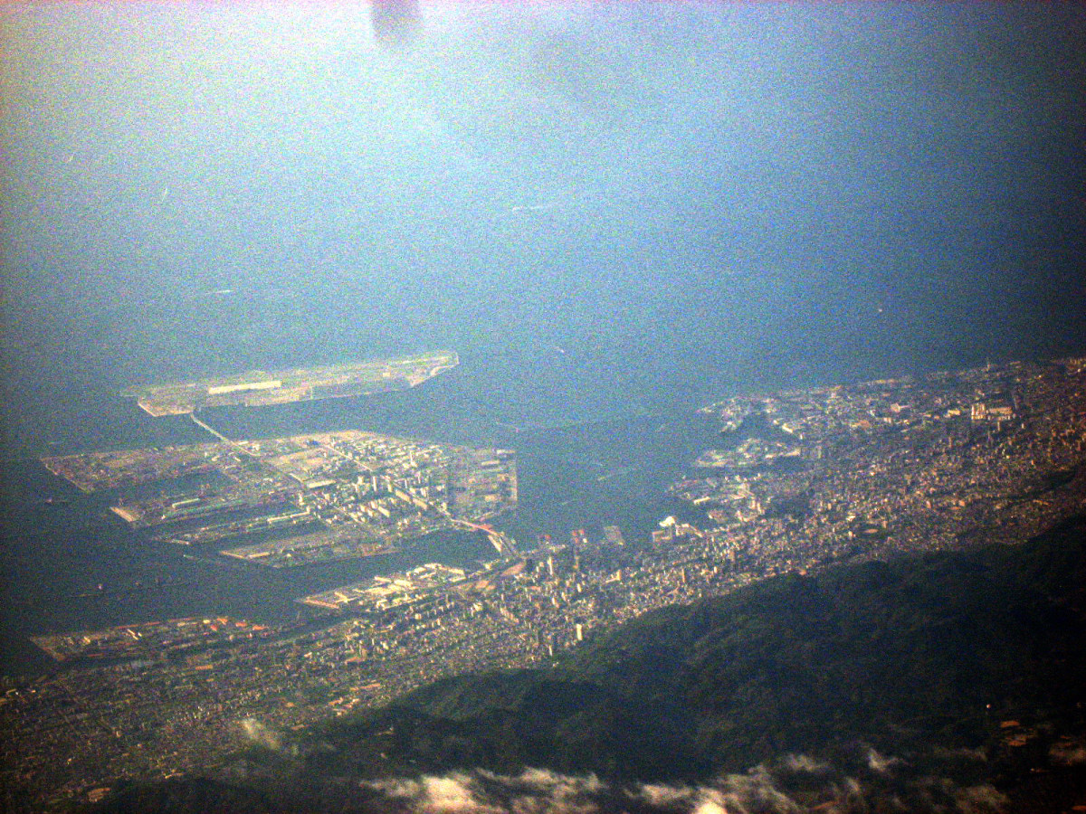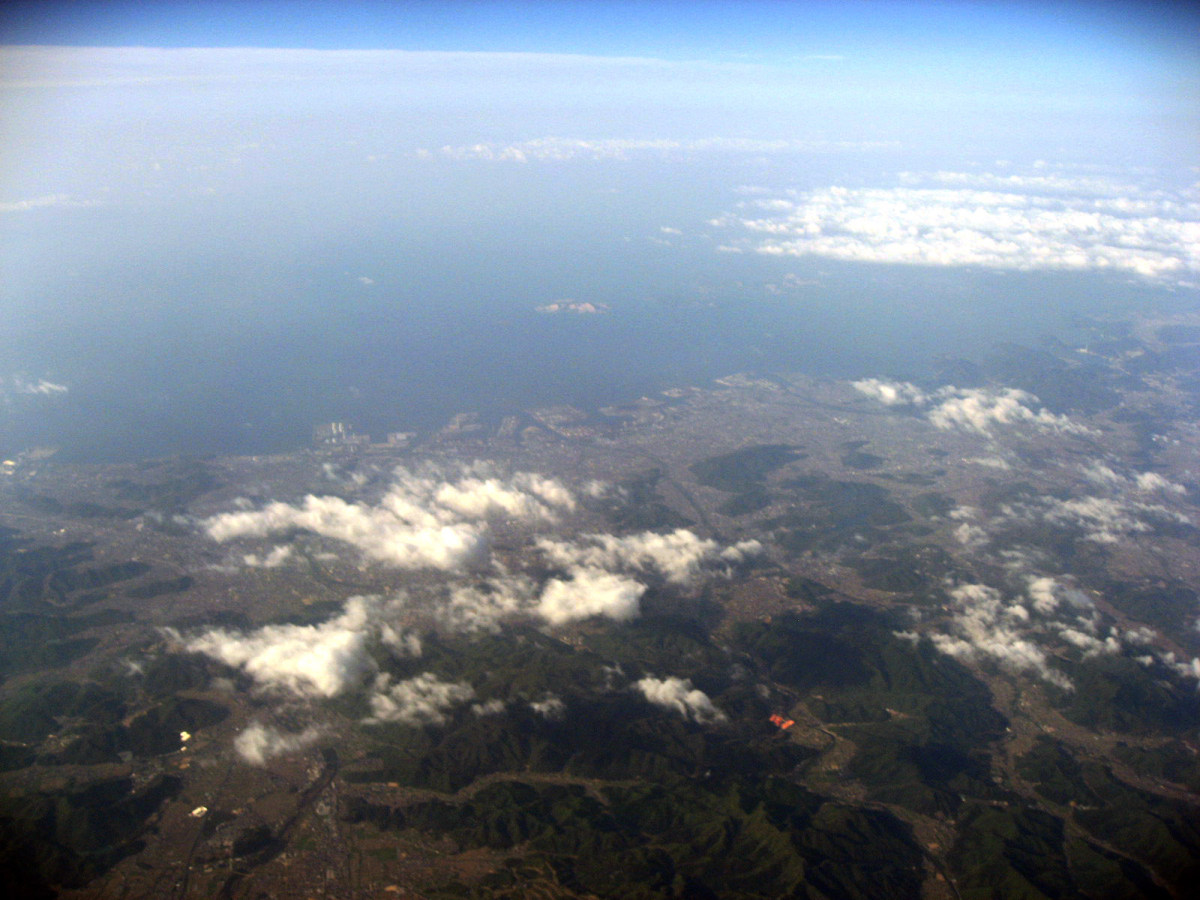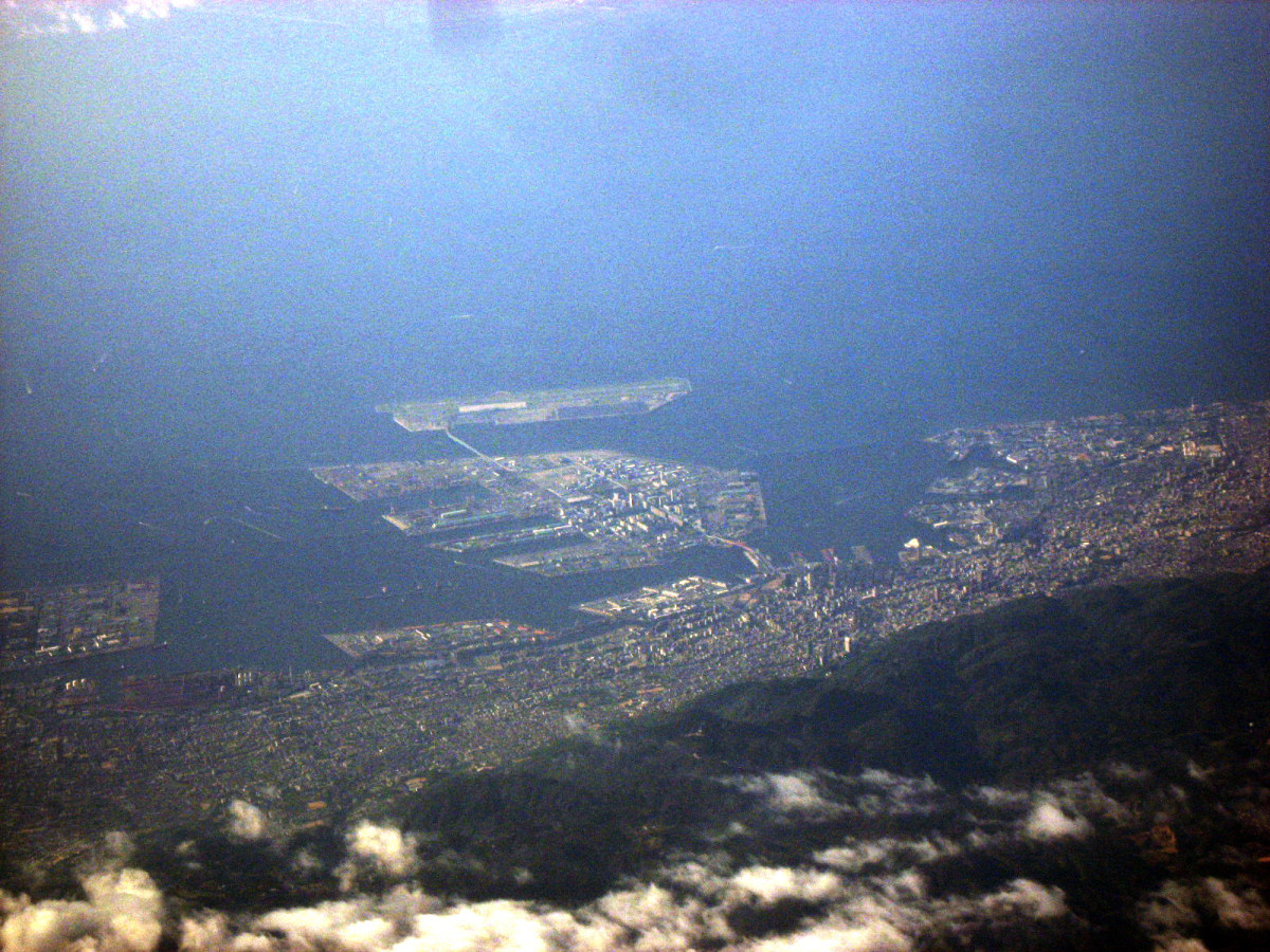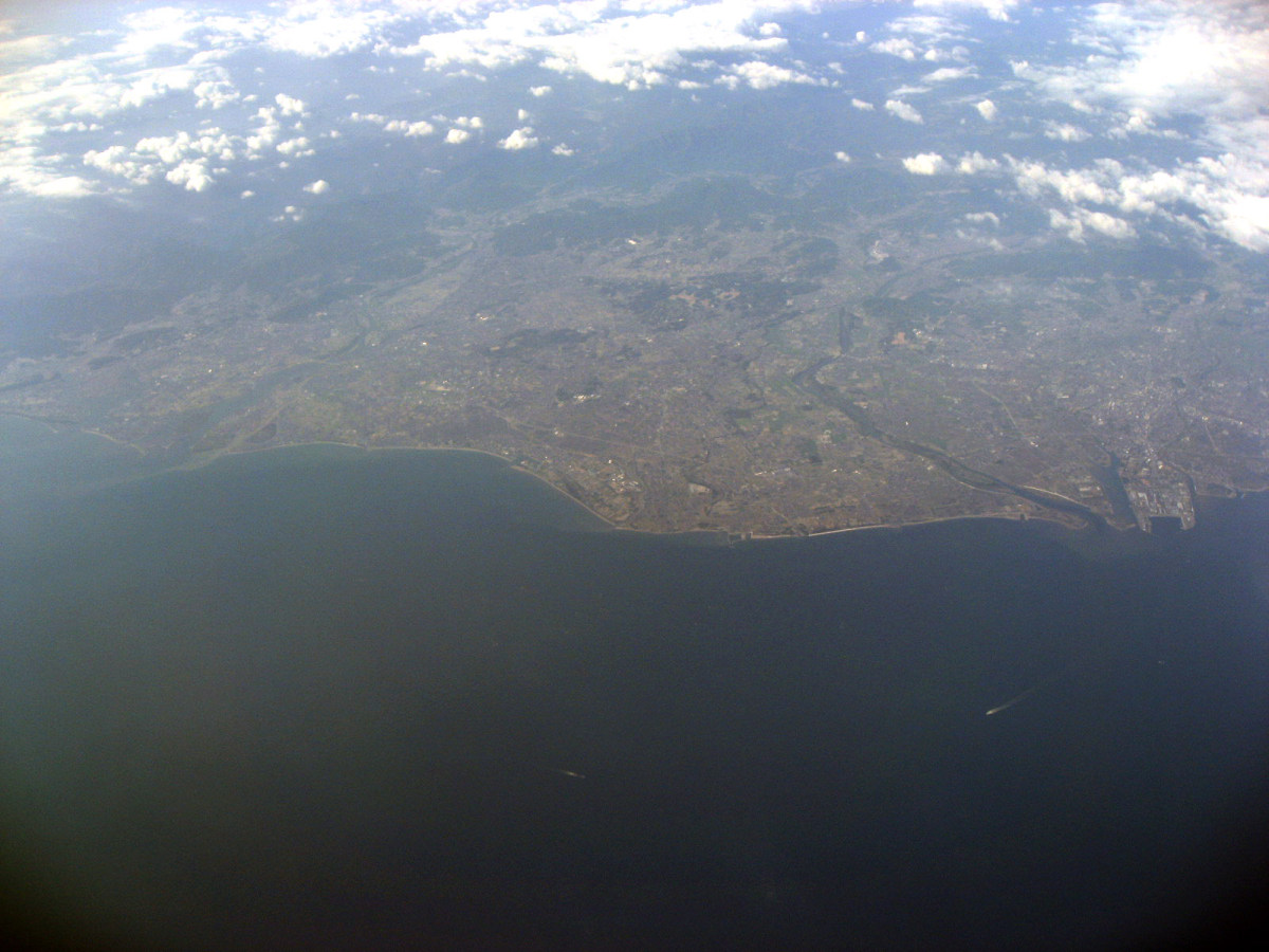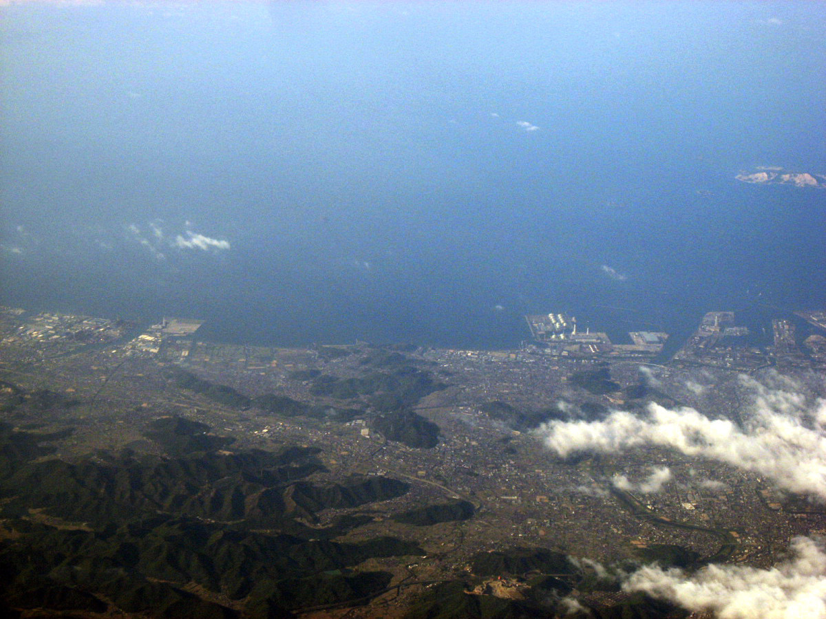 大阪湾に近づいてきました・伊丹空港がよく見えます。淀川が大きく湾に注ぎ込んでいます。