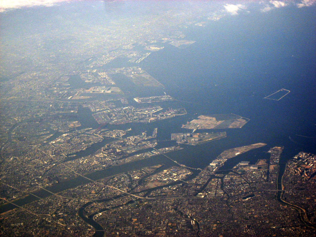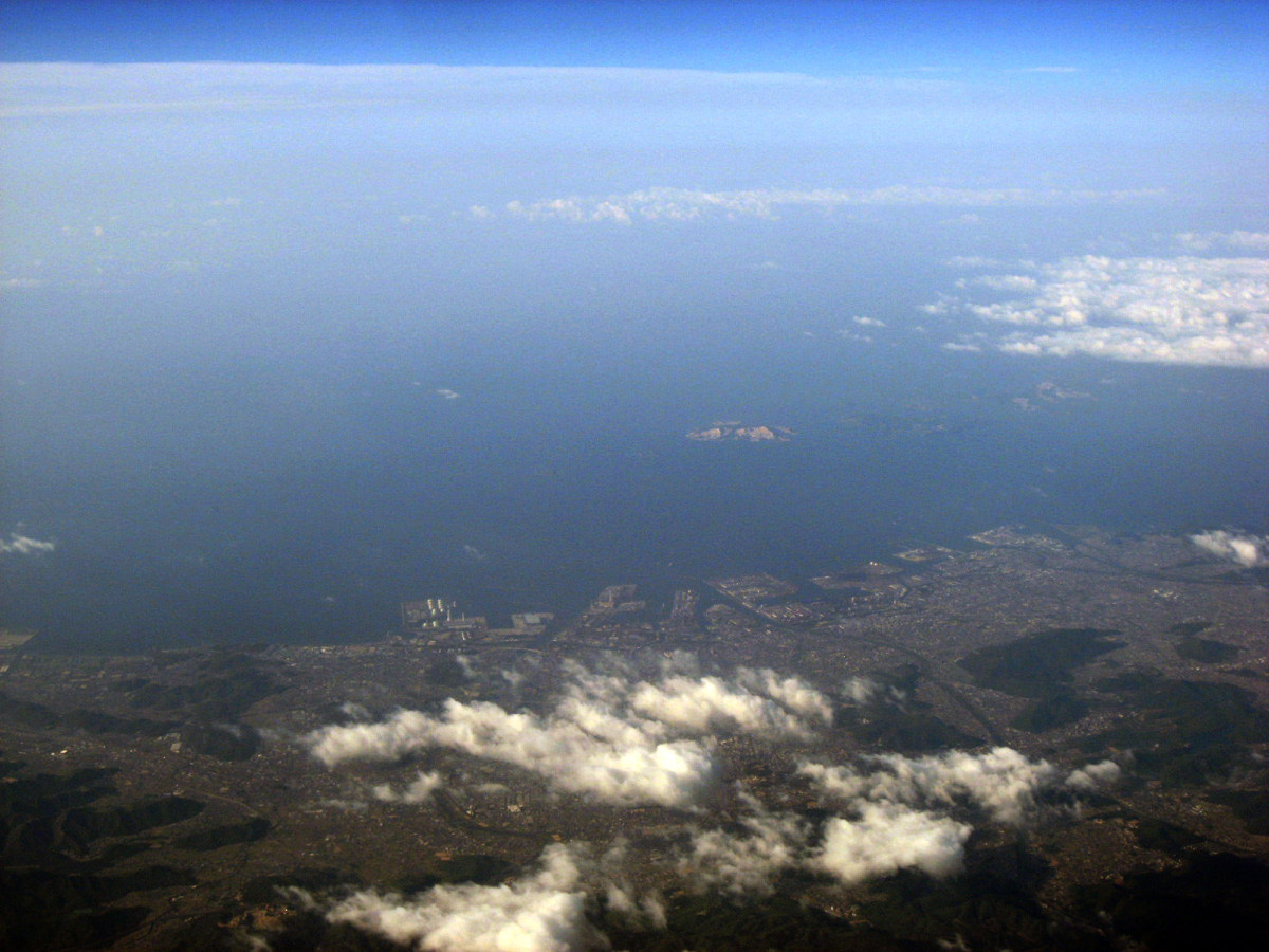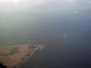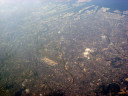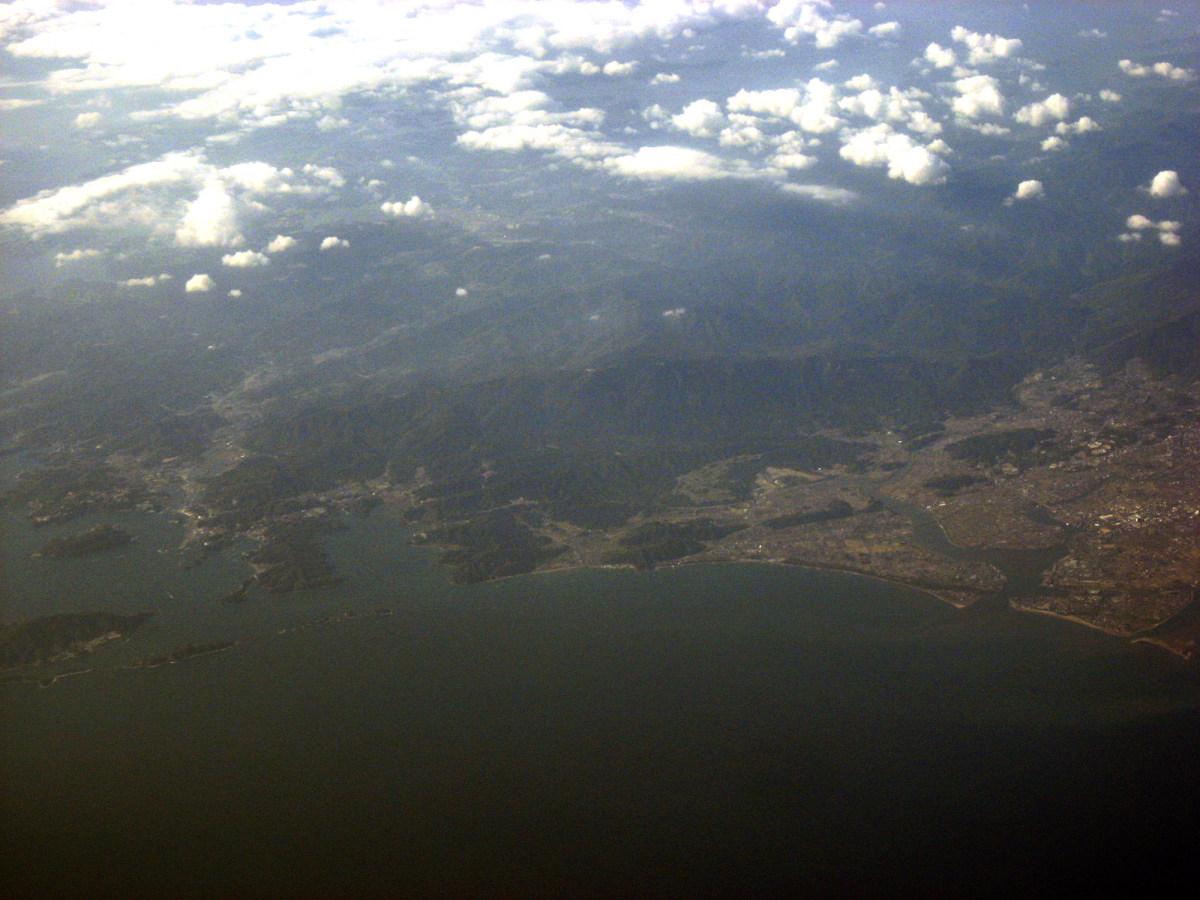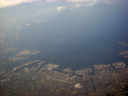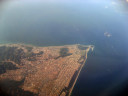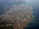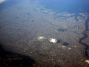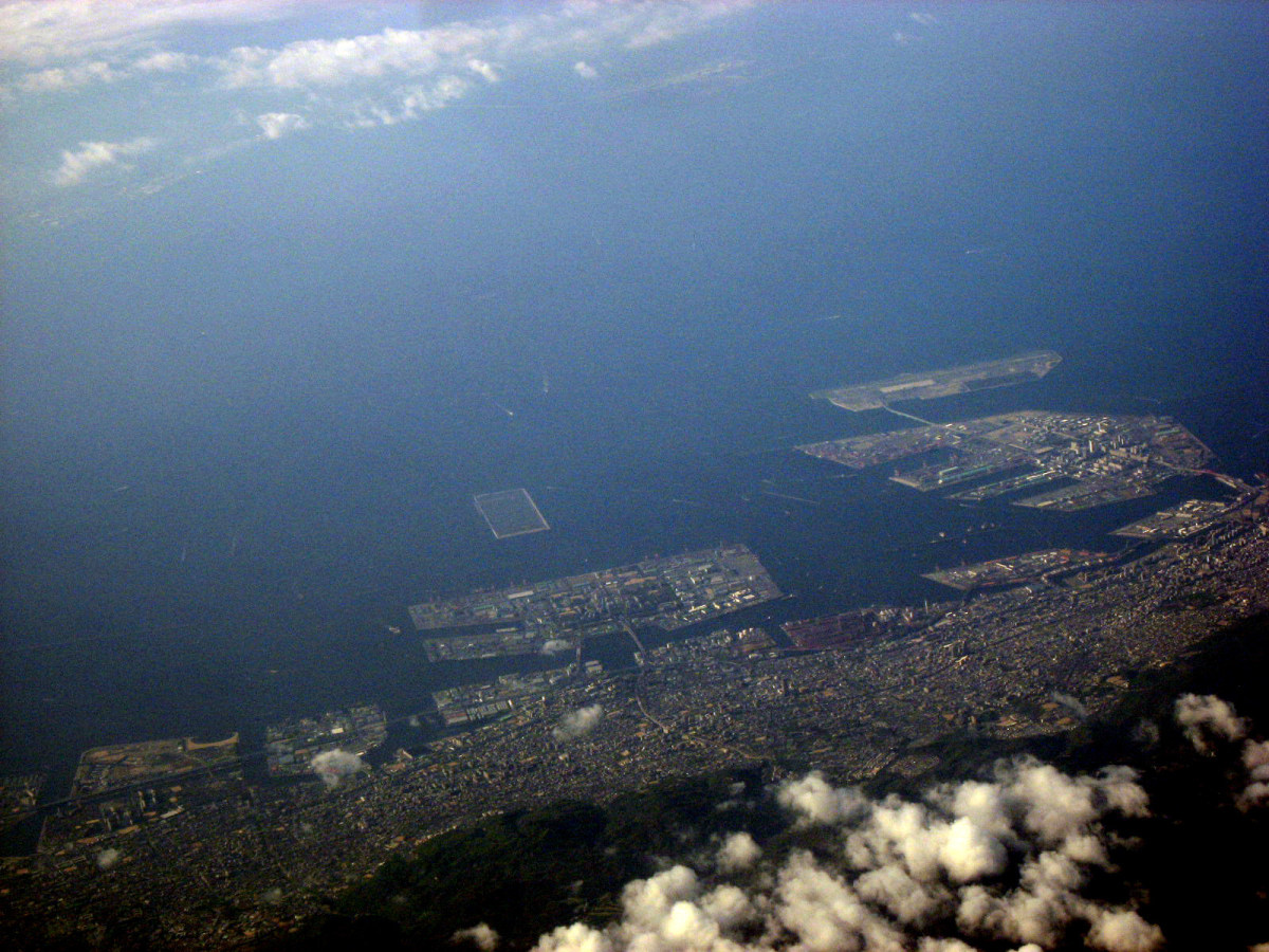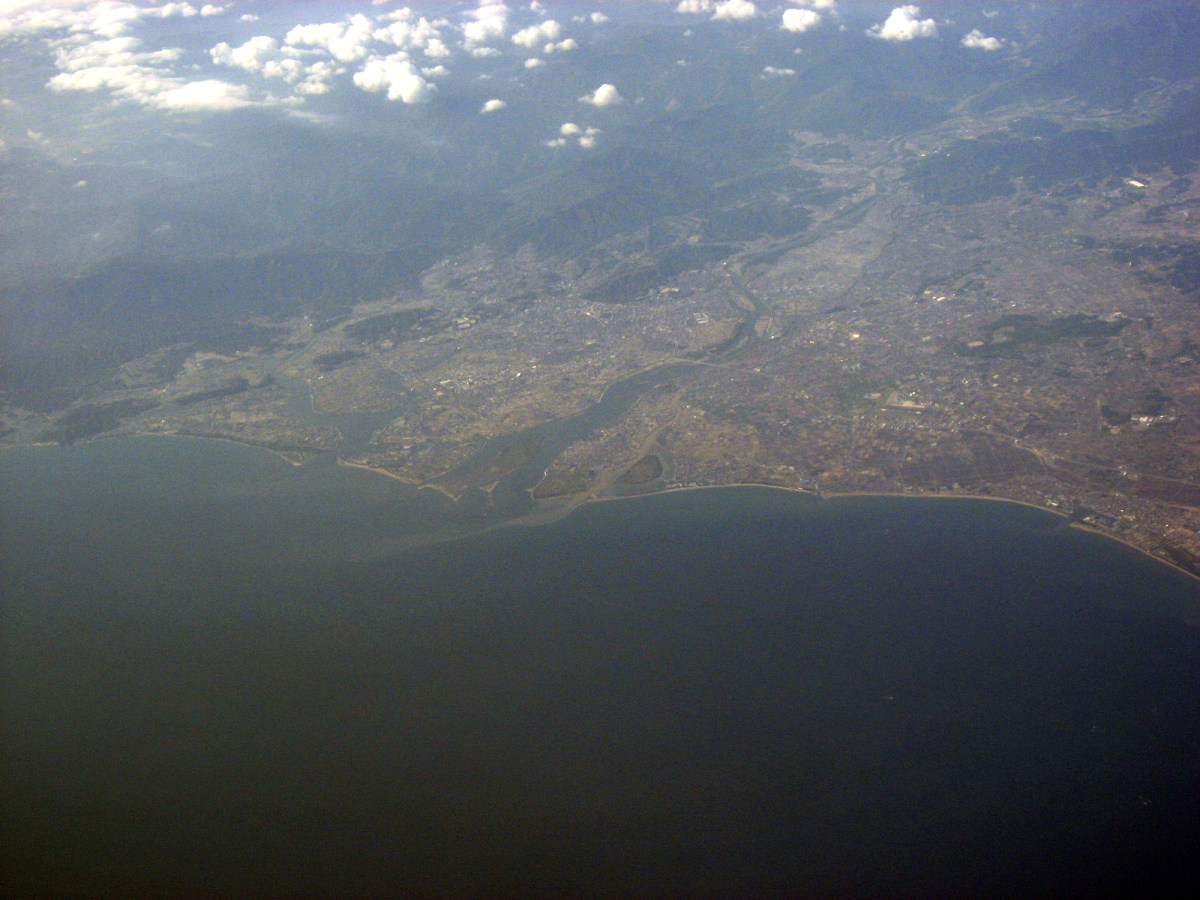 大阪湾に近づいてきました・伊丹空港がよく見えます。淀川が大きく湾に注ぎ込んでいます。