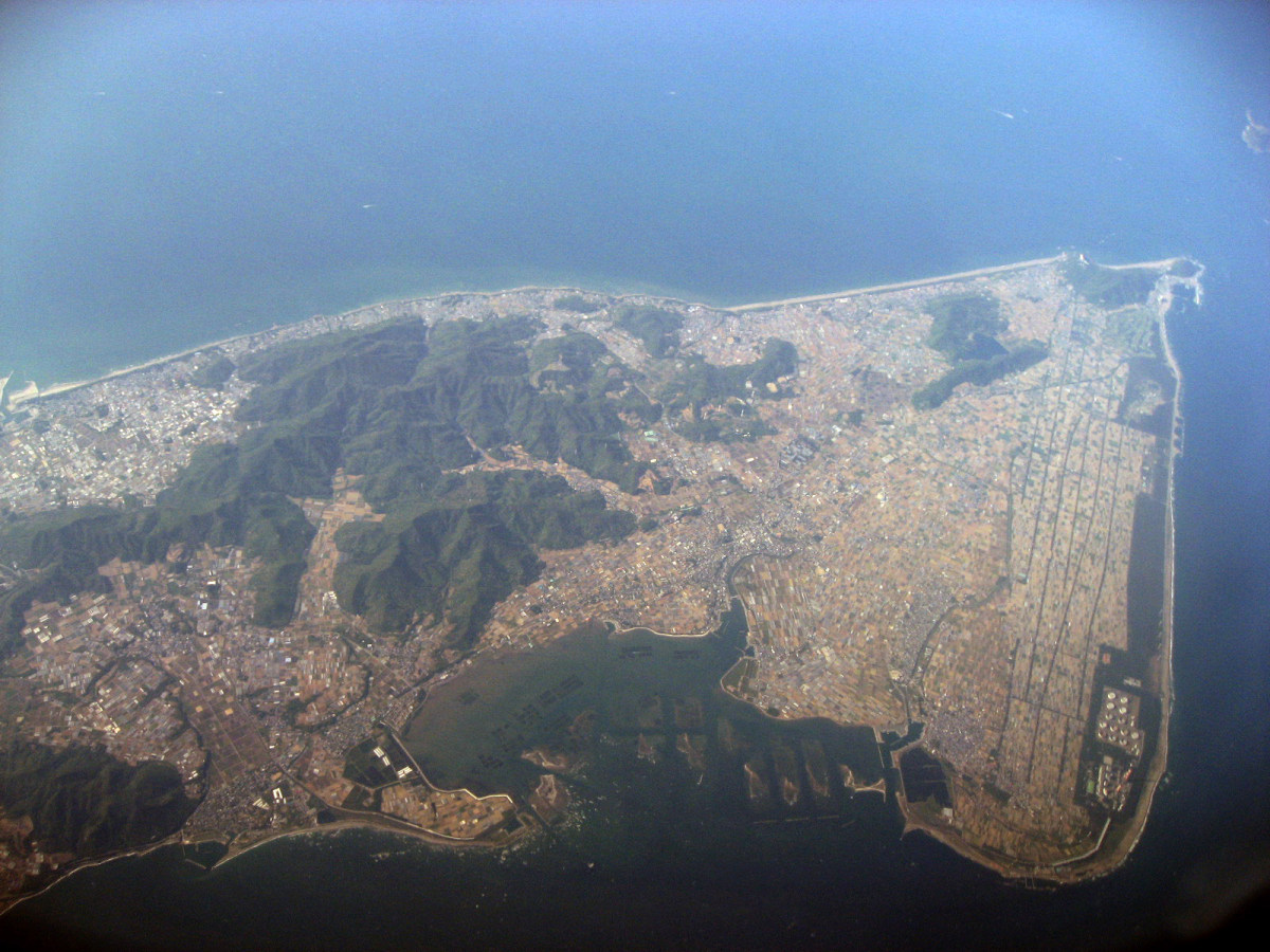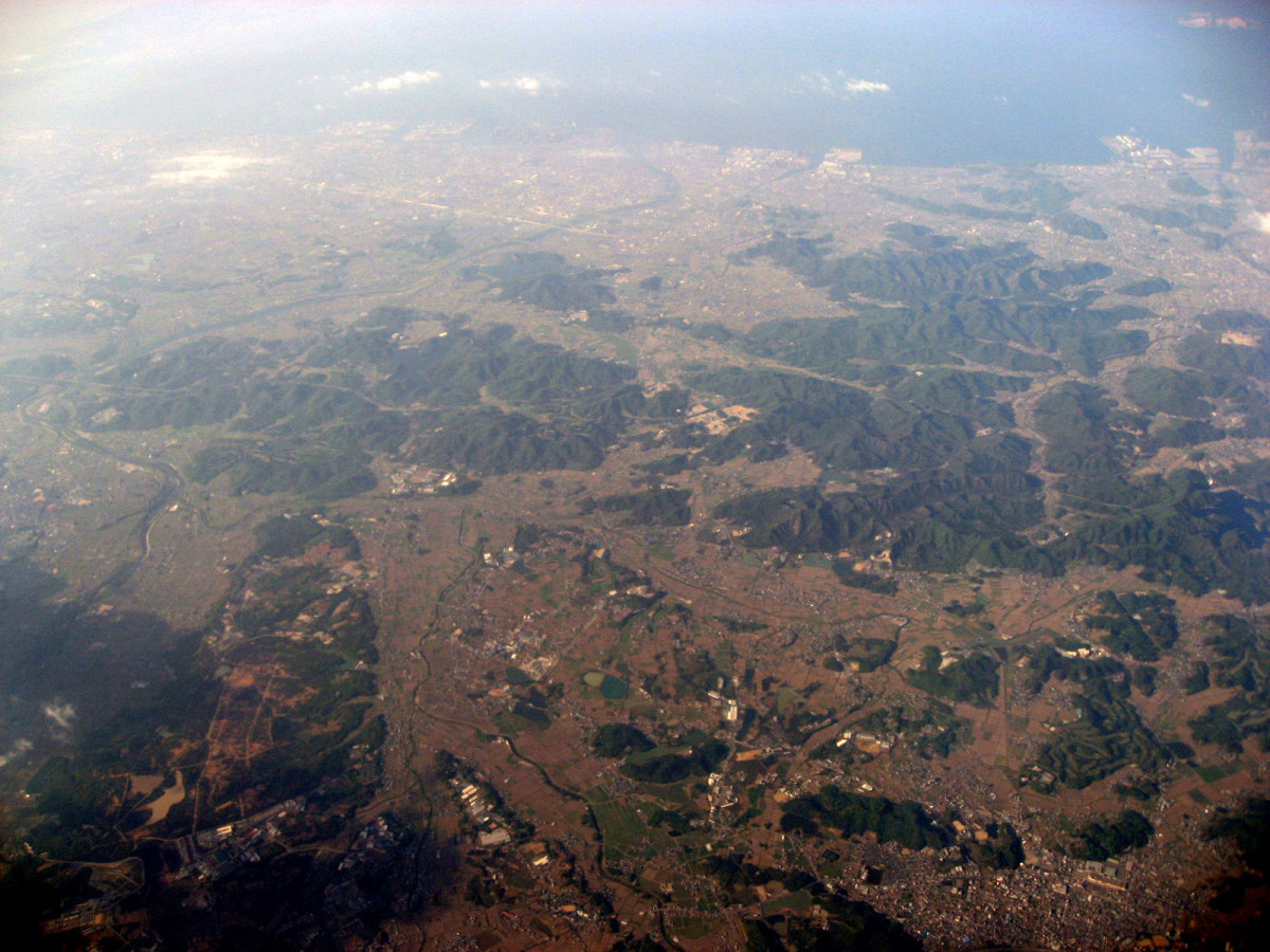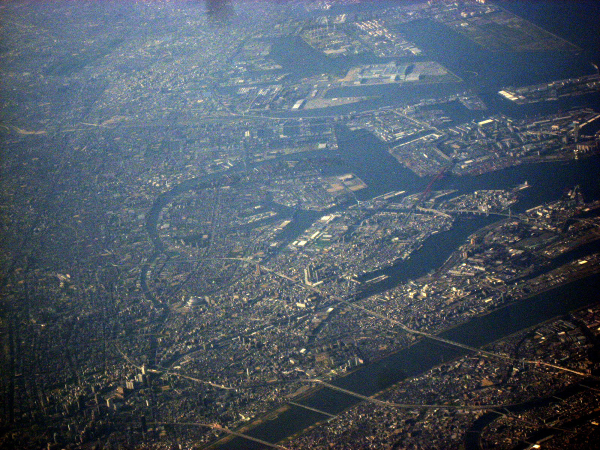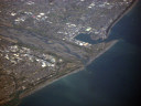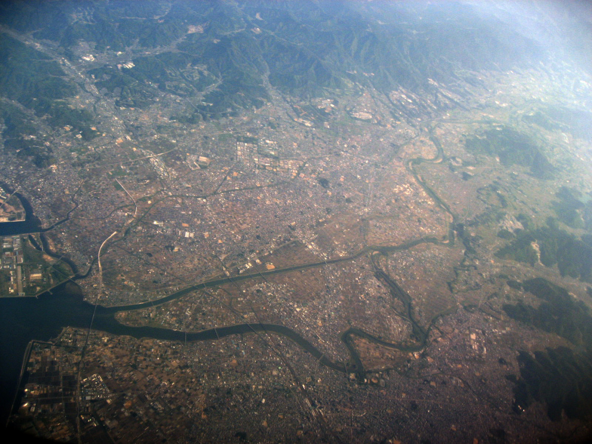 大阪湾に近づいてきました・伊丹空港がよく見えます。淀川が大きく湾に注ぎ込んでいます。