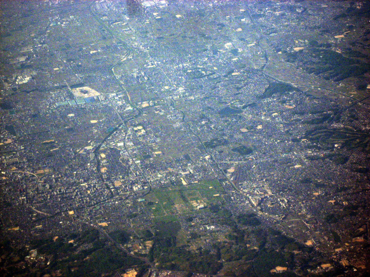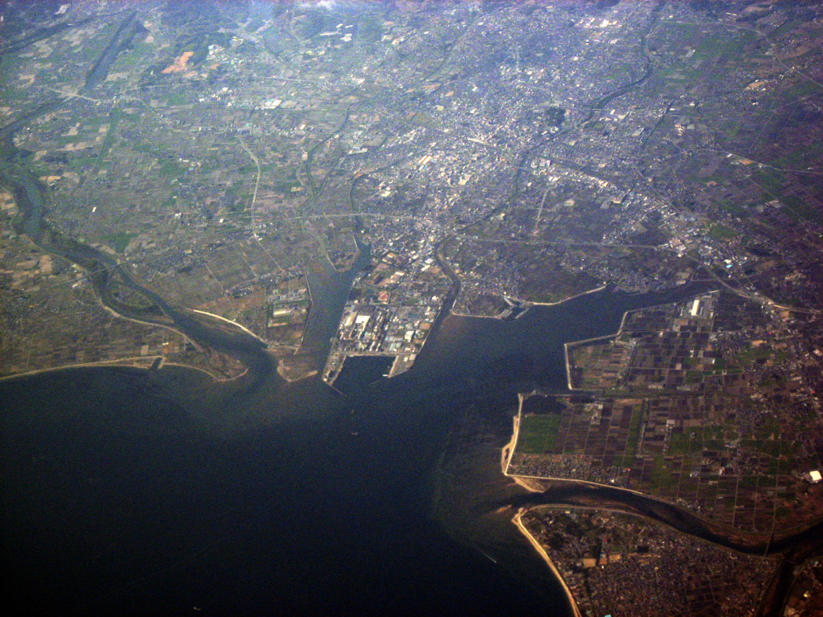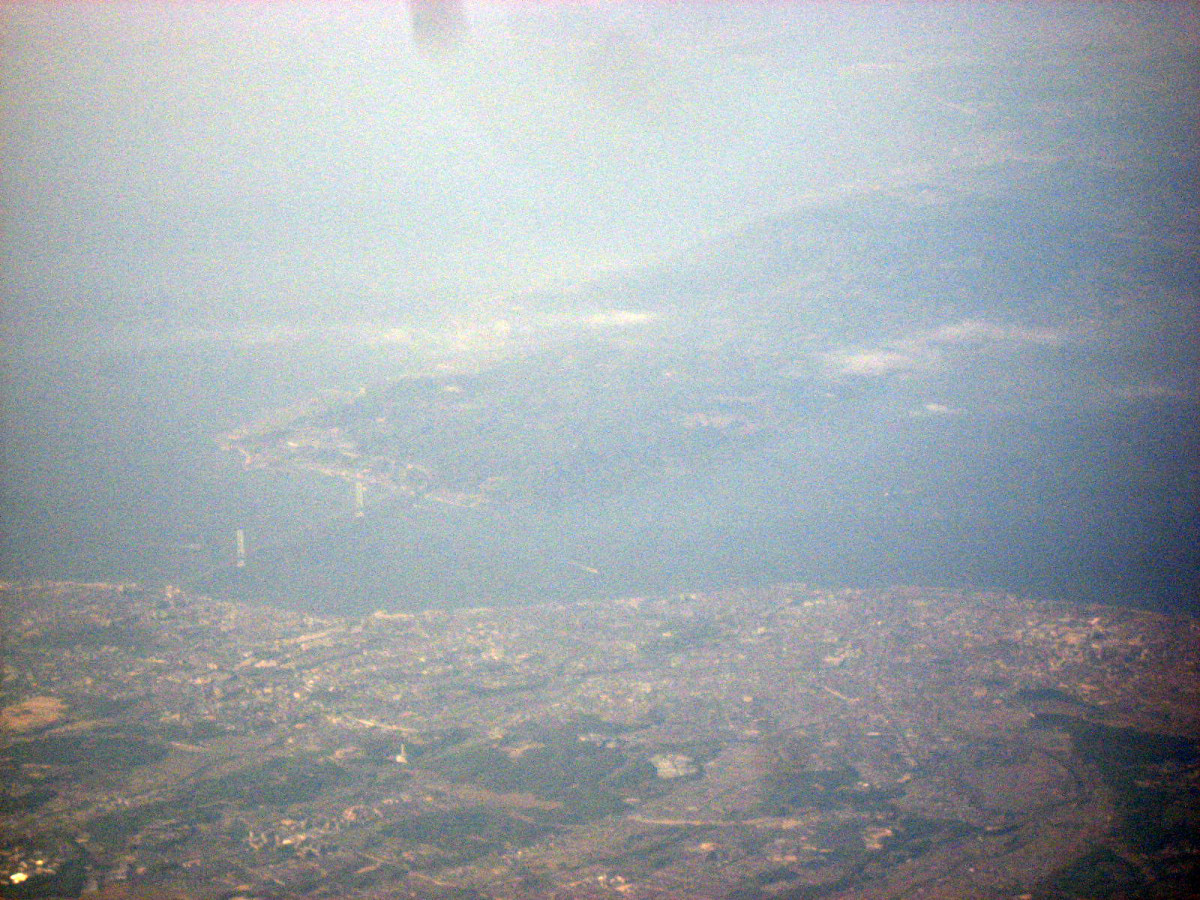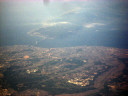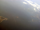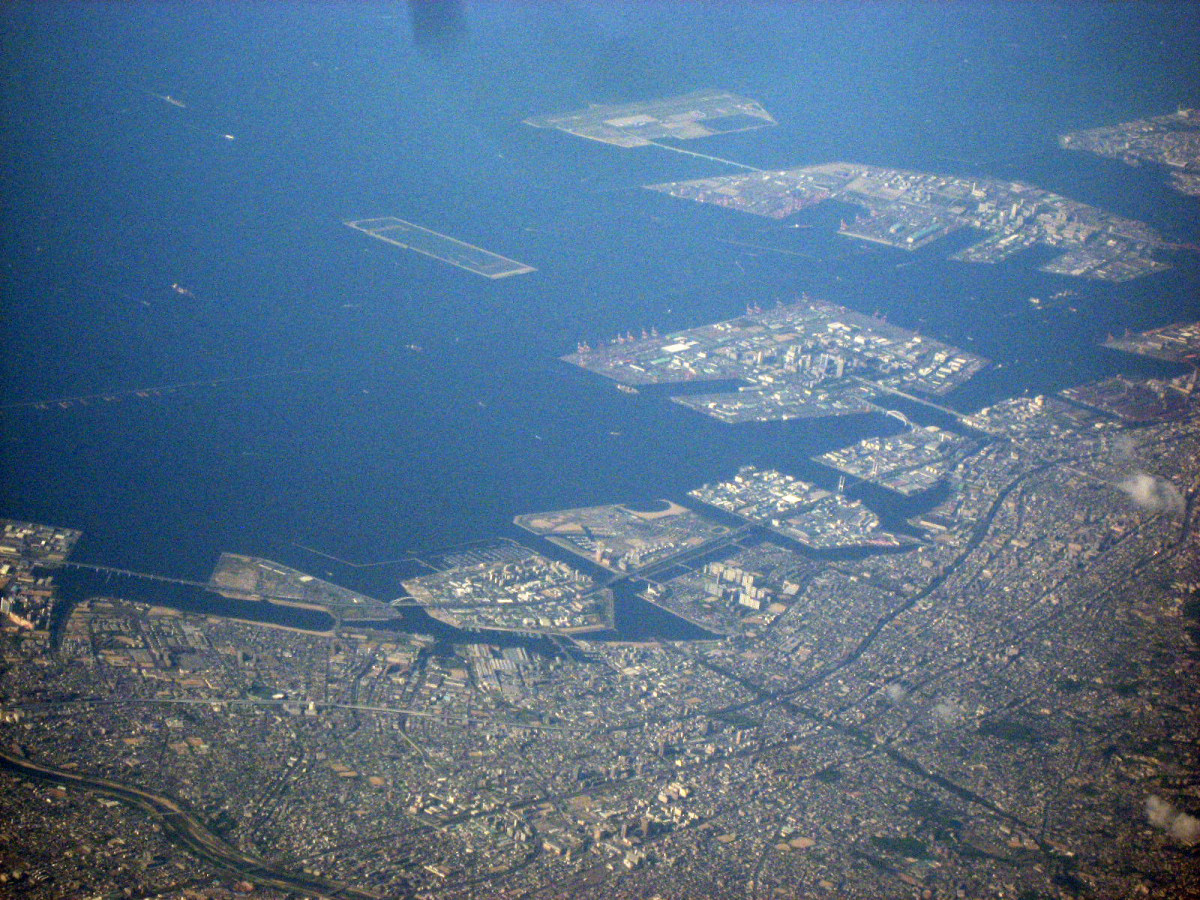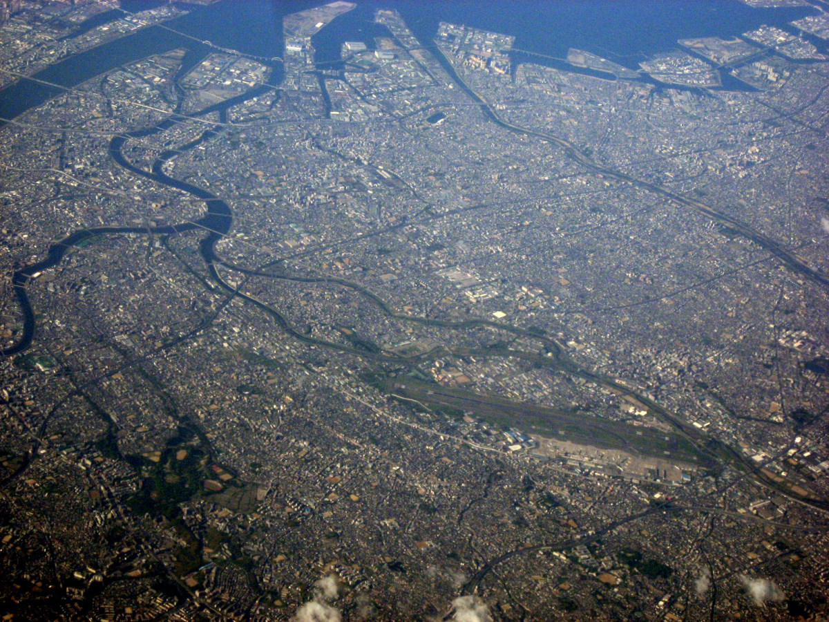 大阪湾に近づいてきました・伊丹空港がよく見えます。淀川が大きく湾に注ぎ込んでいます。