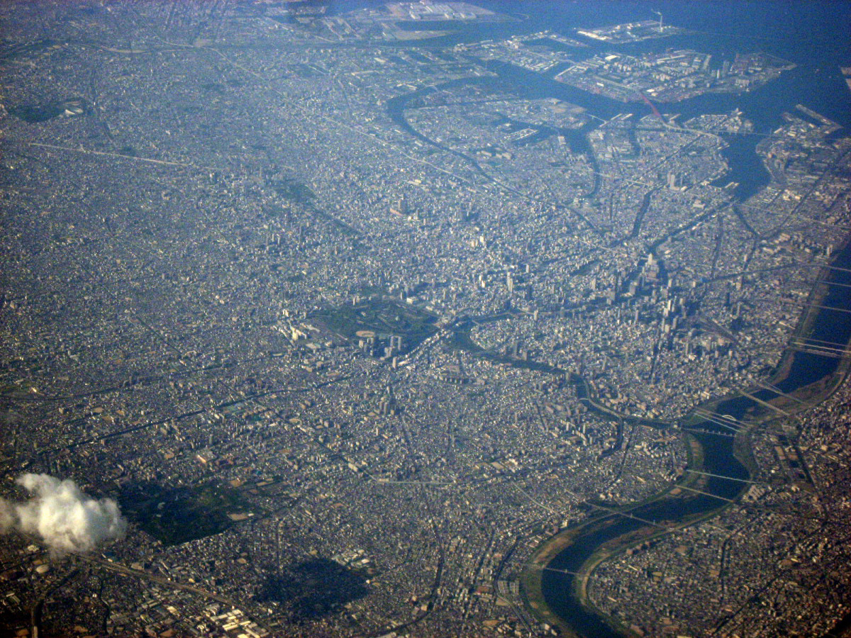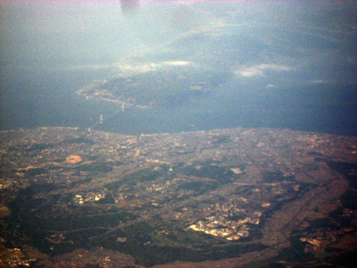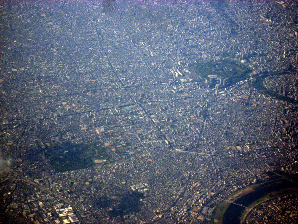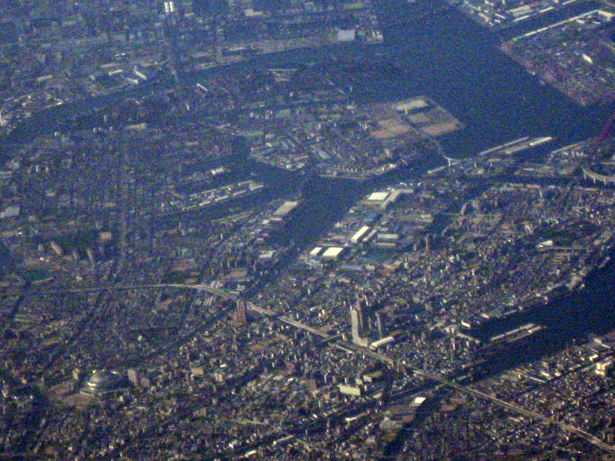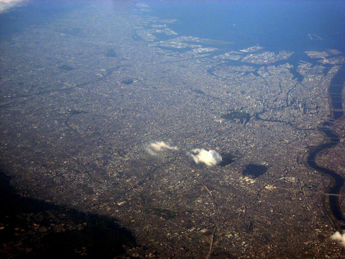 大阪湾に近づいてきました・伊丹空港がよく見えます。淀川が大きく湾に注ぎ込んでいます。