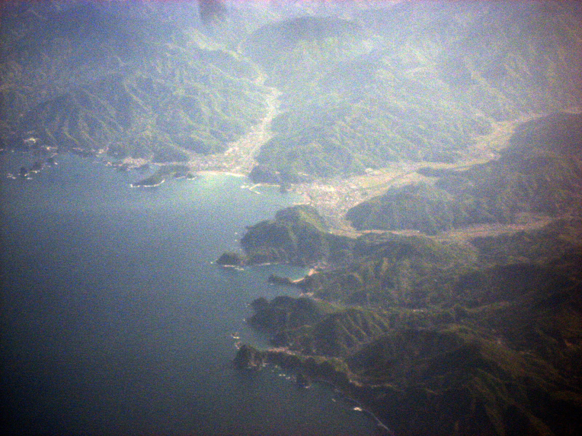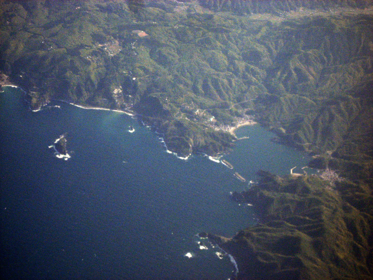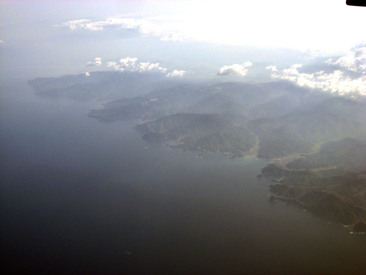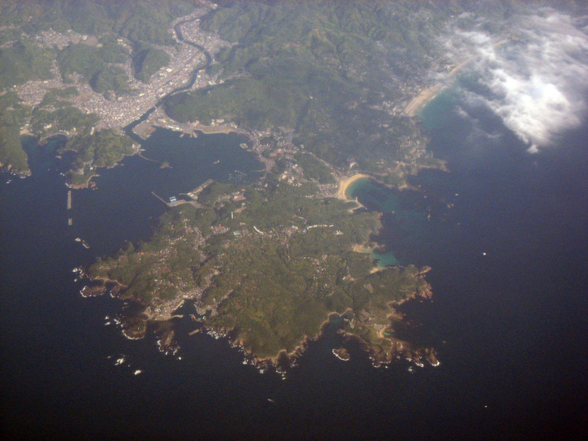 松阪湾に雲出川や櫛田川が注ぎ込むところで,伊勢湾上空です。伊勢神宮のあたりを拝んで行って・・・鳥羽です。