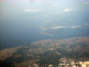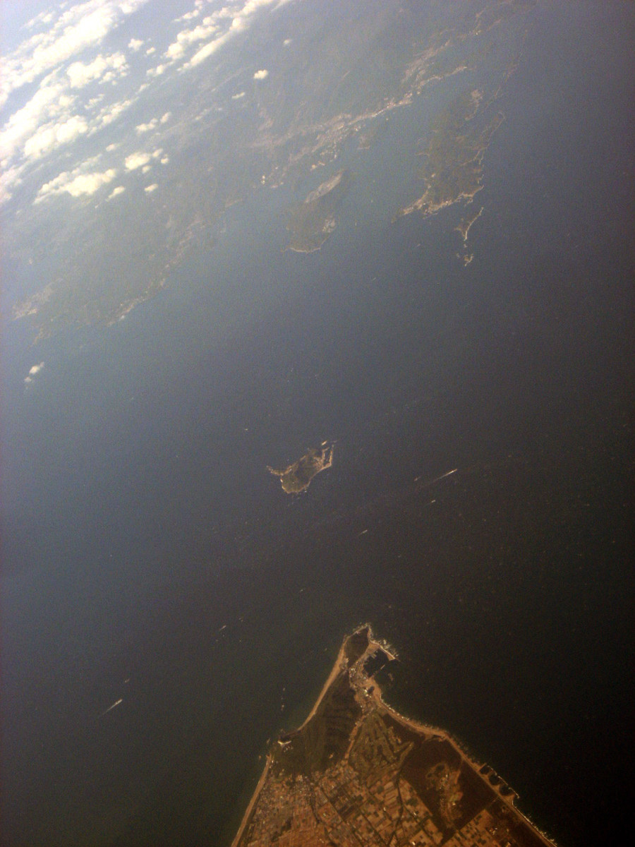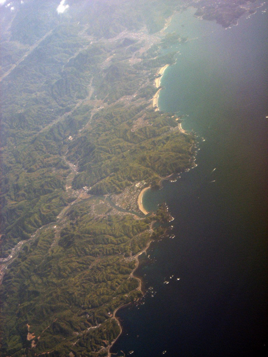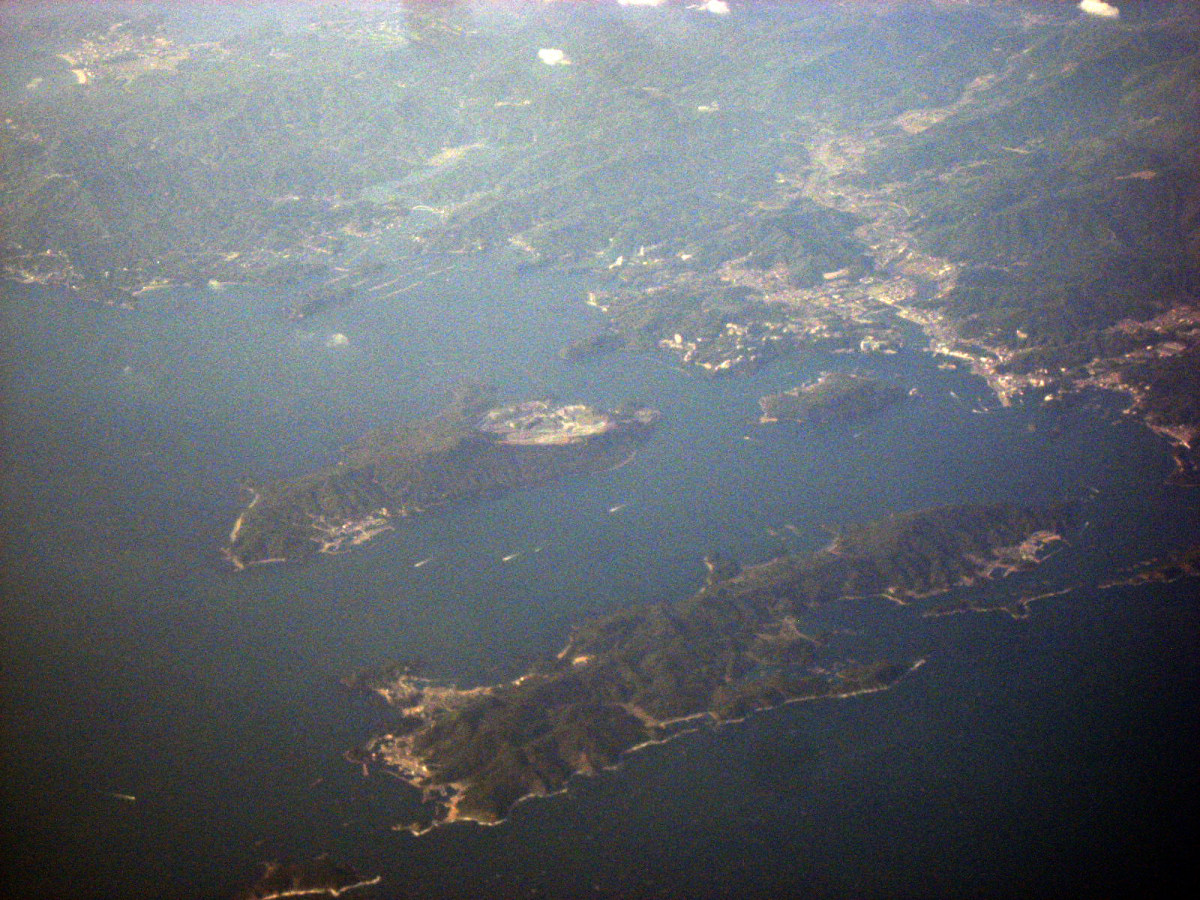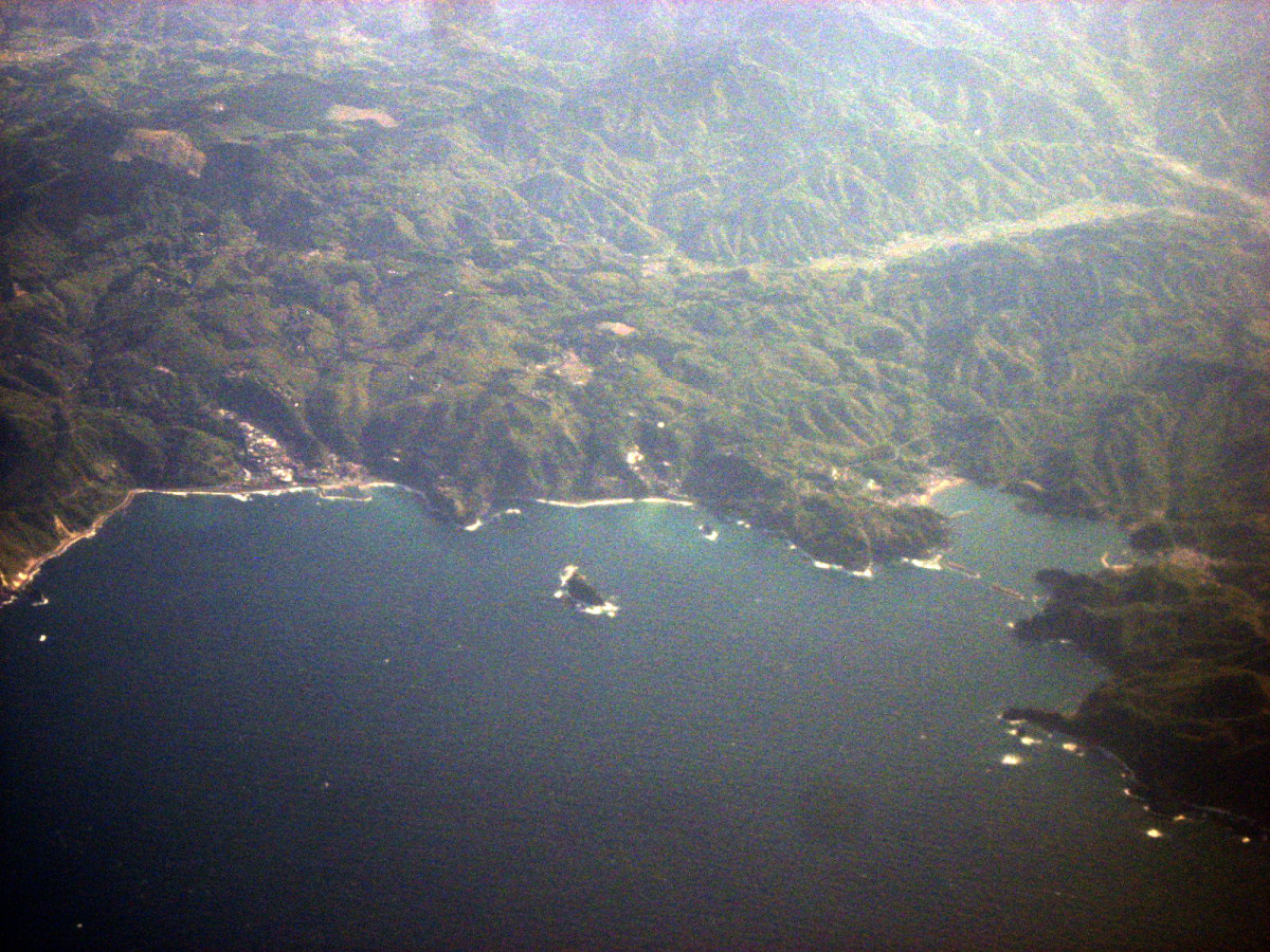 松阪湾に雲出川や櫛田川が注ぎ込むところで,伊勢湾上空です。伊勢神宮のあたりを拝んで行って・・・鳥羽です。